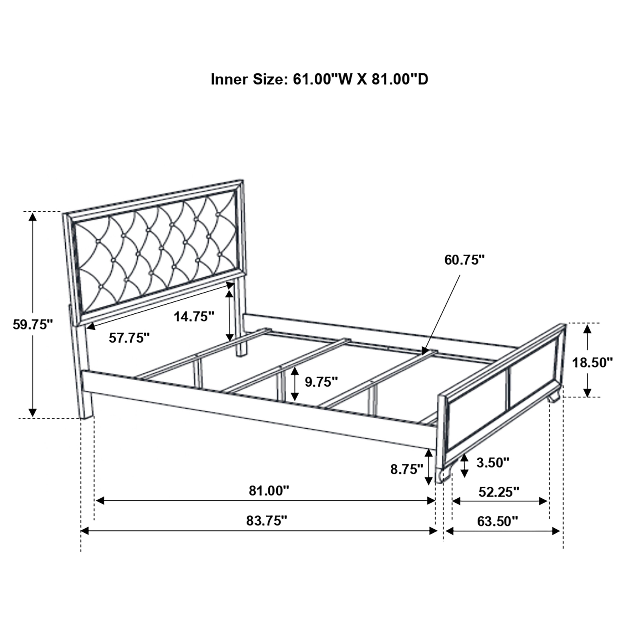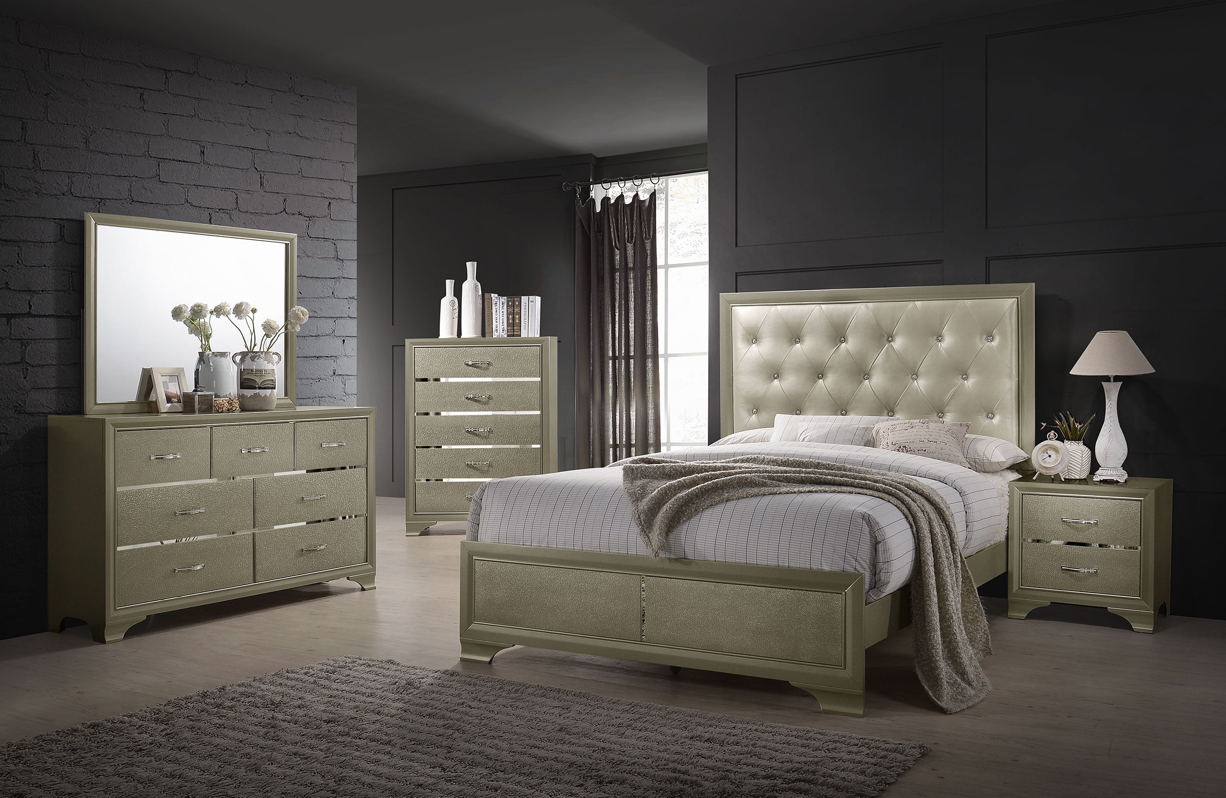 Includes: One (1) queen bed Transitional glam style imbues your bedroom with sparkling personality Champagne gold leatherette upholstered headboard is tufted with bling buttons for glittering flair and texture Faux leather upholstery Metal accents