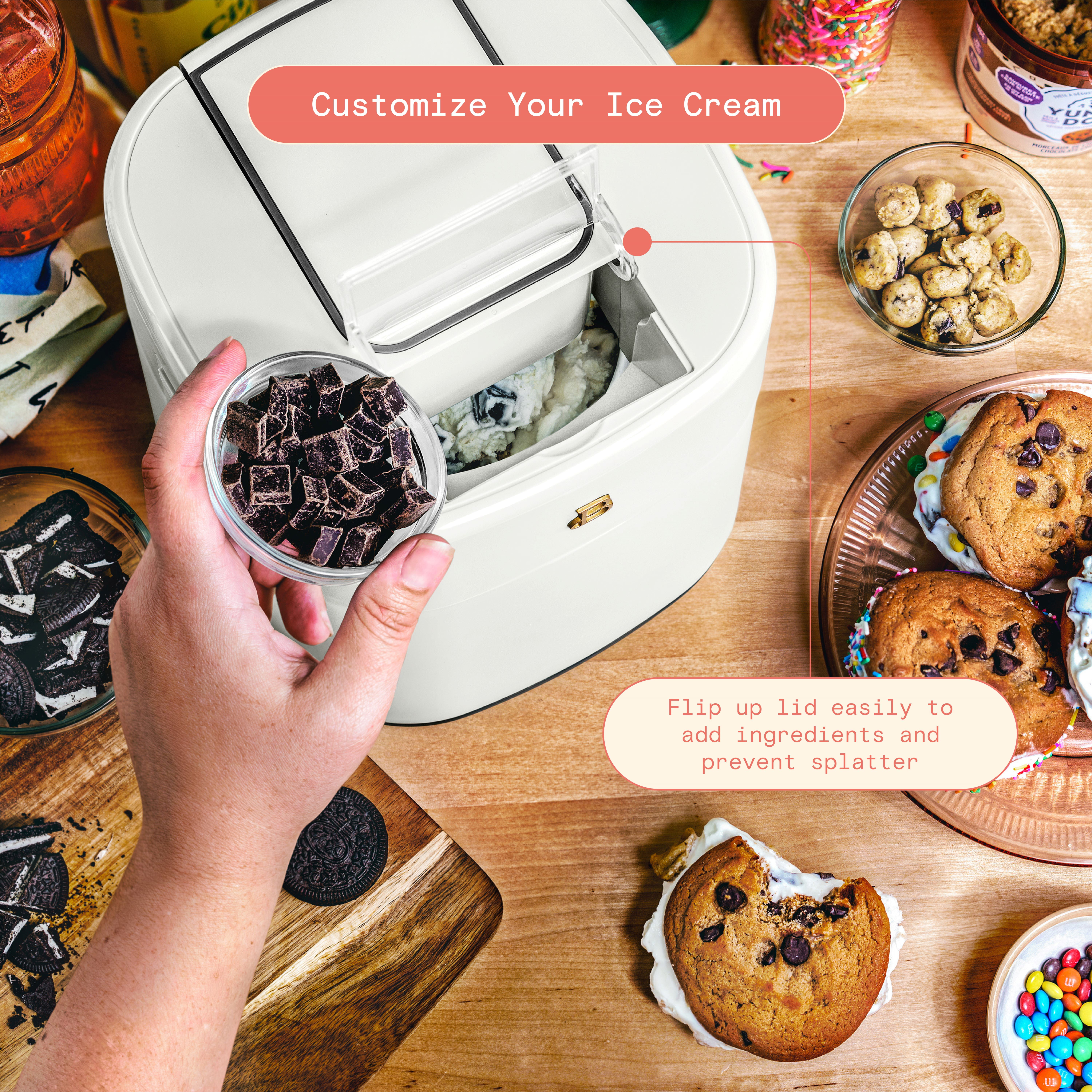 Makes delicious homemade ice cream, sorbet, gelato, or frozen yogurt Homemade frozen treats ready in 20 minutes Touchscreen display with 3 adjustable preset functions for Ice Cream, Sorbet and Gelato with digital countdown timer Flip-up lid to easily to add ingredients and prevent splatter Double-wall insulated freezing bowl, no ice needed 1.5 qt capacity makes frozen treats for the whole family Auto shut-off signal tone alerts you when your frozen treats are ready Mixing paddle automatically mixes and churns your sweet treats Includes ice cream scoop Long-lasting material with soft matte premium finish Beautiful by Drew Barrymore available exclusively at