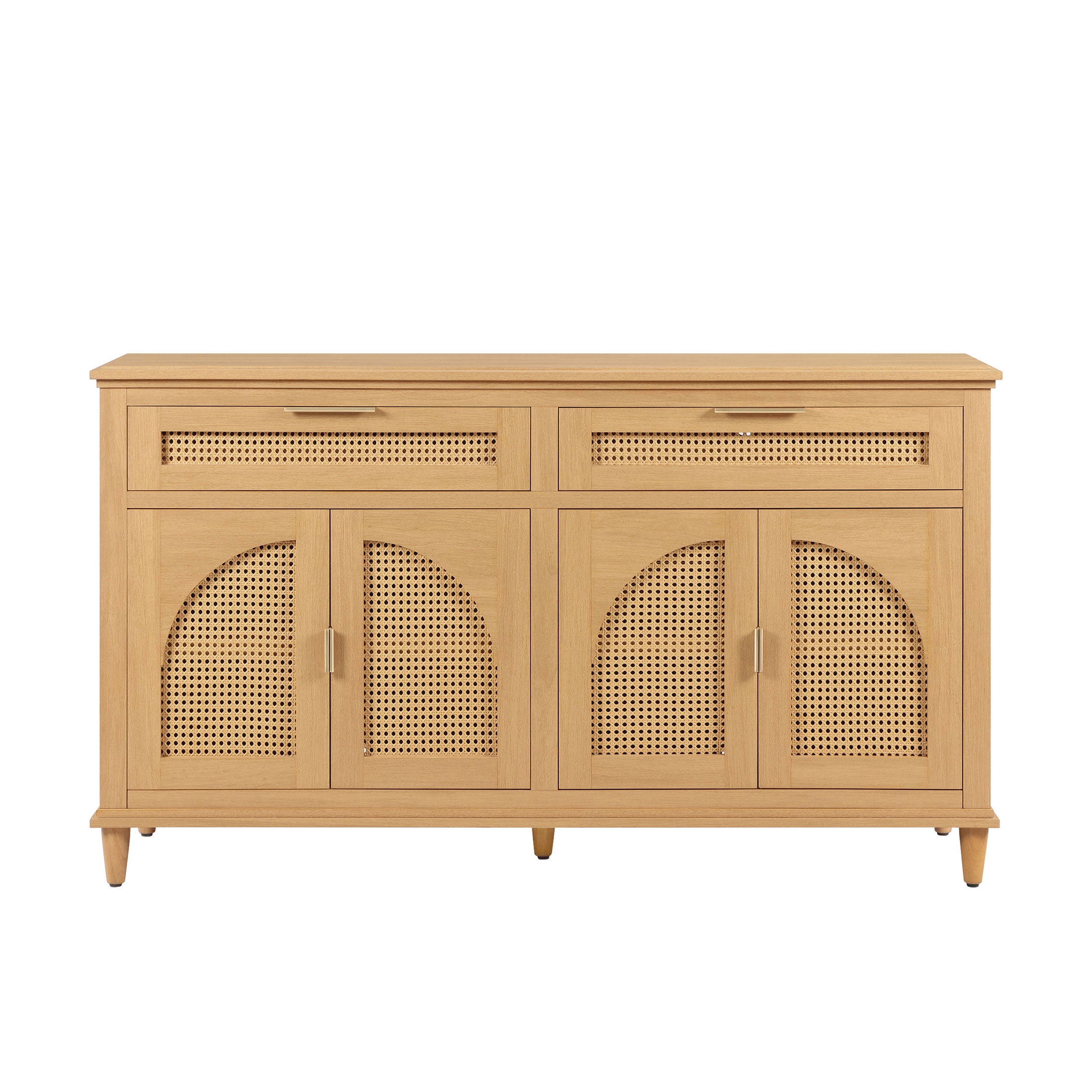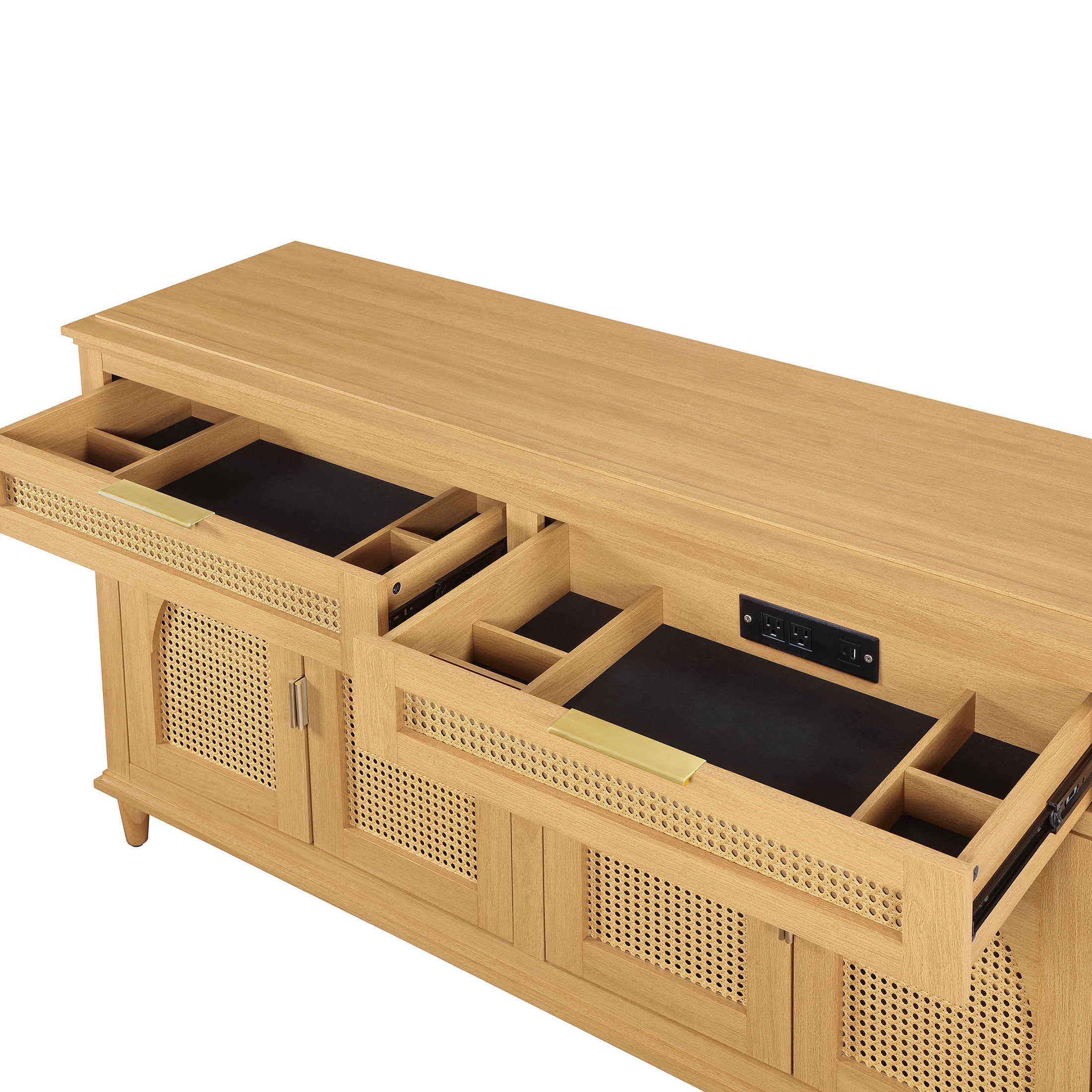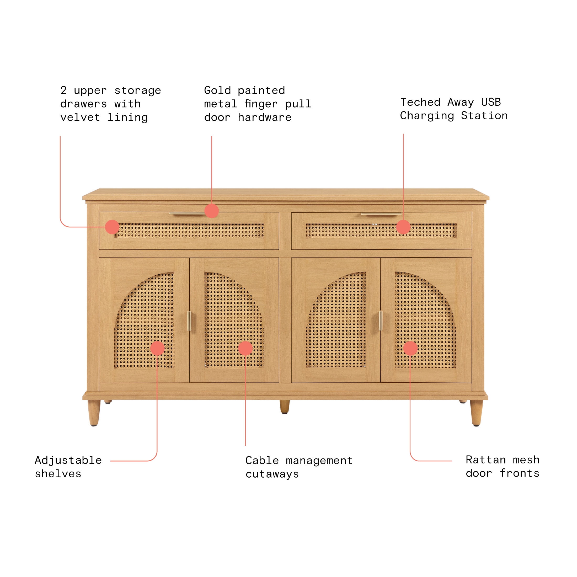 Transform your living room with the Beautiful Drew Rattan Media Console. Crafted with sturdy wood construction, this piece is available in two stunning finishes: warm honey and rich black, perfectly complementing any décor. Designed to accommodate a 70-inch TV, it boasts four spacious cabinet doors and two upper storage drawers, providing ample space to keep your media essentials organized and out of sight. The Beautiful Drew Rattan Media Console is not just about looks. Enjoy the convenience of the Teched Away built-in USB charging station to keep your devices powered up and ready to go. Adjustable shelves and velvet-lined drawers add a touch of luxury, while the gold-painted metal finger pull hardware and rattan mesh cabinet door fronts offer a chic, contemporary aesthetic. With cable cutaways, you can keep all your cords neatly managed, maintaining a clean, clutter-free space. Ideal for families, homeowners, and even renters, this TV console is the perfect blend of style, functionality, and modern design. Pair the Drew Rattan Media Console with other items from the Beautiful by Drew Barrymore Furniture collection to complete your living room (sold separately).