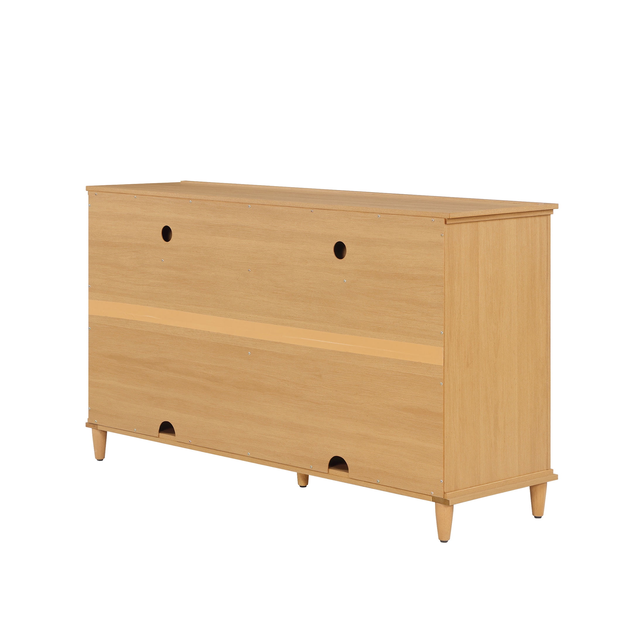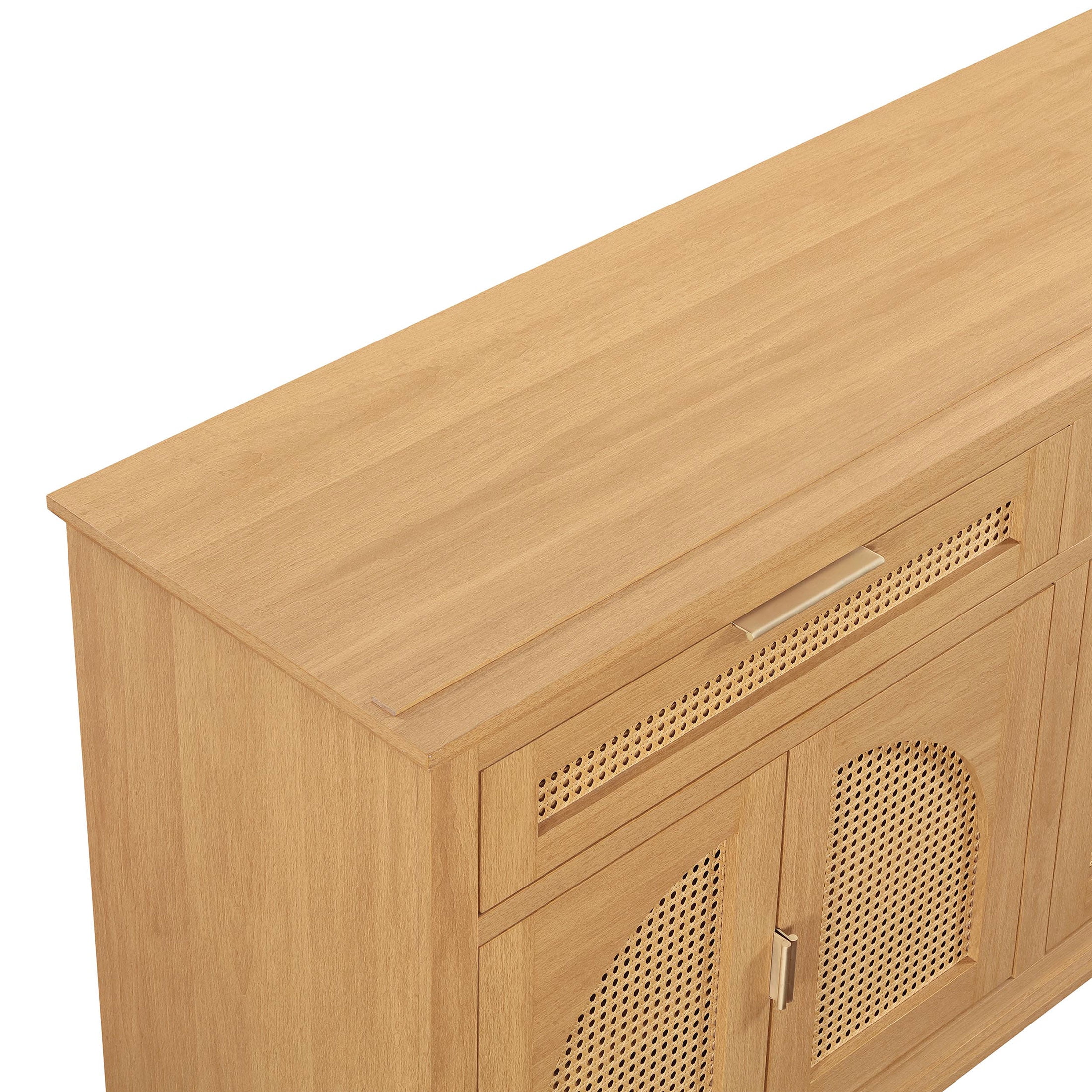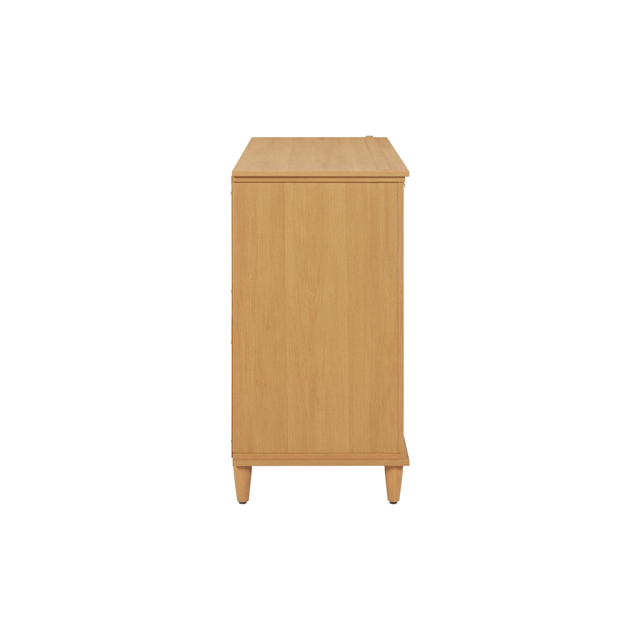 Transform your living room with the Beautiful Drew Rattan Media Console. Crafted with sturdy wood construction, this piece is available in two stunning finishes: warm honey and rich black, perfectly complementing any décor. Designed to accommodate a 70-inch TV, it boasts four spacious cabinet doors and two upper storage drawers, providing ample space to keep your media essentials organized and out of sight. The Beautiful Drew Rattan Media Console is not just about looks. Enjoy the convenience of the Teched Away built-in USB charging station to keep your devices powered up and ready to go. Adjustable shelves and velvet-lined drawers add a touch of luxury, while the gold-painted metal finger pull hardware and rattan mesh cabinet door fronts offer a chic, contemporary aesthetic. With cable cutaways, you can keep all your cords neatly managed, maintaining a clean, clutter-free space. Ideal for families, homeowners, and even renters, this TV console is the perfect blend of style, functionality, and modern design. Pair the Drew Rattan Media Console with other items from the Beautiful by Drew Barrymore Furniture collection to complete your living room (sold separately).