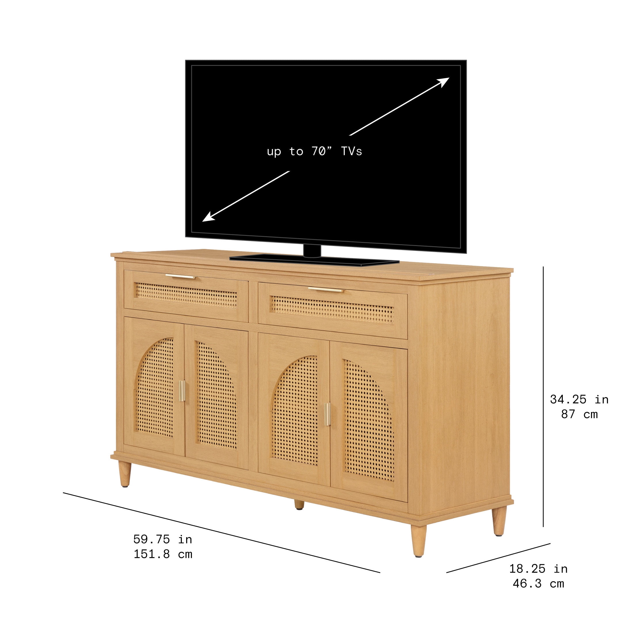 Fit’s most flat panel TVs up to 70” 4 spacious cabinets with Rattan mesh door fronts 2 upper storage drawers with velvet lining Teched Away USB Charging Station inside right drawer Adjustable shelves in lower cabinets Gold painted metal finger pull door hardware Cable cutaways Available in warm honey or rich black Assembly Required Product Dimensions: 59.75 in W x 18.25 in D x 34.25 in H (151.8 cm x 46.3 cm x 87 cm) Packaging Dimensions: 68.25 in W x 22 in D x 9.875 in H Model# BE64250047100E2, BE64250047100E1