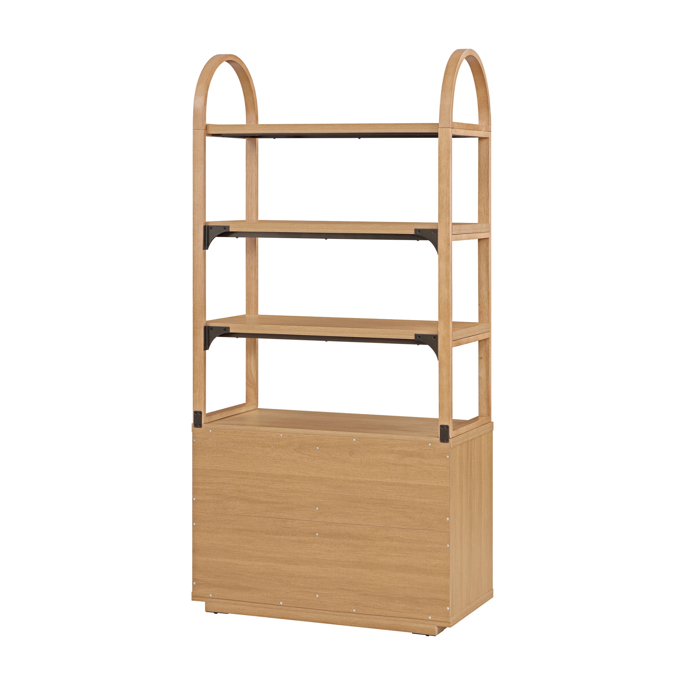 The Beautiful 3-Shelf Fluted Bookcase is a functional and stylish storage solution for any home or office. Crafted from sturdy wood materials, this bookcase offers durability, timeless appeal, and ample space to showcase and organize your book collection or display decorative items. The three open shelves provide generous storage space for books, magazines, or personal belongings. With their open design, the shelves offer easy access to your items and allow you to showcase your favorite books or display decorative accents. Beneath the open shelves, a concealed storage compartment offers additional space with two adjustable shelves to keep items out of sight. The arched design adds a subtle architectural detail, elevating the overall aesthetic of the bookcase. Pair the Beautiful Fluted 3-Shelf Bookcase with other items from the Beautiful by Drew Furniture collection to complete your living room (sold separately).