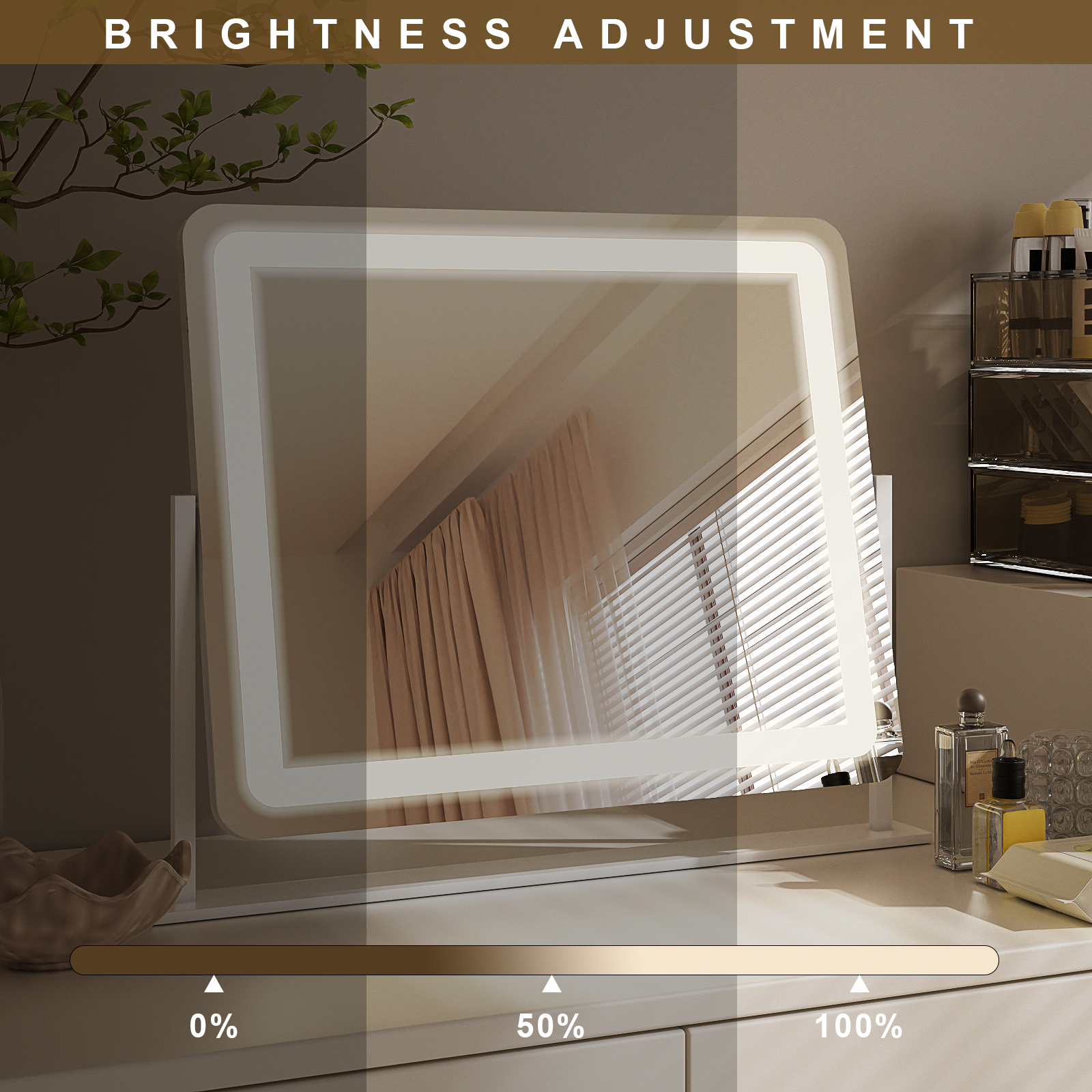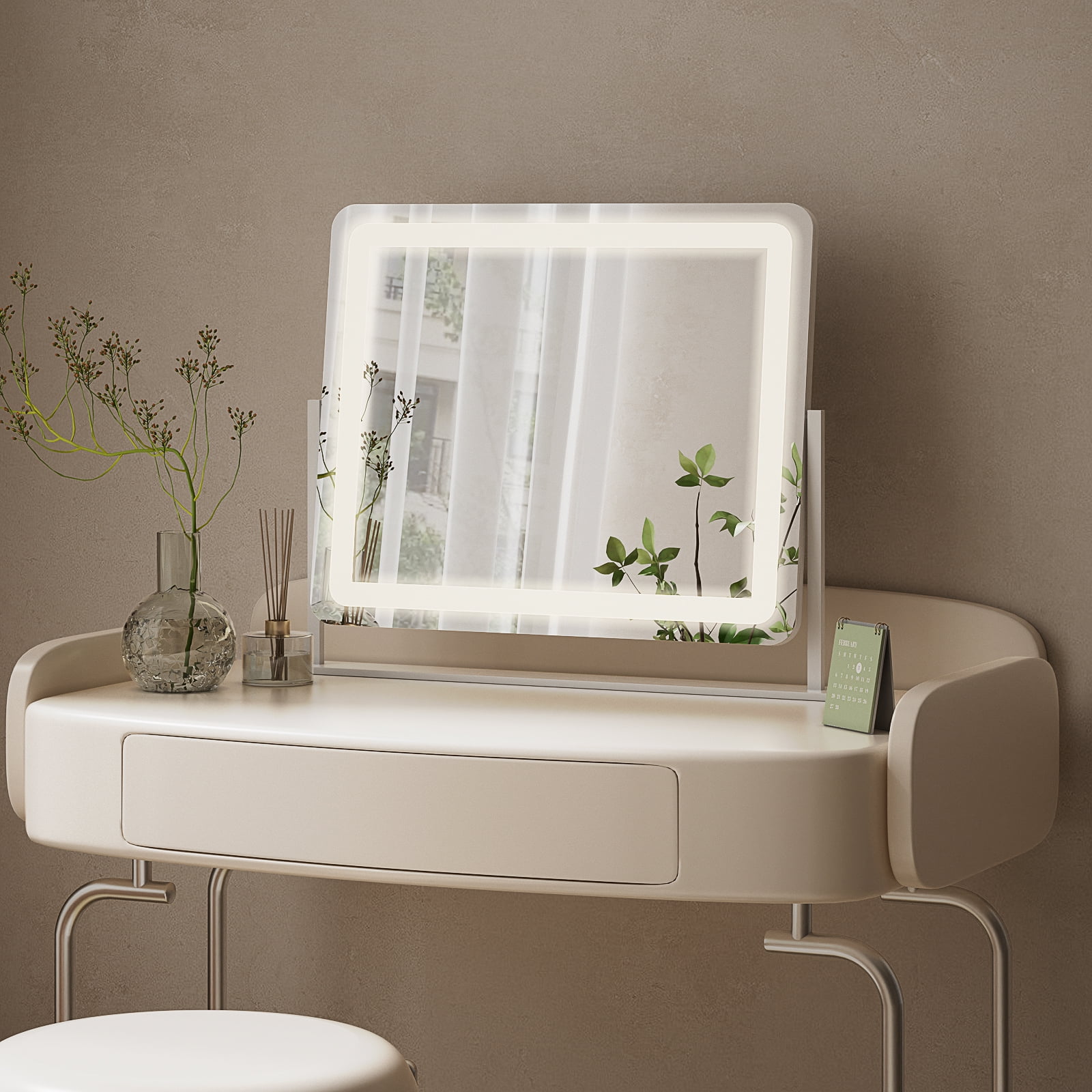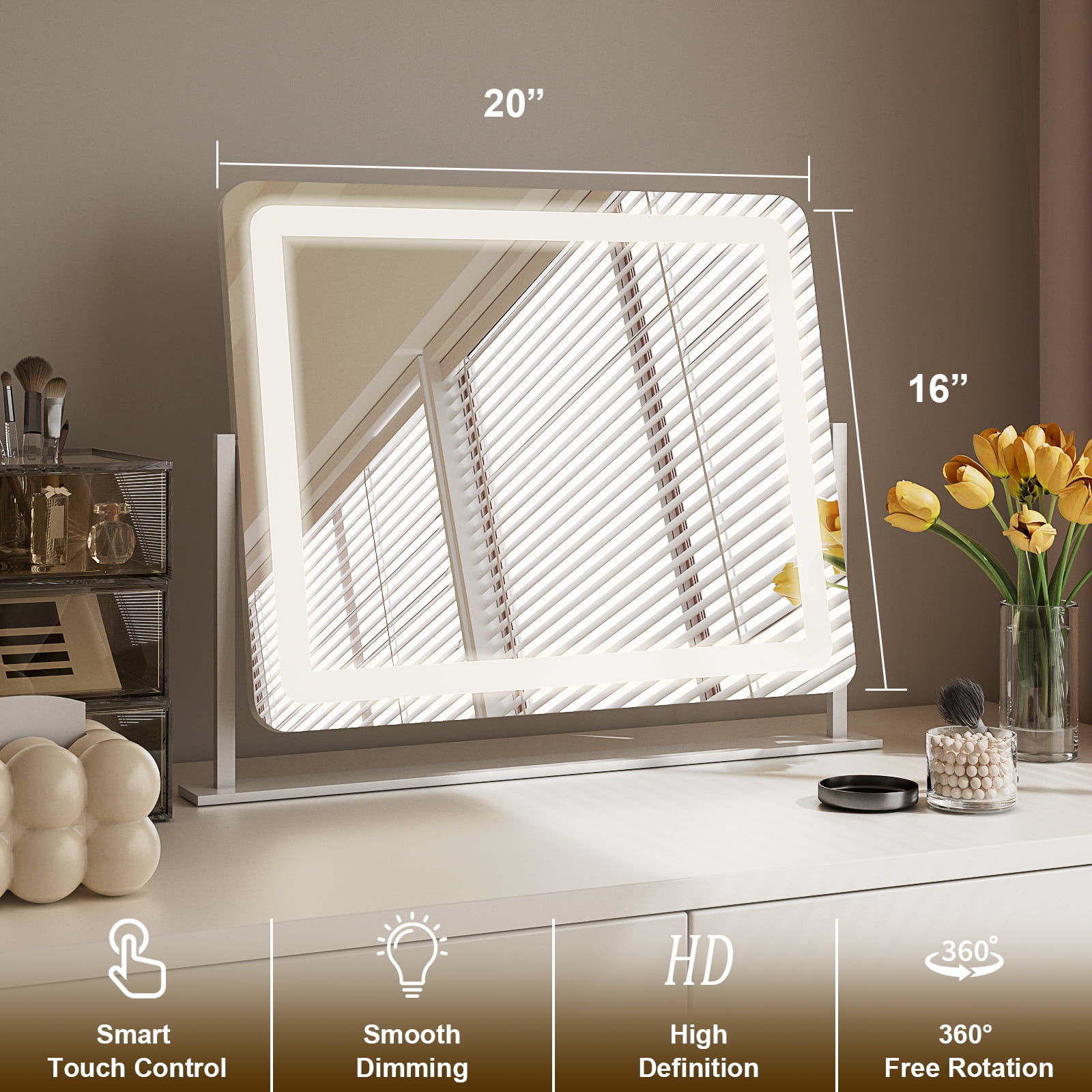 Features: Hidden Bulbs: The bulbs are embedded inside the mirror, creating a simple and beautiful design that saves space and improves the overall experience. Sensor Switch: The switch on the screen makes it easy to turn the light on and off and adjust the brightness of the bulbs. Three Color Modes: Cold/Natural/Warm Light. The brightness can be easily adjusted by touching the mirror, providing you with the ability to personalize the lighting to your preferences. High Definition: Clearer, more realistic images allow users to more accurately see the condition of their skin for finer makeup. Free Rotation: Users can all easily adjust the angle of the mirror to get the most comfortable viewing angle. Specification: Brand: BEAUTYPEAK Color select: White Size: 22″W x 18″H / 20″W x 16″H Shape: Rectangular Material: Shatter-proof Glass & LED Lights Style: Classic Mounting Type: Wall Mounted Room Type: Bedroom & Living Room Assembly Required: No Department: Unisex-Adult Light Information: Feature: Waterproof and durable Color: Dual-color lighting design provides three different color temperatures. Composition: Built-in 120 LED beads.60 LED beads with a color temperature of 3200K.60 LED beads with a color temperature of 6000K. Illumination: Adjustable 20-26 lumens per bead