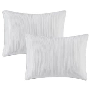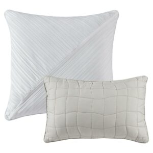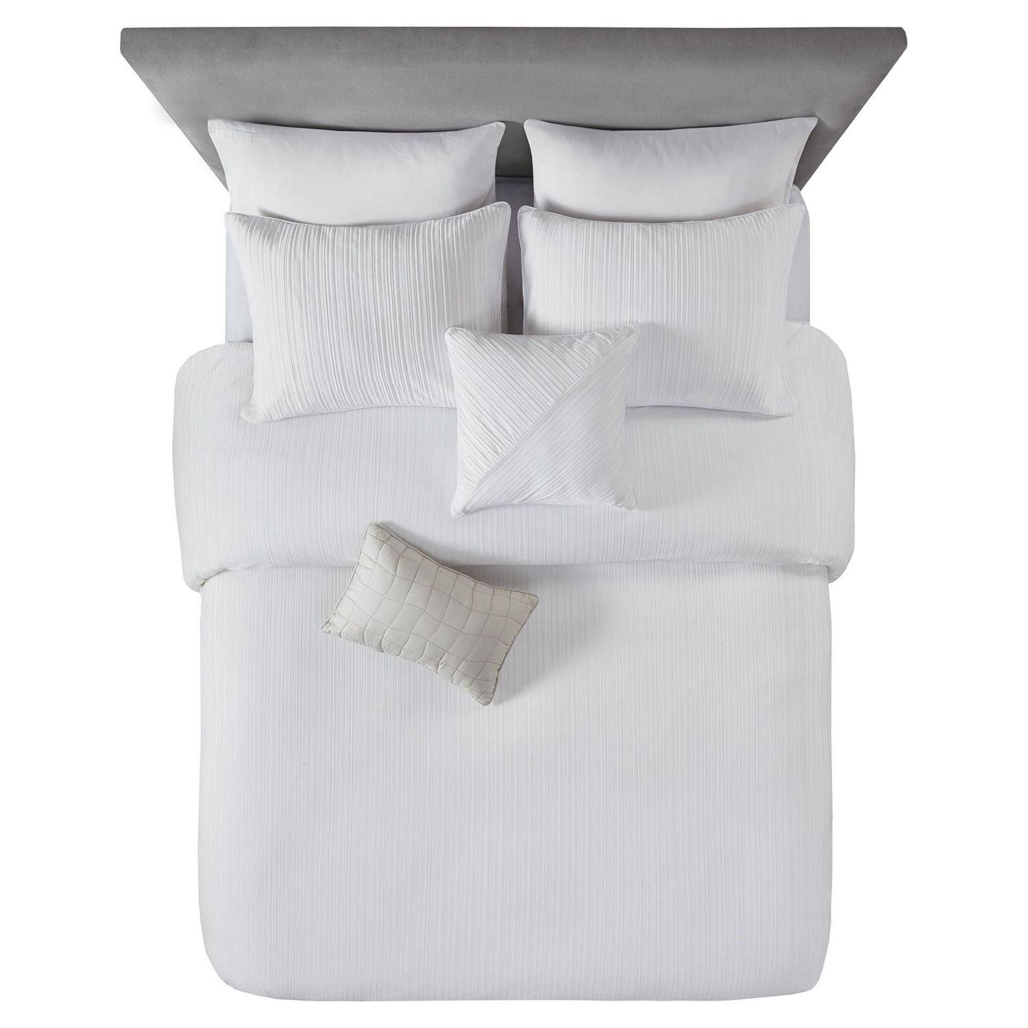 Introducing Beautyrest 5 Piece Jasper Comforter Set features pleated velvet fabric in soft and subtle solid color. Coordinating shams with pieced and quilted decorative pillows to complement the entire bedding décor. Self-fabric piping borders on the pillows adds luxurious glam detail. Select in grey or ivory pleated velvet color.