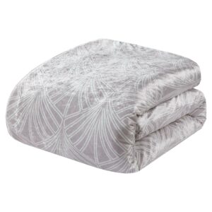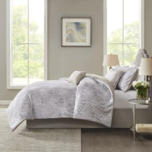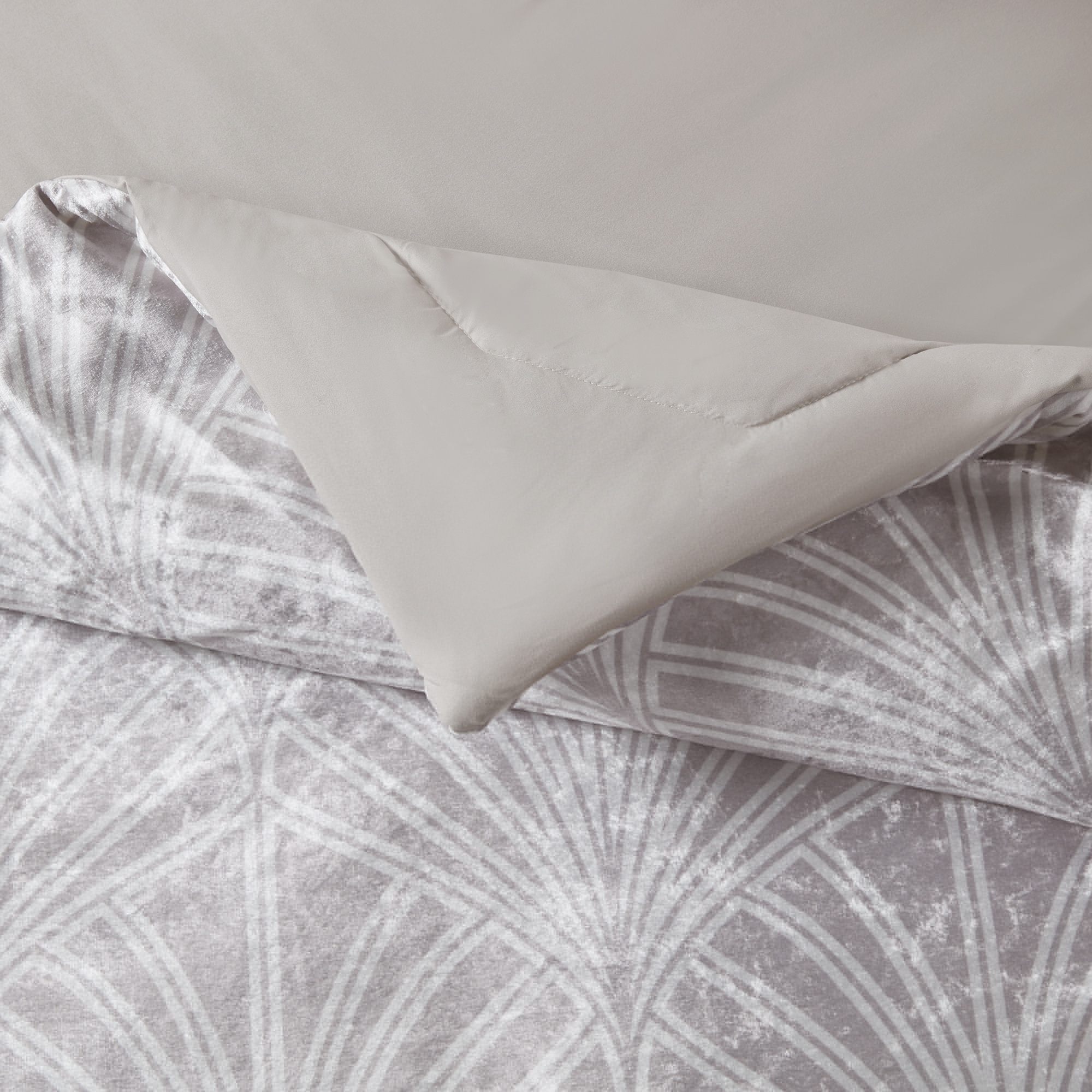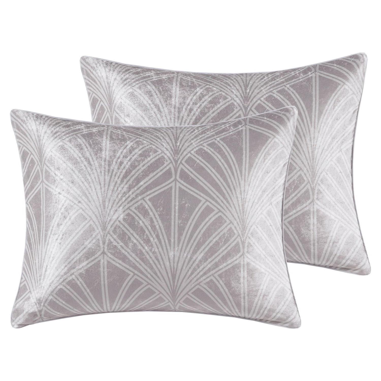 Freshen up your bedroom decor with Beautyrest 5 Piece Kiona Comforter Set. The crushed velvet fabric in printed art deco pattern is soft and elegant. The reverse side of the comforter is microfiber which is comfortable to sleep in. Embroidered abstract patterns in square pillow and oblong pillow with filled piping borders add a finishing touch to complete the look. The comforter is oversized for better coverage in bed with high depth mattresses. Set includes comforter, 2 matching shams, 1 square and 1 oblong decorative pillows.Available in Full/Queen or King size. Select Champagne or Silver color options.