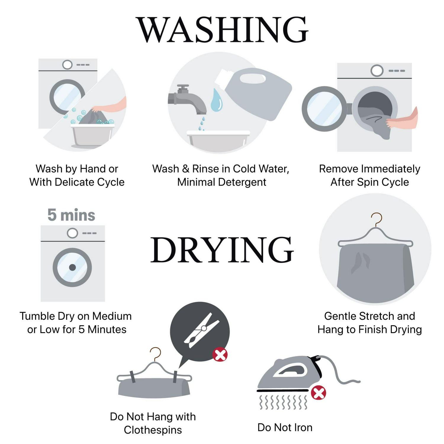 – CARE INSTRUCTIONS: MACHINE WASH COLD, GENTLE CYCLE, AND SEPARATELY. DO NOT BLEACH. TUMBLE DRY LOW, REMOVE PROMPTLY, DO NOT IRON. IF THERE IS NO FREE MOVEMENT IN THE WASHER OR DRYER, USE LARGE CAPACITY COMMERCIAL WASHER/DRYER.