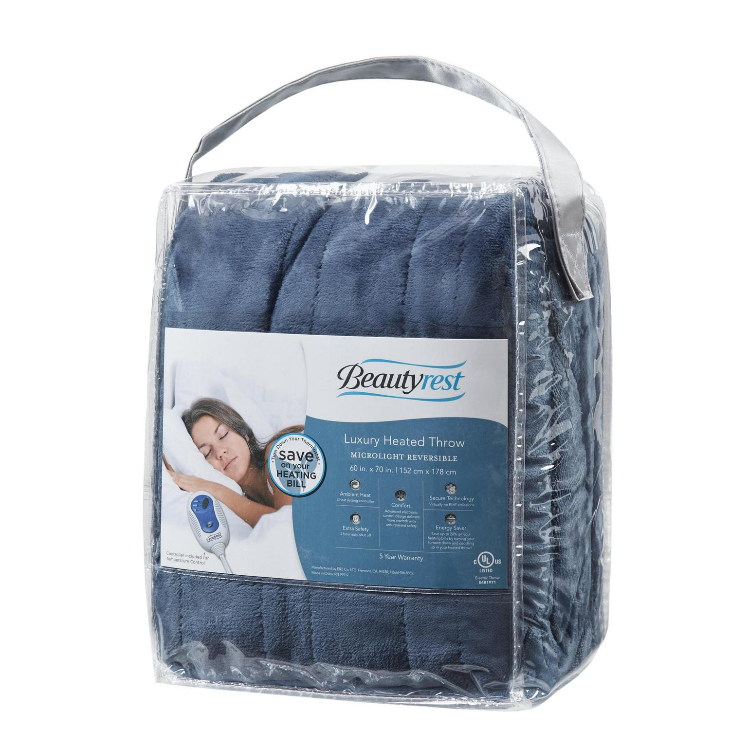 Immerse yourself in comfort with the Beautyrest Heated Plush Oversized Solid Microlight Throw. This heated throw utilizes state-of-the-art Secure Comfort heated technology that adjusts the temperature of your throw based on overall temperature, spot temperatures and the ambient temperature of your room to ensure a consistent flow of warmth. This unique technology also emits virtually no EMF emissions, so you can snuggle up with confidence. This throw is oversized, nearly a foot larger in length and width compared to standard heated throws. The ultra-soft microlight plush fabric creates a cozy, comfortable throw. Featuring three heat settings and two hour auto shut off. This throw is machine washable for easy care.