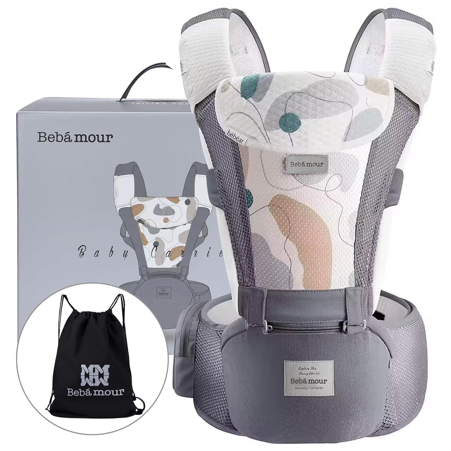 Bebamour Baby Carrier Newborn Front and Back Carry Baby Carrier Newborn to Toddler Baby Hip Carrier with Head Hood & 3 Pieces Teething Pads (Grey)