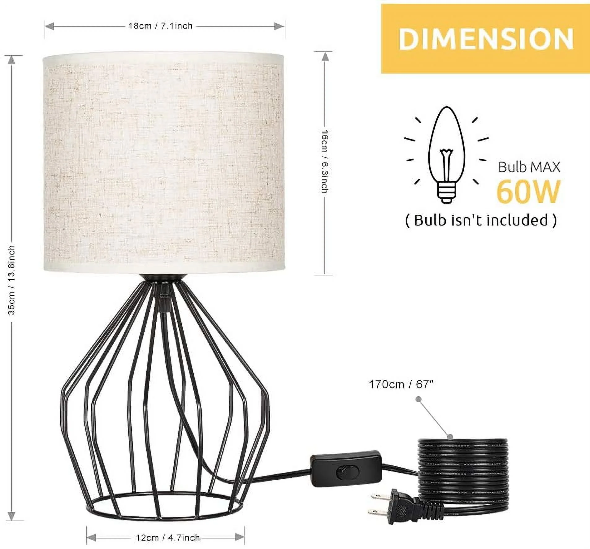 [IDEAL LAMPS SIZE FOR ANY DESK] Lamp dimension – 13.8 x 7.1 x 4.7 inches, it’s a small bedside lamp with compact and generous design, that is ideal to fit any size table, desk, occupy small spaces. It’s perfect in living room, bedroom, girl’s room, den, college dorm, family, etc. [High-Quality] Its frame base design was combined with spray paint and high temperature furnace fixation technology, which is enduring, durable and aesthetic. The quality of the task lamp allows it to be long last and stylish, beautiful accessory for one’s room! [Decor] The bedside lamp is perfect décor for a beautiful modern house that adds a touch of beauty to any room. [Safety & Easy To Use] The cord and plug of the lamp are UL listed. An ON/OFF button on the power cord is convenient to use. It’s a lighter weight lamp, easy to move to any place where you have lighting needs. Easy to assemble. Very nice minimalist light for the right price! [Simple & Minimalist Design] The black table lamp looks modern but also retro with black chrome metal basket cage style base and fabric lampshade, never out of fashion. [Hallow Base] Its modern black chrome metal basket cage style and warm comfortable light creates the romantic and elegant atmosphere, which is unique decoration wherever you put it in.