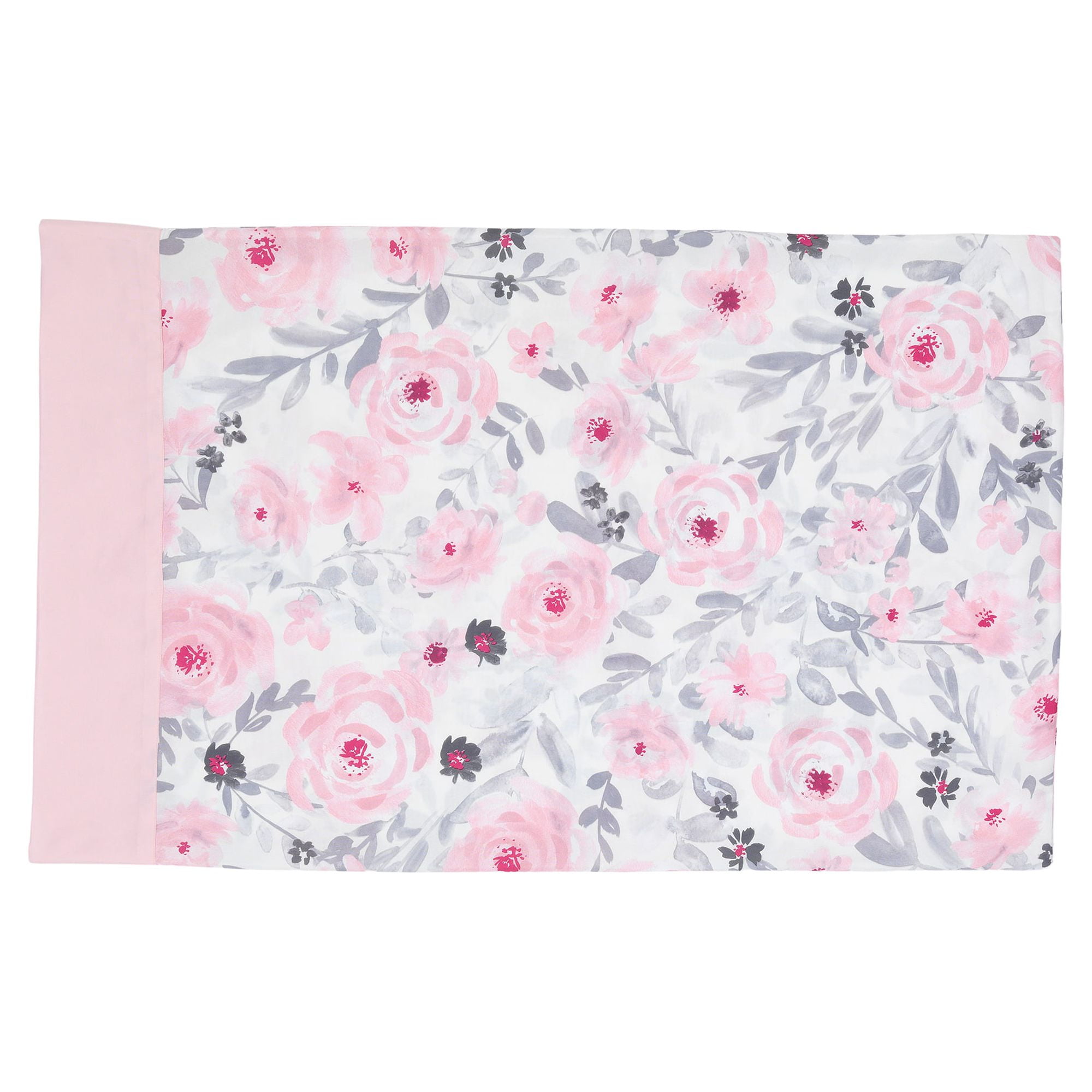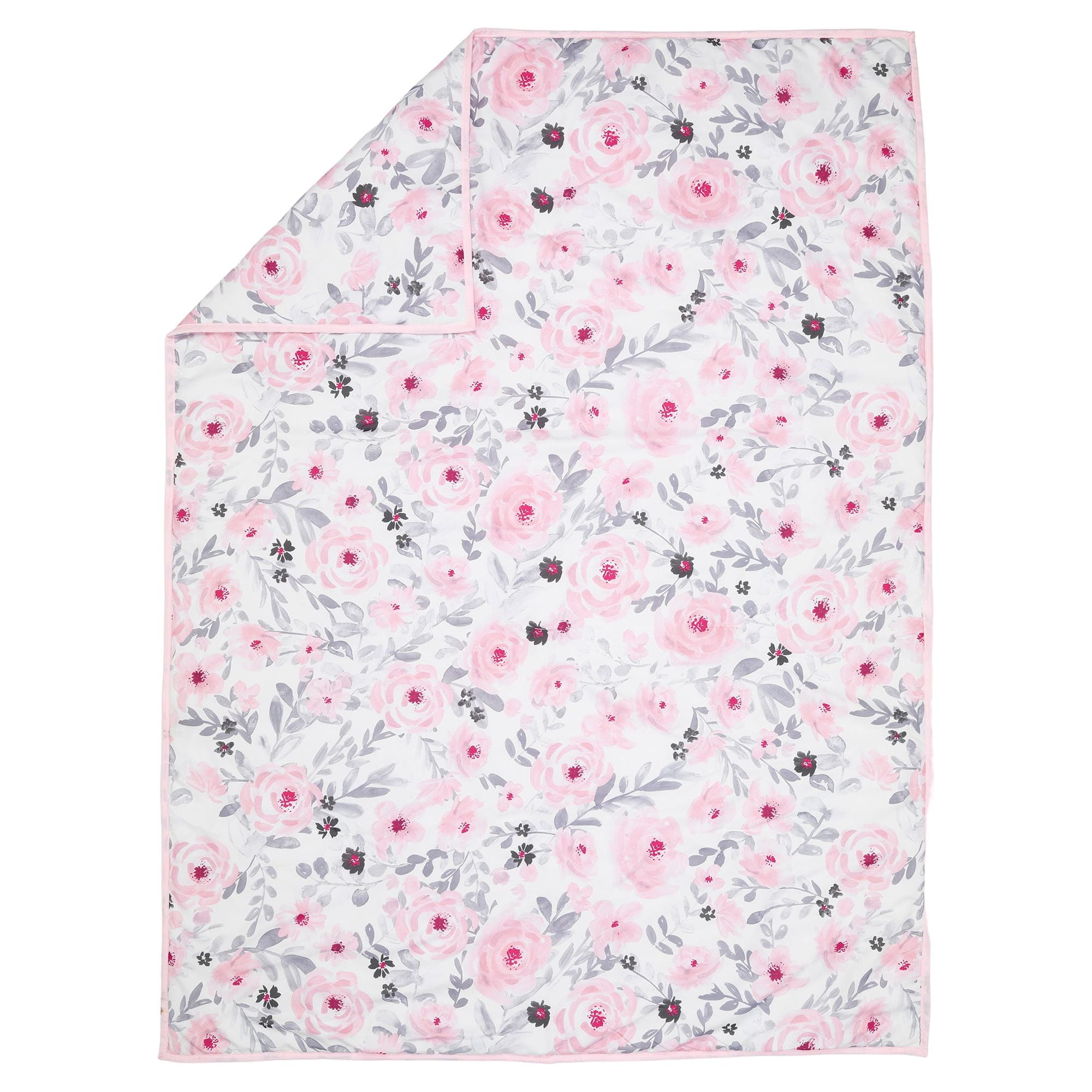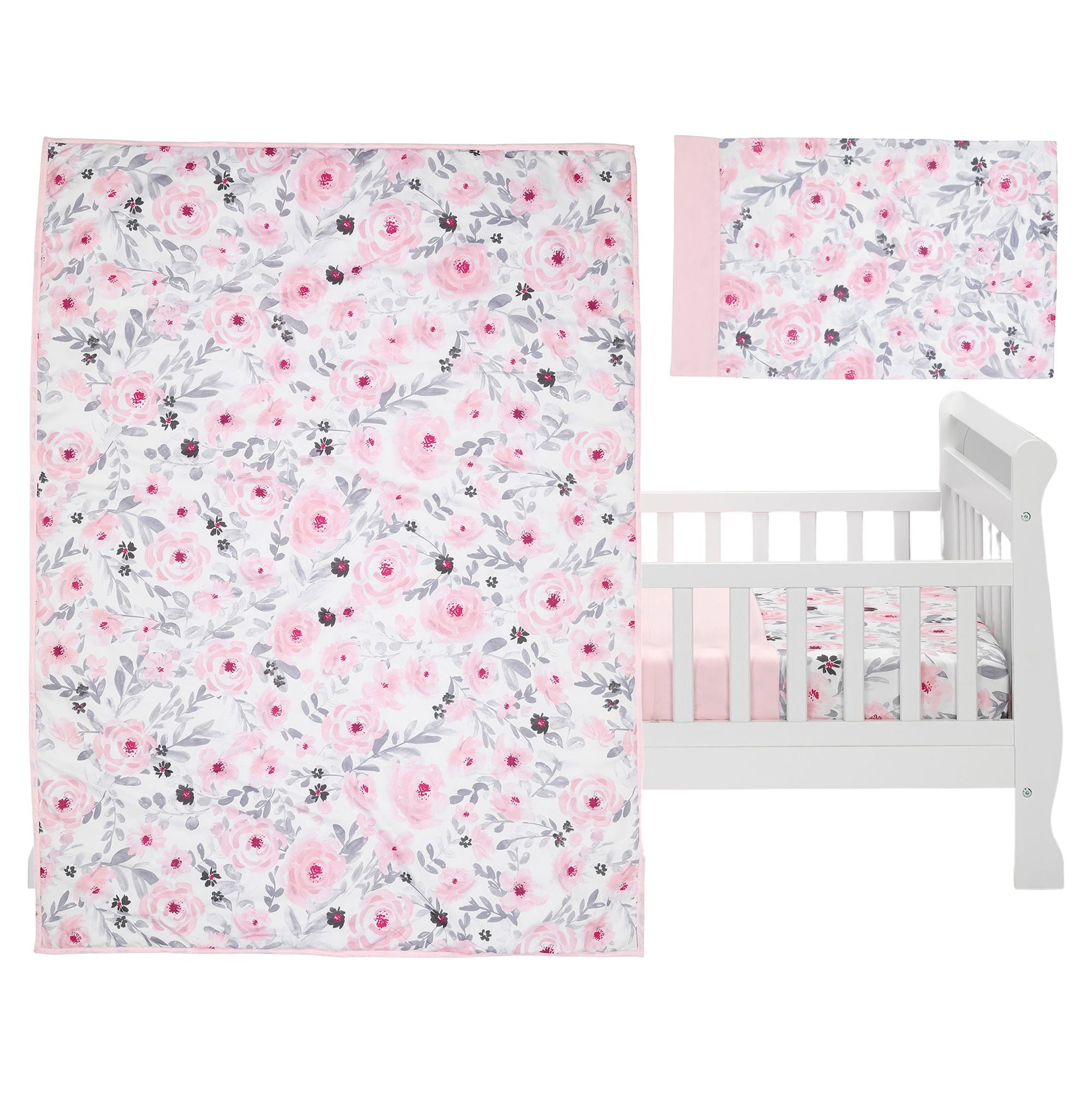 This charming toddler bedding set includes one quilt, one top sheet, one bottom sheet and one standard size pillowcase Made in a gorgeous, ultra-soft microfiber watercolor floral print Trendy pink and gray watercolor floral color story The fitted bottom sheet has elastic all the way around ensuring a safe and secure fit on a standard size toddler mattress measuring 28″x52″ Machine washable and durable for easy care