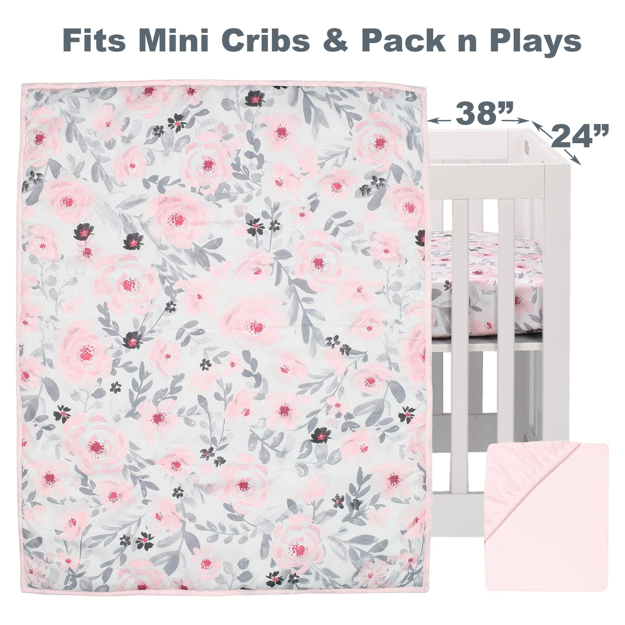 Mini Crib Bedding Set includes one quilt and two fitted sheets. Quilt is 30” X 38” and Sheets are 24” X 38”. Sheets are designed to fit mini cribs or pack N plays (not standard size cribs). Soft microfiber fabric digitally printed for superior color and quality Beautiful custom designed watercolor floral pattern Trendy shades of pinks and grays