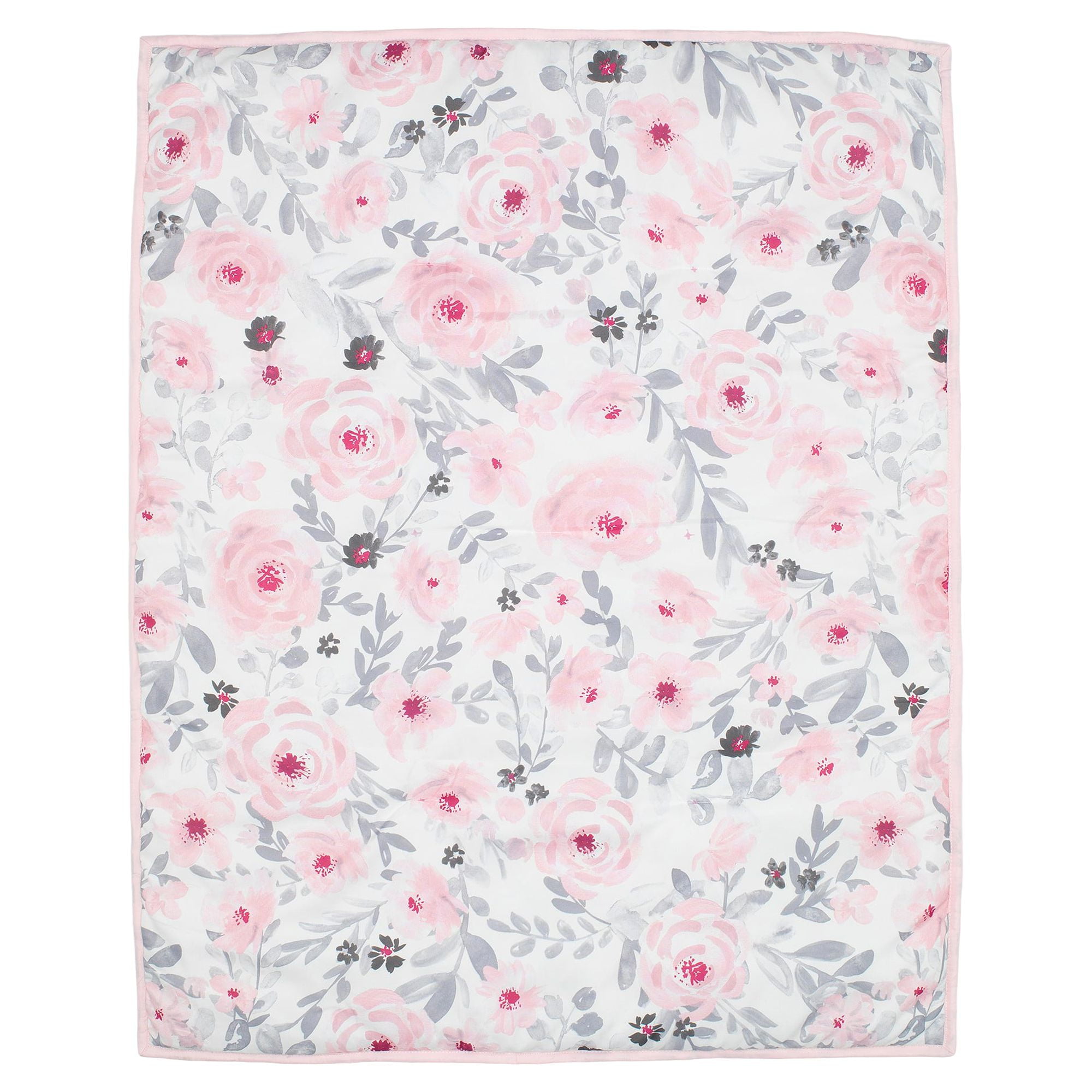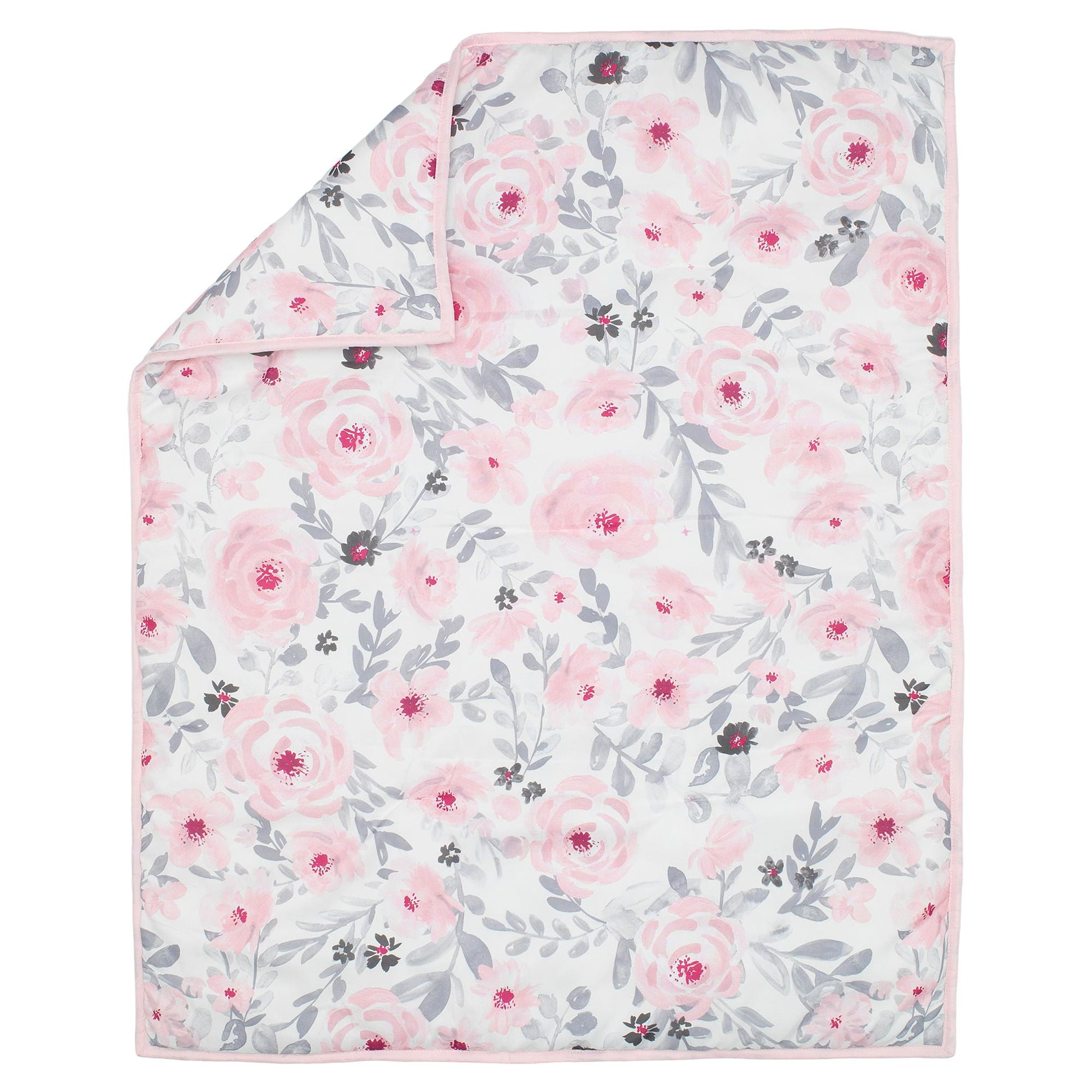 Welcome home your little one with this charming watercolor floral 3-piece mini crib set. The set includes one quilt (30” X 38”) and two mini crib fitted sheets (24” X 38”) all made of a soft microfiber fabric. One sheet is the gorgeous floral watercolor print and the other is a solid matching pink. Both sheets have elastic all around for a safe and secure fit on a mini crib mattress measuring 24″ x 38″. The quilt is double-sided with the watercolor floral on both sides. Please Note: This set is designed to fit a mini crib or porta-crib, and should fit most pack n plays; it will not fit a standard size crib.