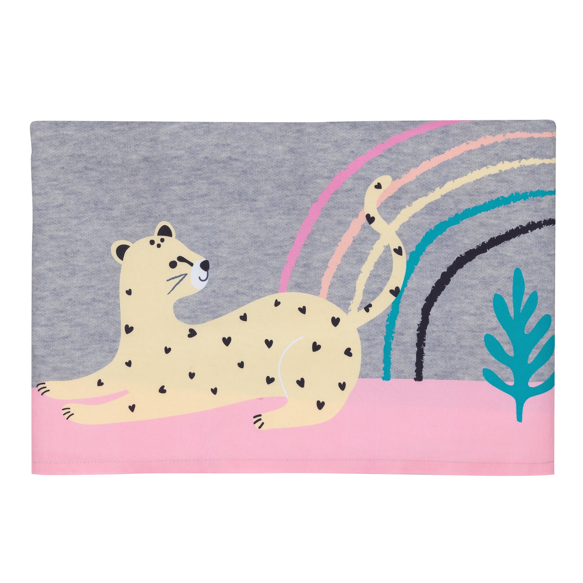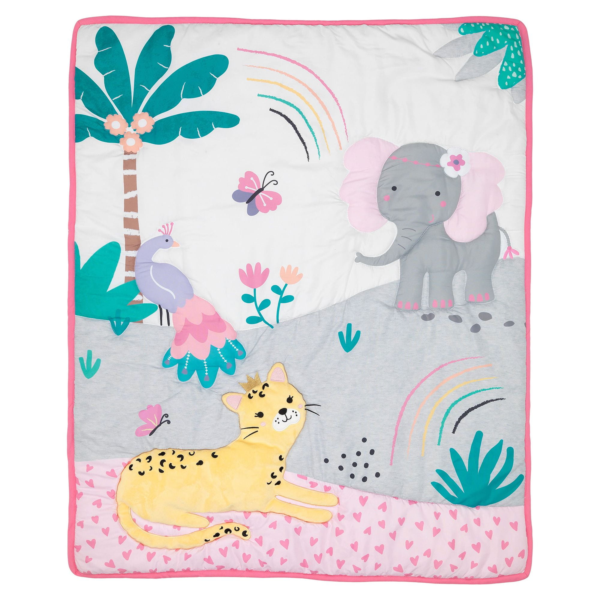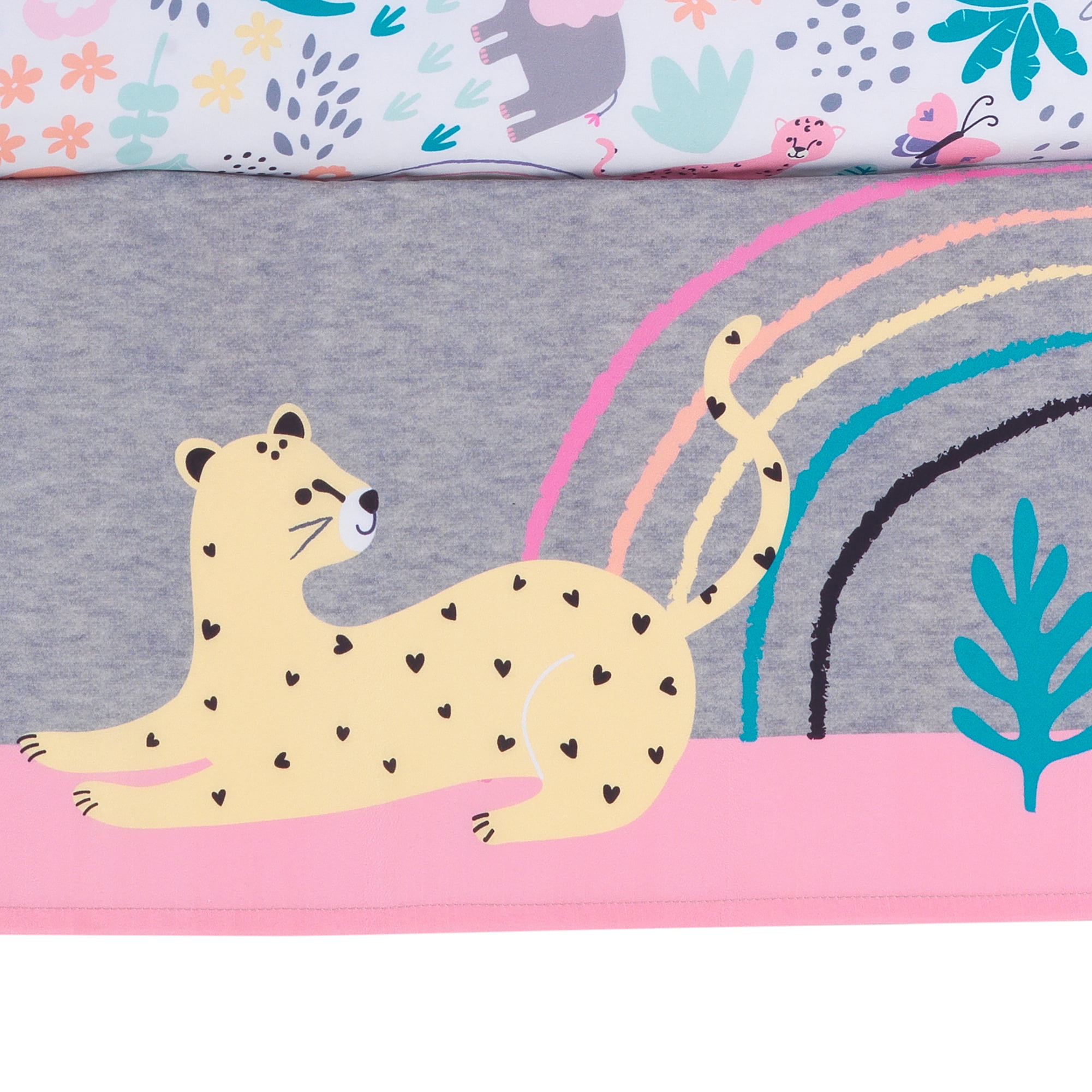 Welcome home your little one with this colorful jungle inspired collection. This three-piece crib bedding set includes one quilt, one fitted crib sheet and one crib skirt. It is made in a super soft microfiber material. The quilt features a fully appliqued yellow velour leopard with embroidered black spots resting on a pink heart ground. She has a metallic gold crown on her head. She is surrounded by Cherry, the elephant, who is standing on a heather gray color ground, Petunia, the peacock, along with trees, flowers, rainbows, and butterflies. The adorable, fitted crib sheet features our cute animals, plush trees, flowers, rainbows and leaves on a crisp white ground. The fitted crib sheet has elastic all the way around ensuring a safe and secure fit on a standard size crib mattress measuring 28” X 52”. The crib skirt adds the finishing touch to your child’s crib. The top panel is a heather gray color and has a pretty pink border. On the right side of each panel is the leopard with an arched rainbow.