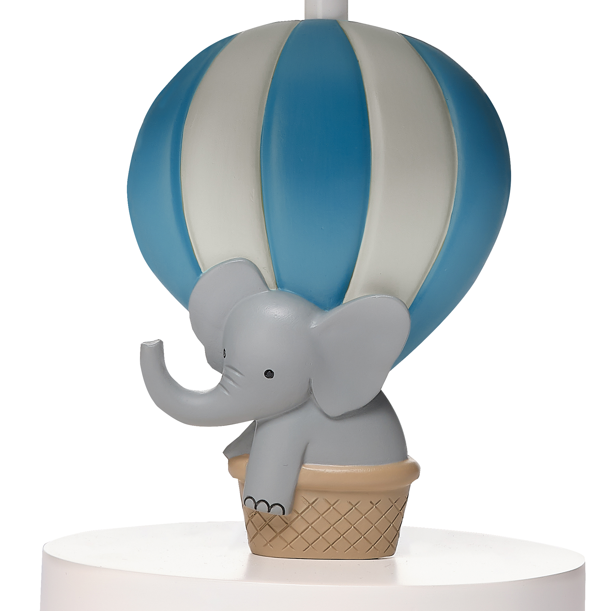 Light up your child’s room with a soft glow with this custom hot air balloon lamp and shade. It is made of a 2-dimensional resin, is hand painted and the total height is approximately 11”. The wide stripe hot air balloon is carrying a cute gray elephant in the basket. The lamp shade is sky blue with white clouds. This lamp comes complete with an energy-efficient LED light bulb equivalent to 40 watts.