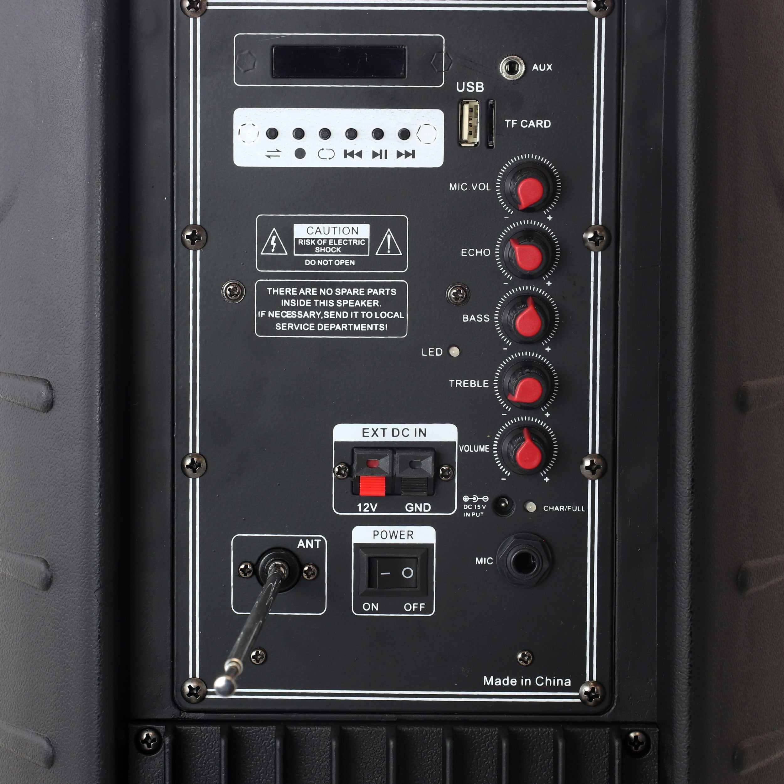 Be the life of the party with this whopping 12″ Bluetooth portable speaker. The days of tape decks, CD players and MP3 devices are long gone. Now your music lives on your phone or computer tablet, so you can stop searching for those outdated cables and fancy adapters. Now with a simple wave of your hand, you can stream music from any Bluetooth audio-equipped device such as your iPad, iPod touch, iPhone, and even your laptop computer.Features:* 12 Inch Subwoofer* 700W Peak Power* Bluetooth, MicroSD, and USB Compatible* 1 Mic Input* FM Radio* Built-in Handle for portability* Remote Control and Microphone Included* Powerful Rechargeable 6600mAh- 12V BatteryFeatures:* 12 Inch Subwoofer* 700W Peak Power* Bluetooth, MicroSD, and USB Compatible* 1 Mic Input* FM Radio* Built-in Handle for portability* Remote Control and Microphone Included* Powerful Rechargeable 6600mAh- 12V Battery 12 Inch Subwoofer 700W Peak Power Bluetooth, MicroSD, and USB Compatible 1 Mic Input FM Radio Built-in Handle for portability Remote Control and Microphone Included Powerful Rechargeable 6600mAh- 12V Battery
