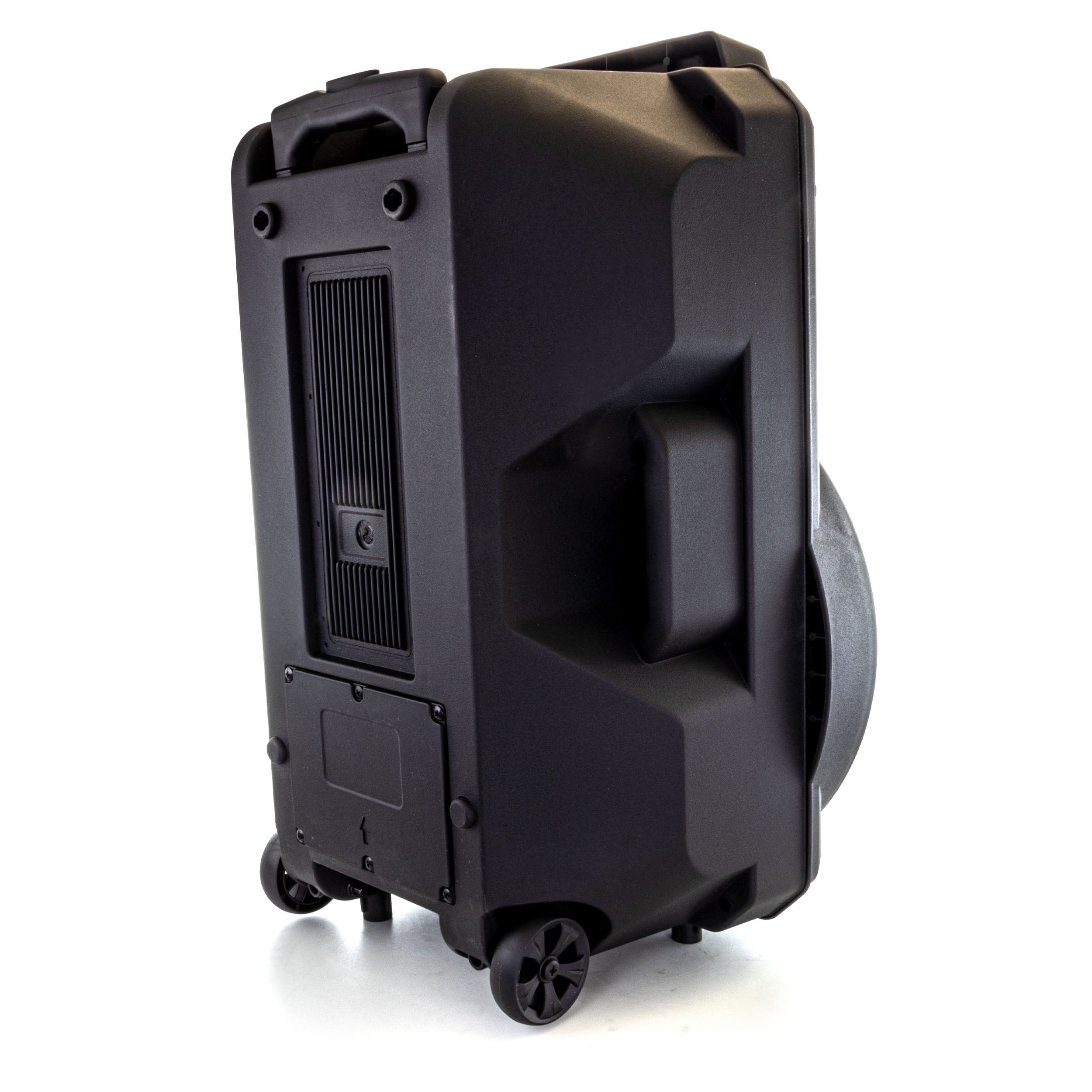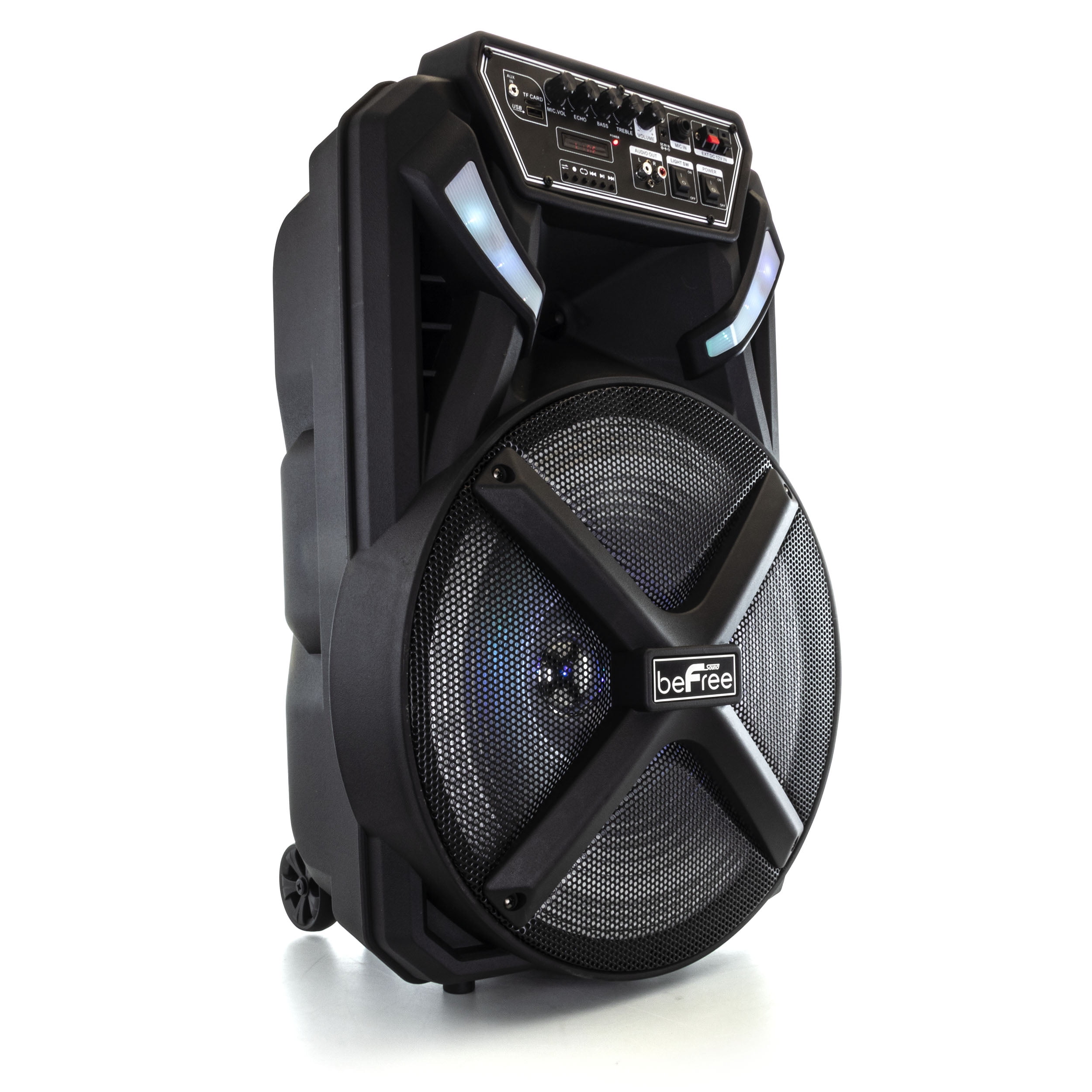 Take the party anywhere with the beFree Sound 15″ BT Portable Rechargeable Party Speaker! This 14.75 lbs. party speaker is fully mobile with rolling wheels and a carrying handle for easy transportation. Not only is this speaker mobile, but this system comes complete with sound-reactive lights, USB/TF compatibility, a remote control, and an FM radio for an all-in-one party experience!