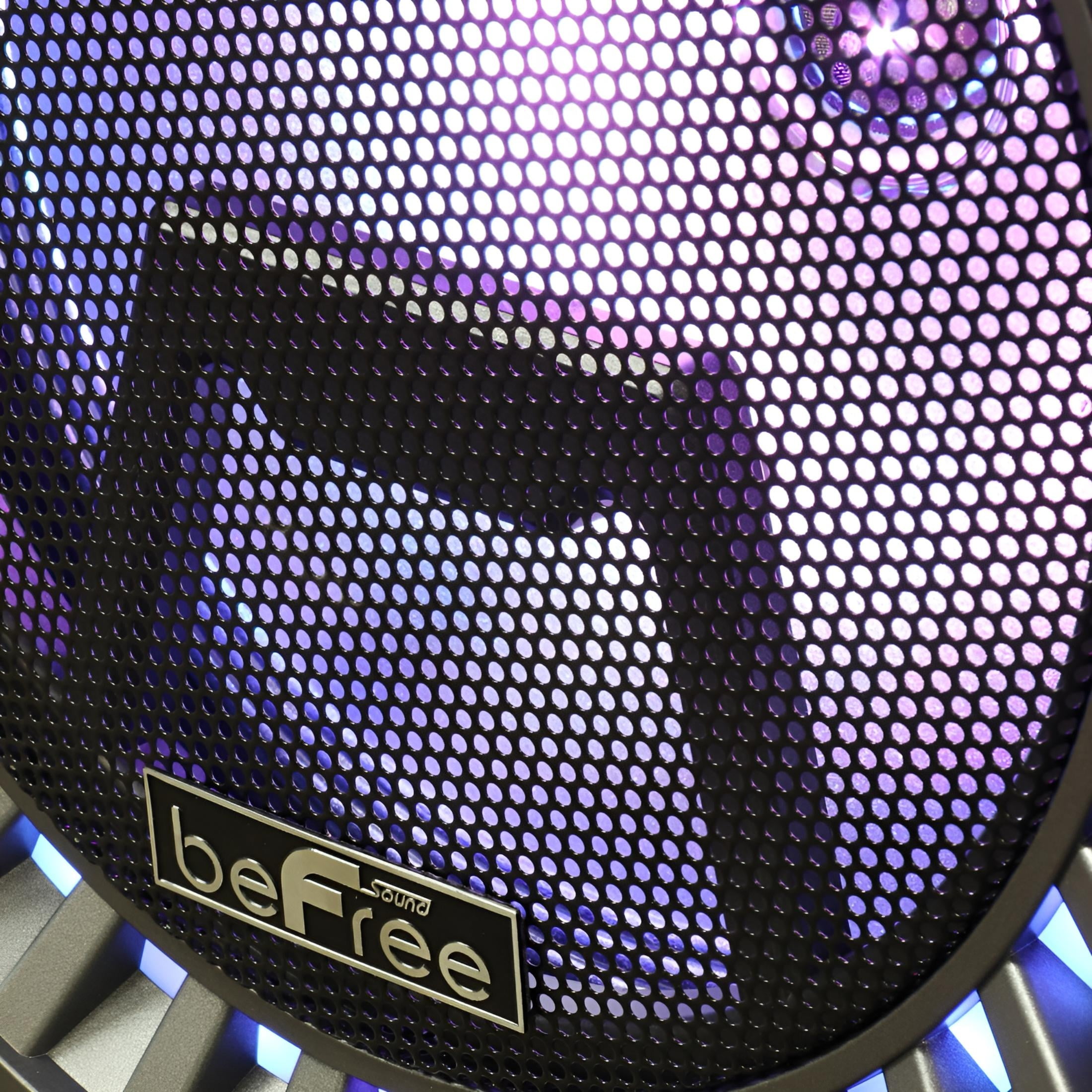 The new beFree Sound Rechargeable Bluetooth 12 Inch Double Subwoofer Portable Party Speaker with Dual Layer Reactive Party Lights, USB, SD, TF and AUX Inputs with FM Radio is an all in one entertainment assistant for the most advanced entertainers around. This easily portable speaker includes hard mounted top handles for your convenience, and boasts a large frame to ensure its highly visible. With such a Colorful Dual Layer Light Show Display, this sound system is sure to pump up the party in whole new way. While your guests may already enjoy your music selections, this speaker will help you take your entertaining to higher level. You can connect a variety of devices, and choose the input that is best to suit your needs. You always have the option of turning off the reactive light show for those more subtle gatherings and allowing yourself to enjoy the strong, clear sound provided by the Dual 12 Inch Subwoofers. EASILY CONNECTABLE: beFree has your convenience in mind. Bluetooth may be your favorite connection, and we understand, but there are times when other options are needed. With you in mind, beFree Sound has jam-packed this ultimate party speaker with connections to ensure you have every option you need. This Speaker offers USB, SD, TG and AUX Inputs. It also features a Microphone Jack for your wired microphone, or you can connect the included wireless microphone and feel free to move around while you dance and sing to your favorite karaoke tunes. DUAL LAYER REACTIVE PARTY LIGHTS: The Party never stops while this speakers light show is wowing your guests. There are two layers of individually reactive lights which change according to volume setting. While you may have had other party lights in the past, this speaker is sure to amaze and entertain with it’s unique style and brilliant lights. EASILY PORTABLE: Hard mounted top handles, and Dual Rolling Wheels make this unit easy to transport and handle. Designed with your convenience in mind so that you’ll never have to leave this speaker behind. STRONG CLEAR BRILLIANT SOUND: This speaker won’t impress you with it’s size alone. The 12 Inch Double Subwoofers offer a thunderous and thrilling 2000 Watts of P.M.P.O., ensuring that your guests will be moved by the music even if they lean against the walls. Features * 1 Microphone Input * 1 Guitar Input * SD Card Slot * TF Card Slot * USB Flash Reader * Mic Priority Switch * Sound Control Knobs * AUX * Antenna * Top Handles * Pull Handle * Includes Wireless Microphone, Remote Control and Charging Power Cord Item Dimensions: 12.00″ x 15.00″ x 43.00″ Item Weight: 41.50lbs