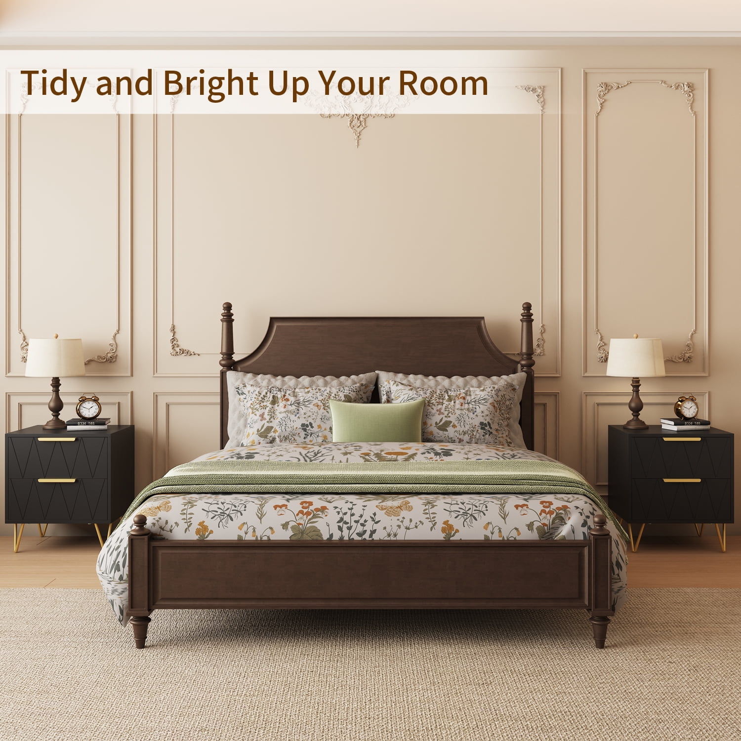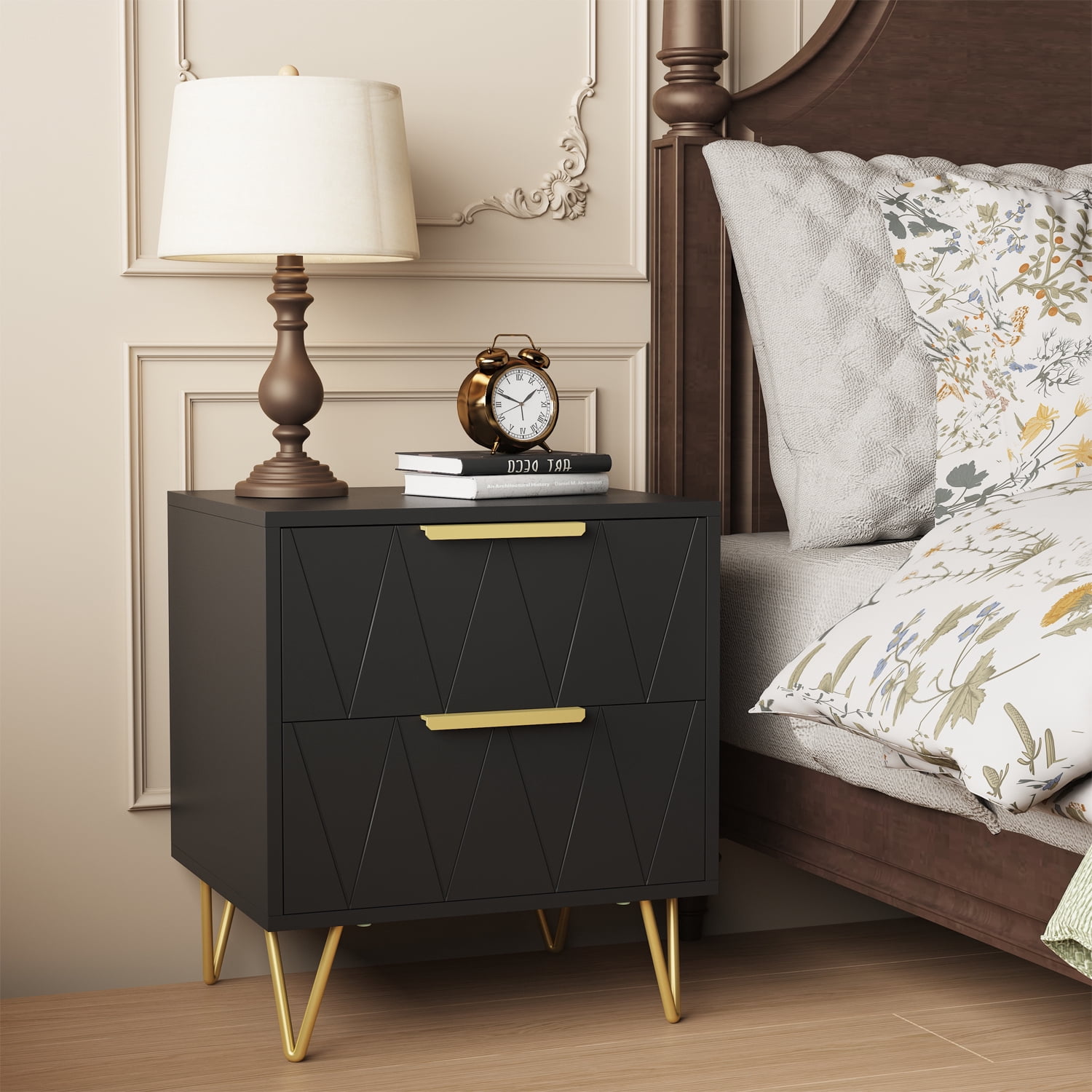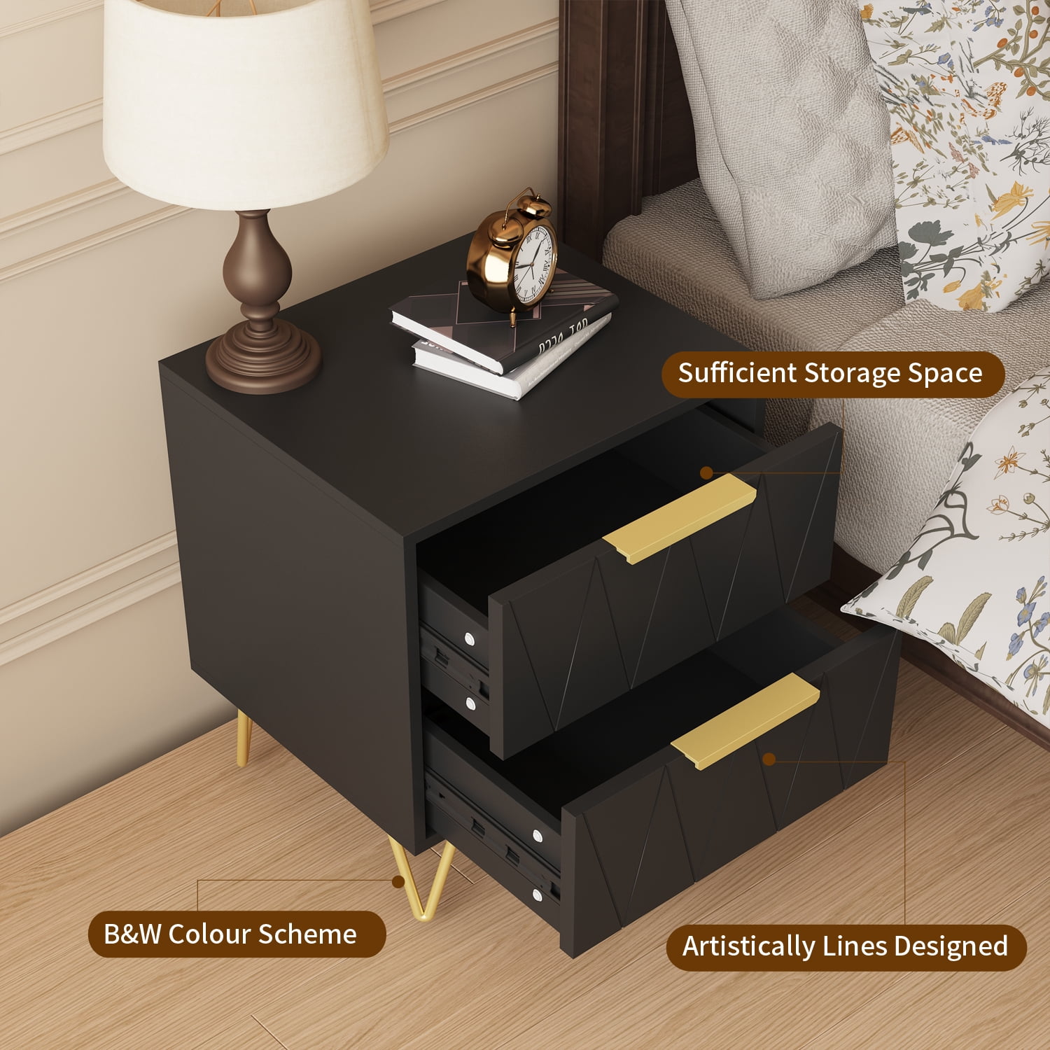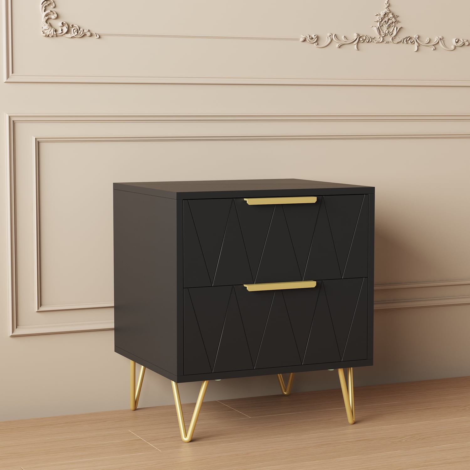 BEHOST MODERN PRACTICAL NIGHTSTAND WITH 2 DRAWERS This sleek and stylish bedside table boasts a smooth surface that provides ample space to store personal belongings or any other items you wish to keep within reach, making it both practical and visually appealing. Bedside table equipped with two spacious drawers and premium handles,white gold finish, complete with a diamond pattern design, adds a touch of elegance to any bedroom decor, making it a great choice for those who desire a modern and sophisticated look.Made of high-quality MDF board and thick metal, it offers ample durability and support for all your items. Nightstand portable design makes it easy to move from room to room, providing convenient storage and display options wherever it is needed.