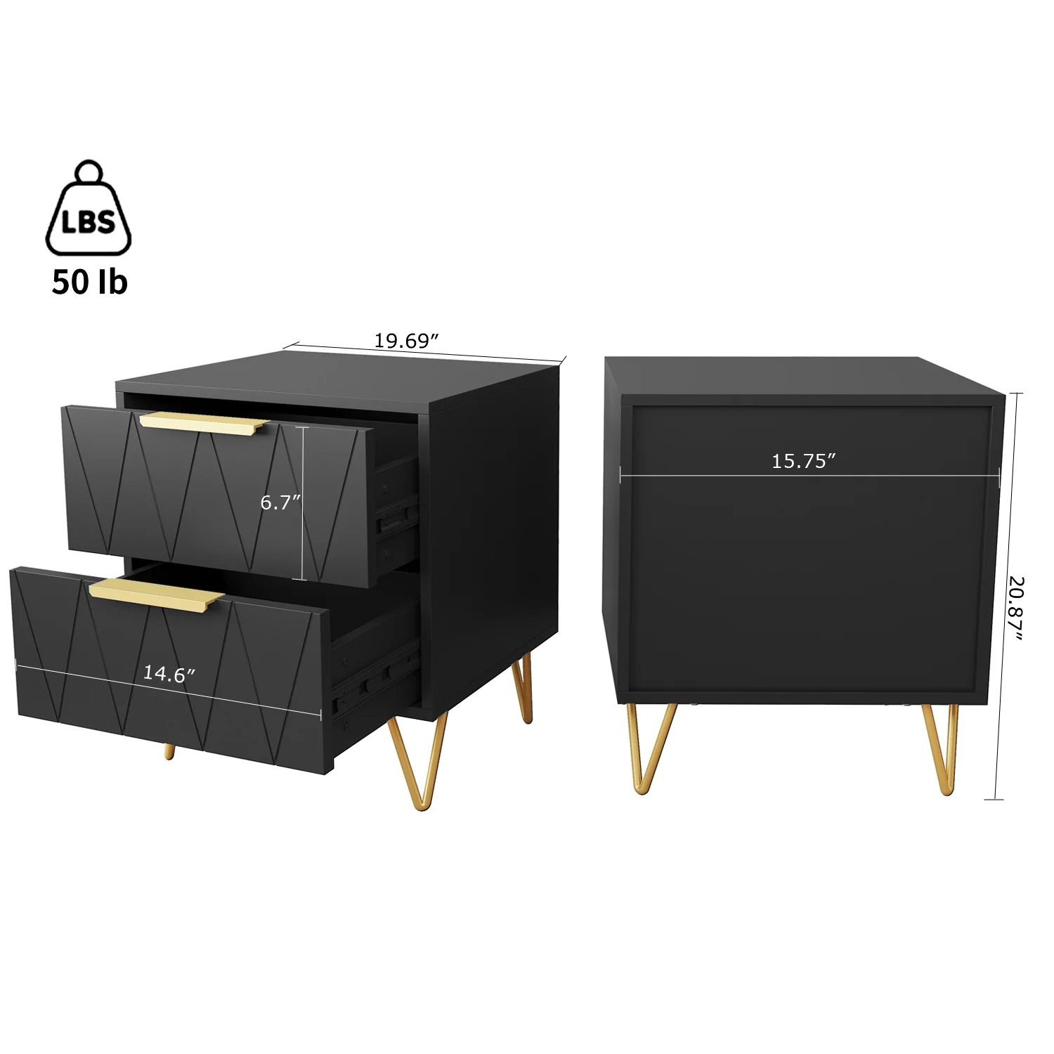 Elegant Design:This simple yet sophisticated nightstand features a captivating diamond pattern on the surface its clean lines and modern minimalist design add a fresh and contemporary touch that blends seamlessly with any decor. Ample Storage:Don’t let its sleek appearance fool you – this bedside table is highly practical and provides ample storage space. With 2 drawers for private items and a spacious tabletop for lamps, books, and other essentials, it offers the best of both worlds in terms of form and function. Versatile Placement:Whether you use it as a modern nightstand for bedroom, an end table close to a couch for living room, or even on your balcony or porch, this versatile wood night stand with drawers adds a touch of luxury and elegance to any space. Durable and Stable:Crafted from premium E1 MDF board and solid metal, this white nightstand is built to last and withstand the test of time. It also features adjustable foot pads that keep it stable on uneven floors and prevent scratches on your wood floors. Easy Assembly:With all parts, tools, and instructions included in the package, this 2-drawer nightstand is easy to assemble and can be put together in just 20 minutes with the help of the provided instructions. We recommend 2 people to assemble it. Excellent Customer Support:At Behost, we value our customers and are committed to providing exceptional customer service. We offer an 18-month warranty and a professional customer support team to assist you with any questions or concerns you may have. SPECIFICATIONS: COLOR : White or Black MATERIALS :E1 MDF Board + Metal ITEM OVERALL SIZE: 39.4”W x 13.4”D x20.7”H ITEM WEIGHT: 38.68 lbs PACKAGE SIZE: 23.62”L x 18.89”W x 7.48”H PACKAGE QUANTITIES:1 PACK VERSATILES ARRANGEMENTS:BEDROO/LIVING ROOM/OFFICE