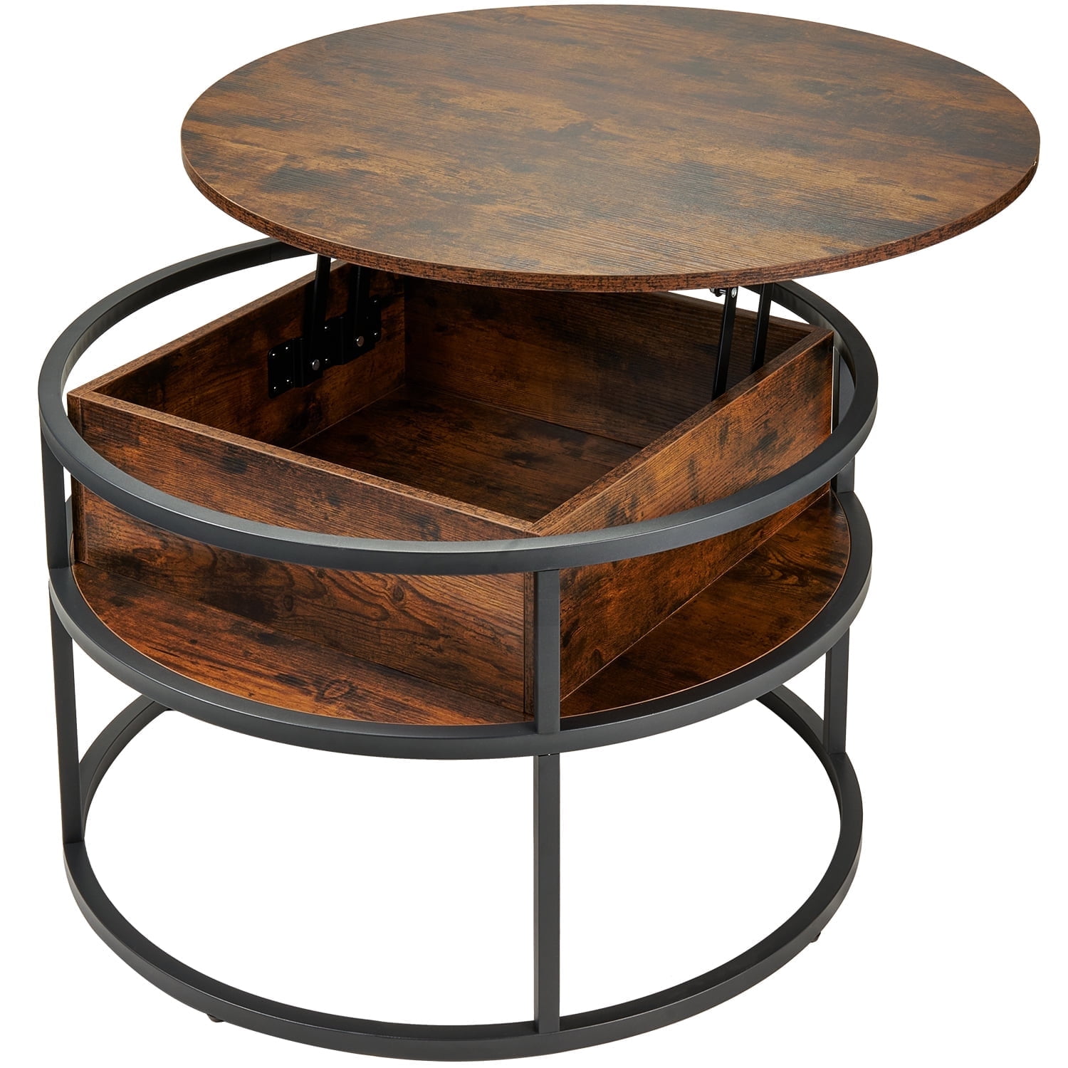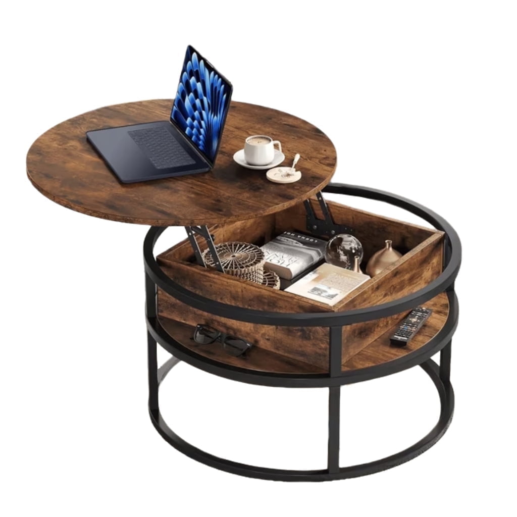 Behost Round Lift Top Coffee Table with Storage, Industrial Wood Coffee Table with Metal Frame for Living Room, Rustic Brown