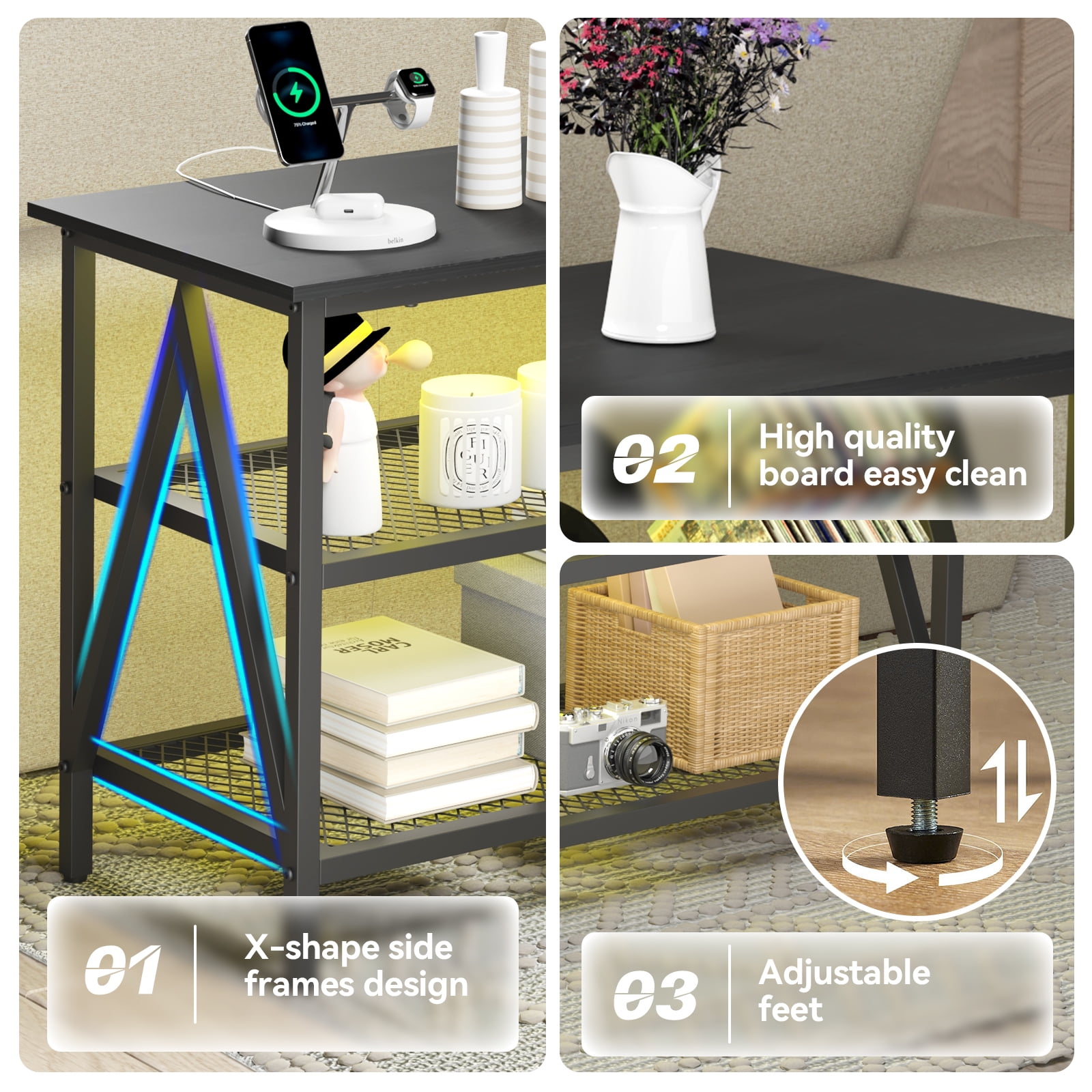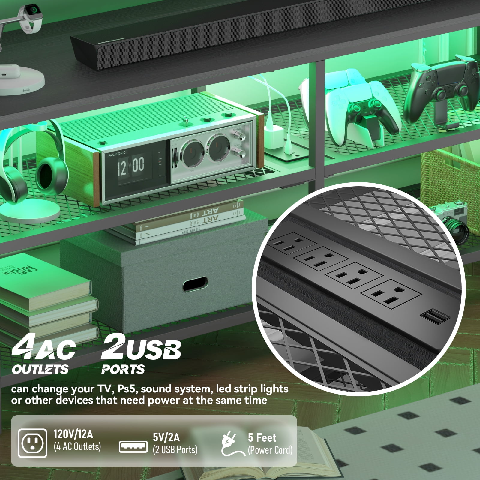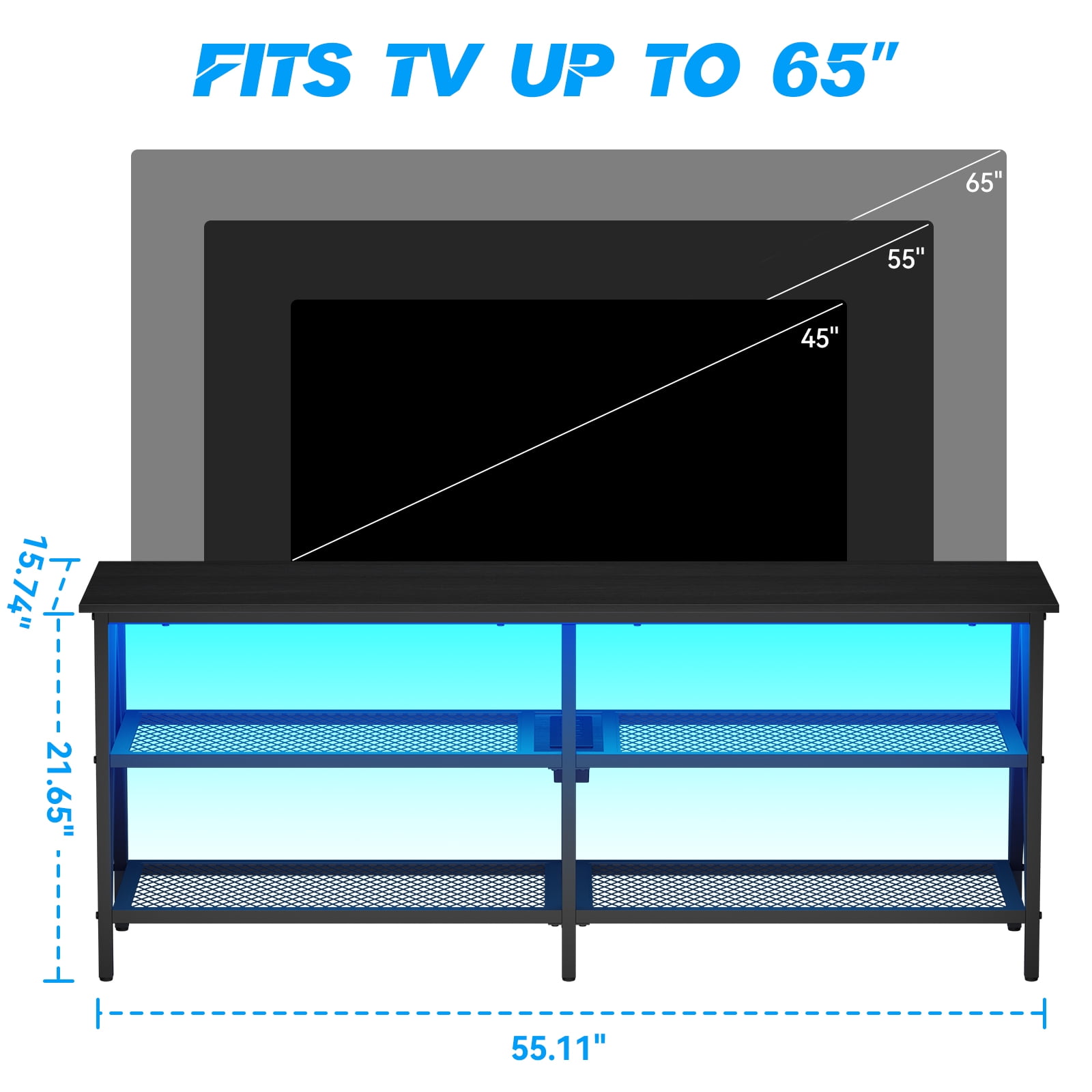 ]TV cabinet is made of high-strength MDF and iron bracket. The iron bracket is sturdy and durable, and the wooden board is waterproof and anti-friction.This TV cabinet is suitable for up to 65 inch televisions.4 Outlets and 2 USB Ports make you can easily charge your game devices like a controller stand or other electrical appliances. The LED lights with 7 colors and 20 dynamic modes let you customize your space. Its rustic styling can pair perfectly with the existing design inspiration of your living room, den, or game room.Cool RGB Led Lights TV stand with 20 main colors and 19 dynamic modes of LED light strips with wireless remote control. You can sit on the sofa and adjust the lighting effect of this TV stand to get a better entertainment experience.