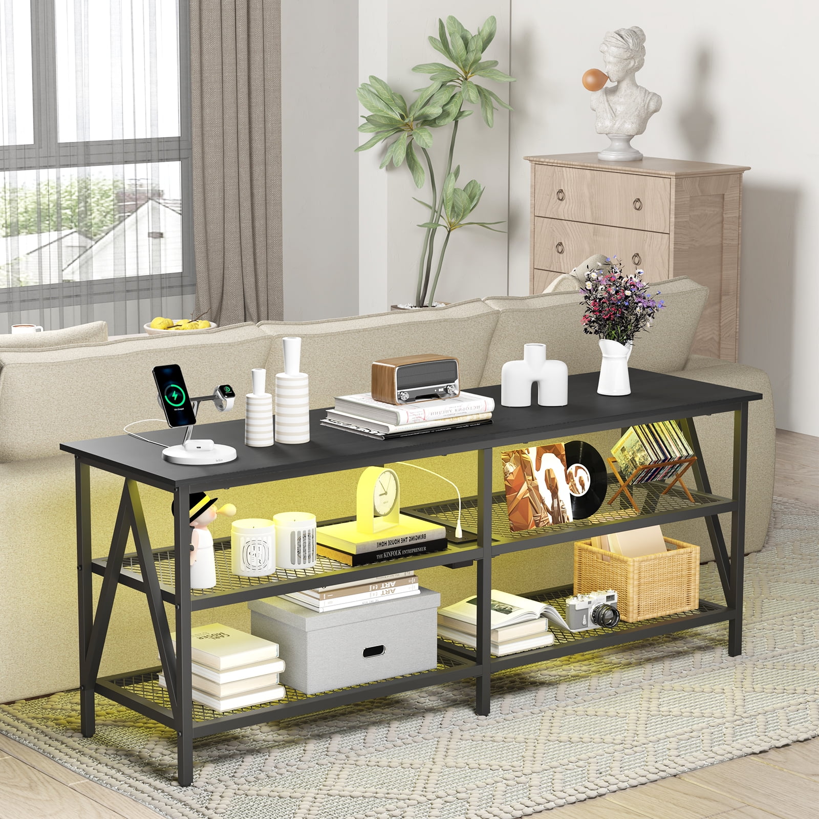 TV Stand with Power Outlets: The television stands overall size is 55″ x 15.7″ x 24.5″ to support TVs for years to come, such as 50/55/60/65 inches TV. 4 standard plug outlets and 2 USB port make it easy to hold and charge your TV, game consoles, DVD collections and other TV components Sturdy Support: This 3 tiers modern TV table is made of strong high-quality particle board and strong metal steel frame, which provides strong stability for the modern TV cabinet. Holds up to 150 lb on top shelf and 30 lb on lower shelves each Entertain Center with Ample Storage: The 63″L top shelf is spacious enough to hold a 75″ television or smaller. Use the middle shelf for media gear and the bottom shelf to store your books, magazines, CDs, remotes, or any other items. The TV cabinet effectively helps you keep your room clean and tidy Industrial Style TV Console: All-match TV stands for your home! Paired with rustic brown shelves and classic matte black iron frame, it is stylish and practical to suit every style of your home decor Easy Assembly TV Table: Equipped with detailed instructions and provided accessories, the media console table is easily to assemble Specifications Color: Rustic Brown, Black Material: Particleboard, Steel Frame Product Size: 55”L x 15.5”W x 24”H Product Weight: 41.6 lb Max. Static Load Capacity of Each Particleboard Shelf: 150 lb Package Contents 1 x TV Stand 1 x Accessory Kit 1 x Instructions