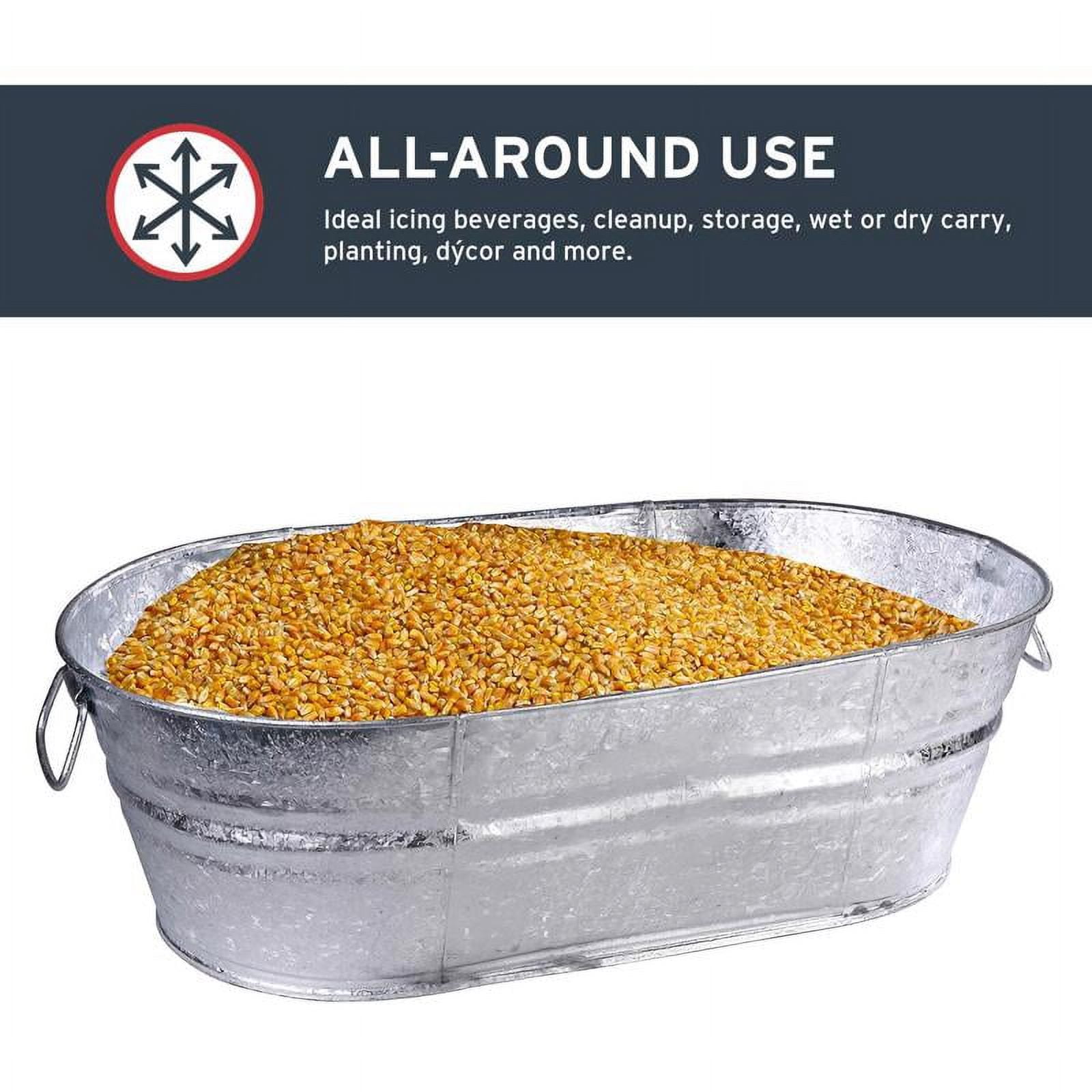 This 10.5 gallon oval tub is perfect for using as a classic planter, garage/shop organization and home/event decor. Rugged enough to be used as a feeder or waterier for animals. This tub is made of durable hot dipped steel, sealed to hold water and has a wire reinforced top rim. Stronger than plastic, this pail won’t absorb odors and is recyclable.