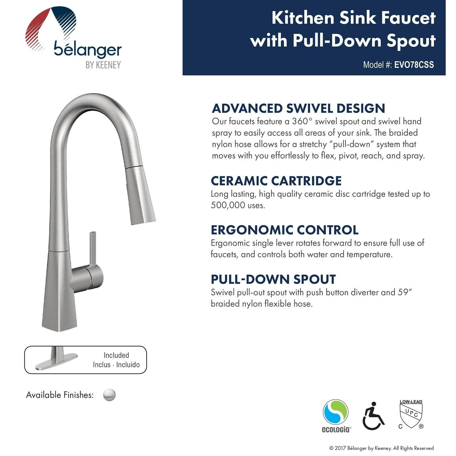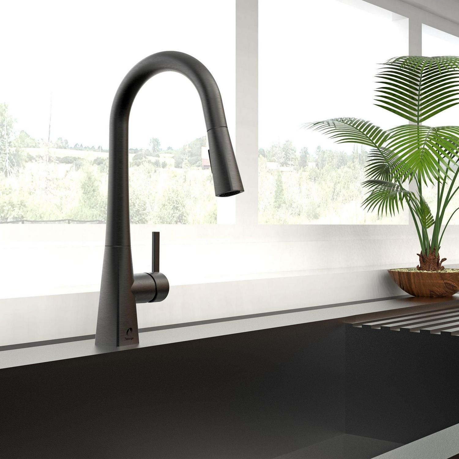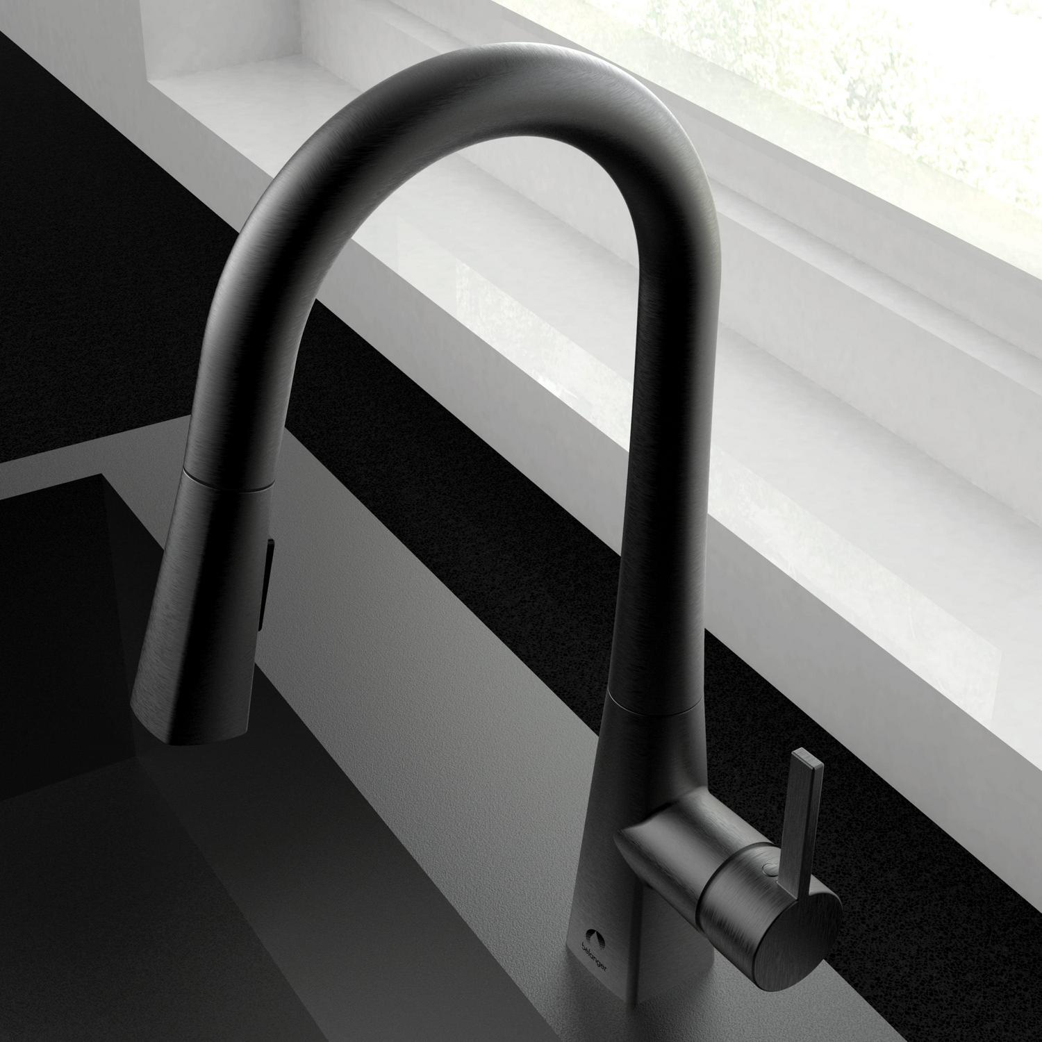 Belanger faucets are beautifully designed to improve your home as part of our designer collection. The combined square and rounded shapes that create the Evolution single handle pull out kitchen faucet offer a simple and contemporary look. The durable ceramic cartridge, metal exterior shell, and brass waterways ensure long-lasting and maintenance-free use. Its black stainless steel finish complements the style of almost any kitchen while its easy docking technology provides convenient docking of the hand spray. It has a forward rotating lever handle and swivel pull-down spout with push-button diverter for two-function water flow: stream or spray. The included cover plate allows for single or 3-hole installation. With its elegant transition from square lines to soft round shapes, this faucet is exactly the collection you need to renew your kitchen. You can install with confidence knowing Belanger products are backed by a limited lifetime warranty.