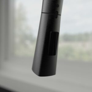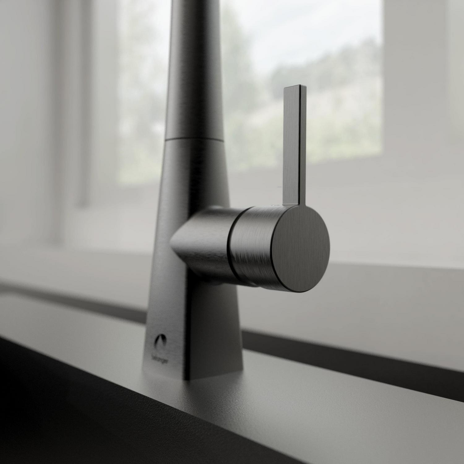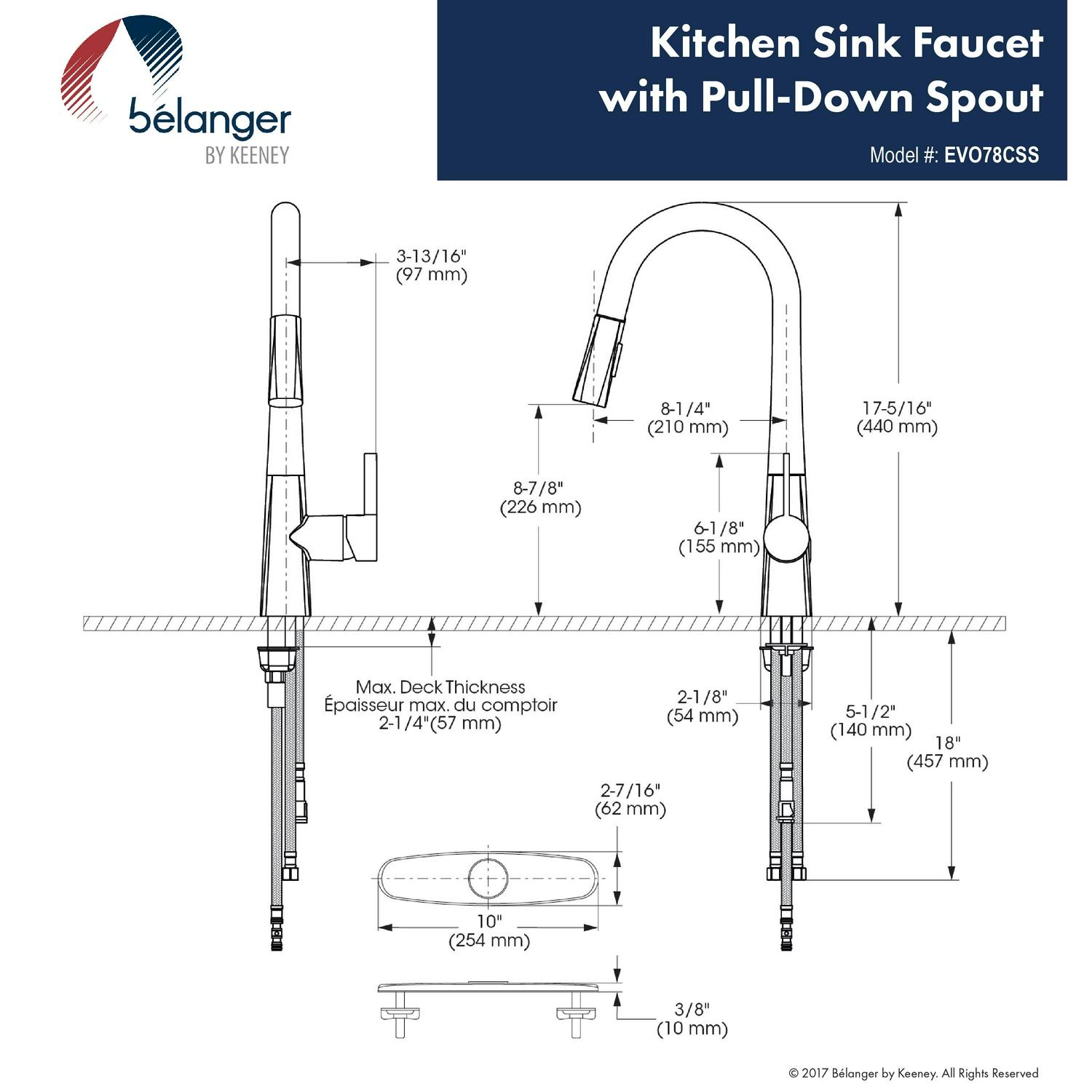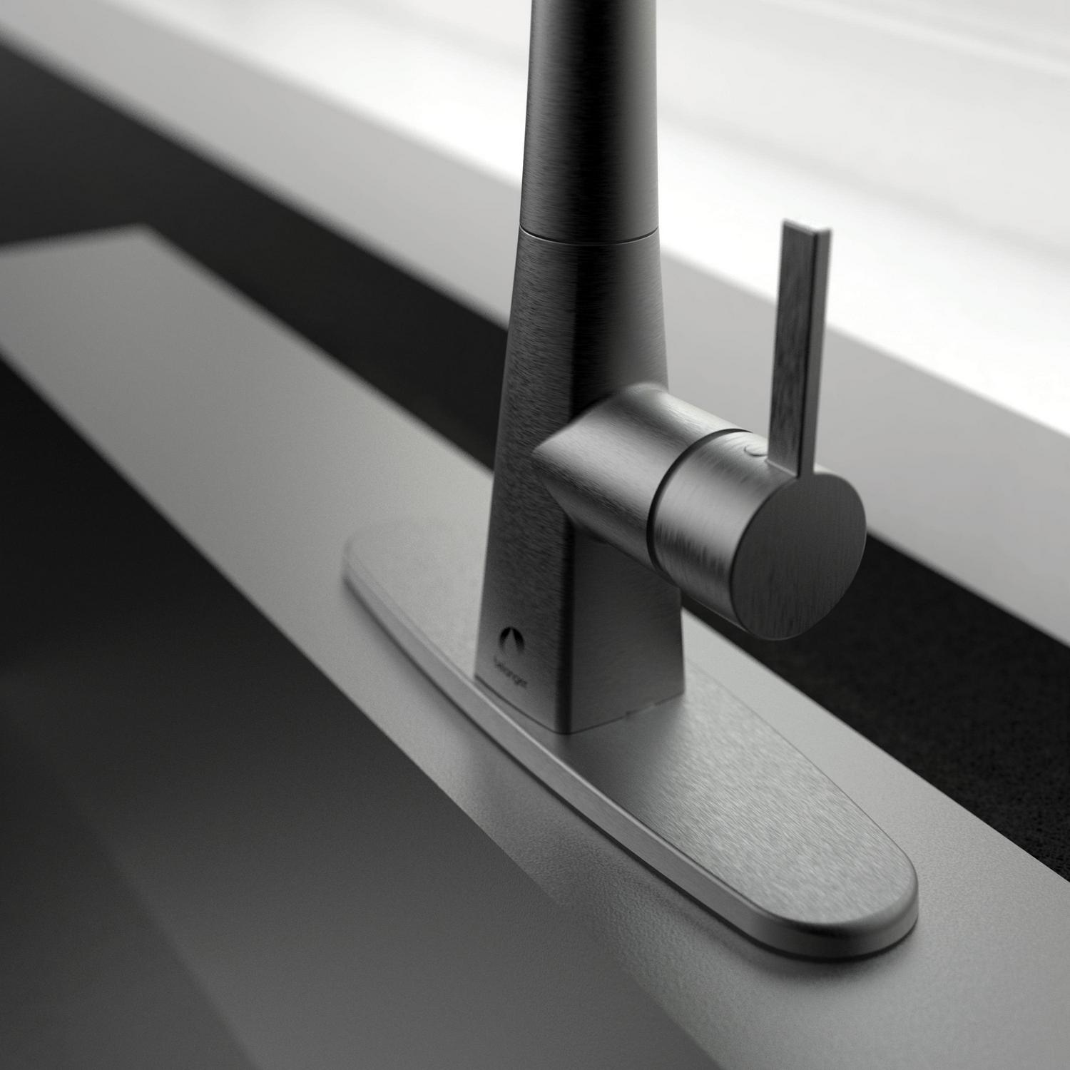 Belanger faucets are beautifully designed to improve your home as part of our designer collection. The combined square and rounded shapes that create the Evolution single handle pull out kitchen faucet offer a simple and contemporary look. The durable ceramic cartridge, metal exterior shell, and brass waterways ensure long-lasting and maintenance-free use. Its black stainless steel finish complements the style of almost any kitchen while its easy docking technology provides convenient docking of the hand spray. It has a forward rotating lever handle and swivel pull-down spout with push-button diverter for two-function water flow: stream or spray. The included cover plate allows for single or 3-hole installation. With its elegant transition from square lines to soft round shapes, this faucet is exactly the collection you need to renew your kitchen. You can install with confidence knowing Belanger products are backed by a limited lifetime warranty.