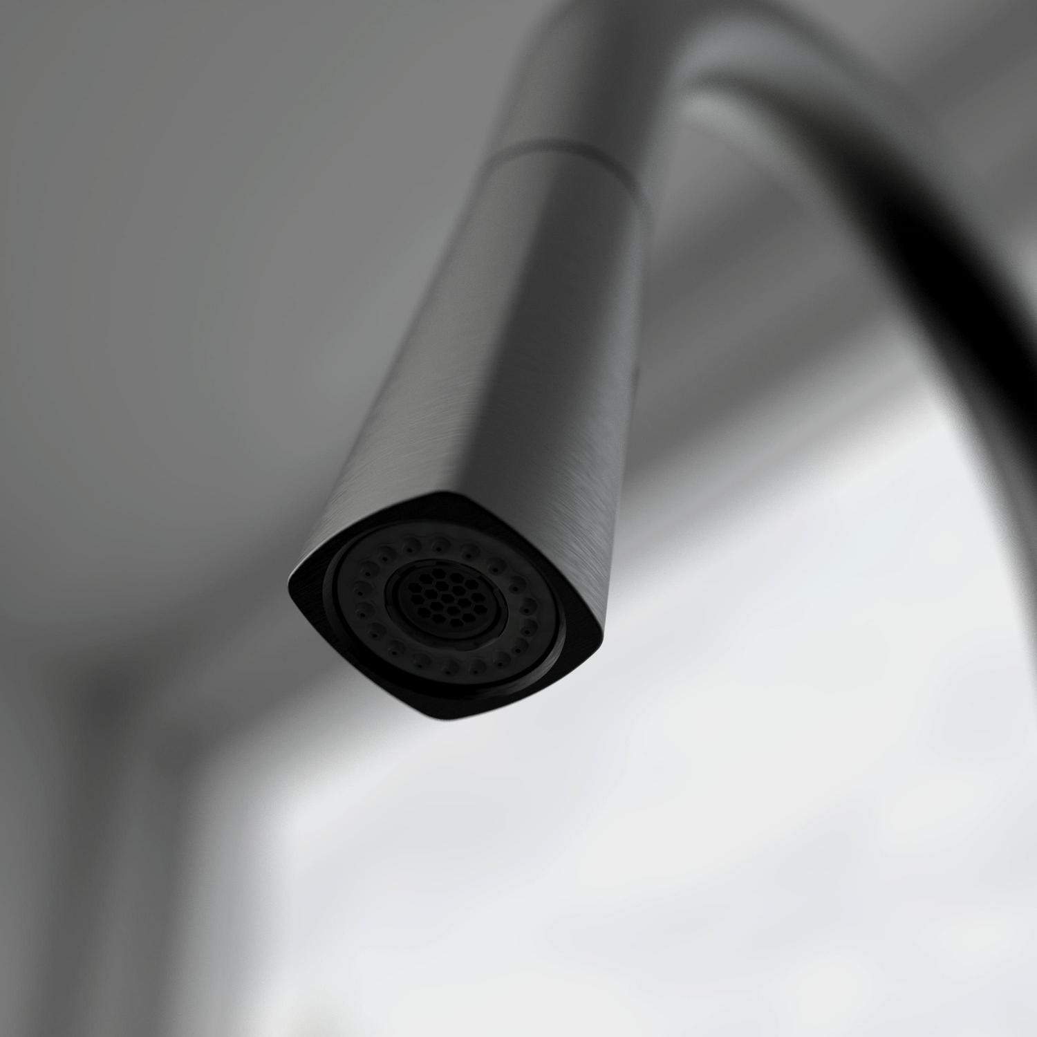 – Swivel pull-down spout with push-button diverter (stream and spray jets)