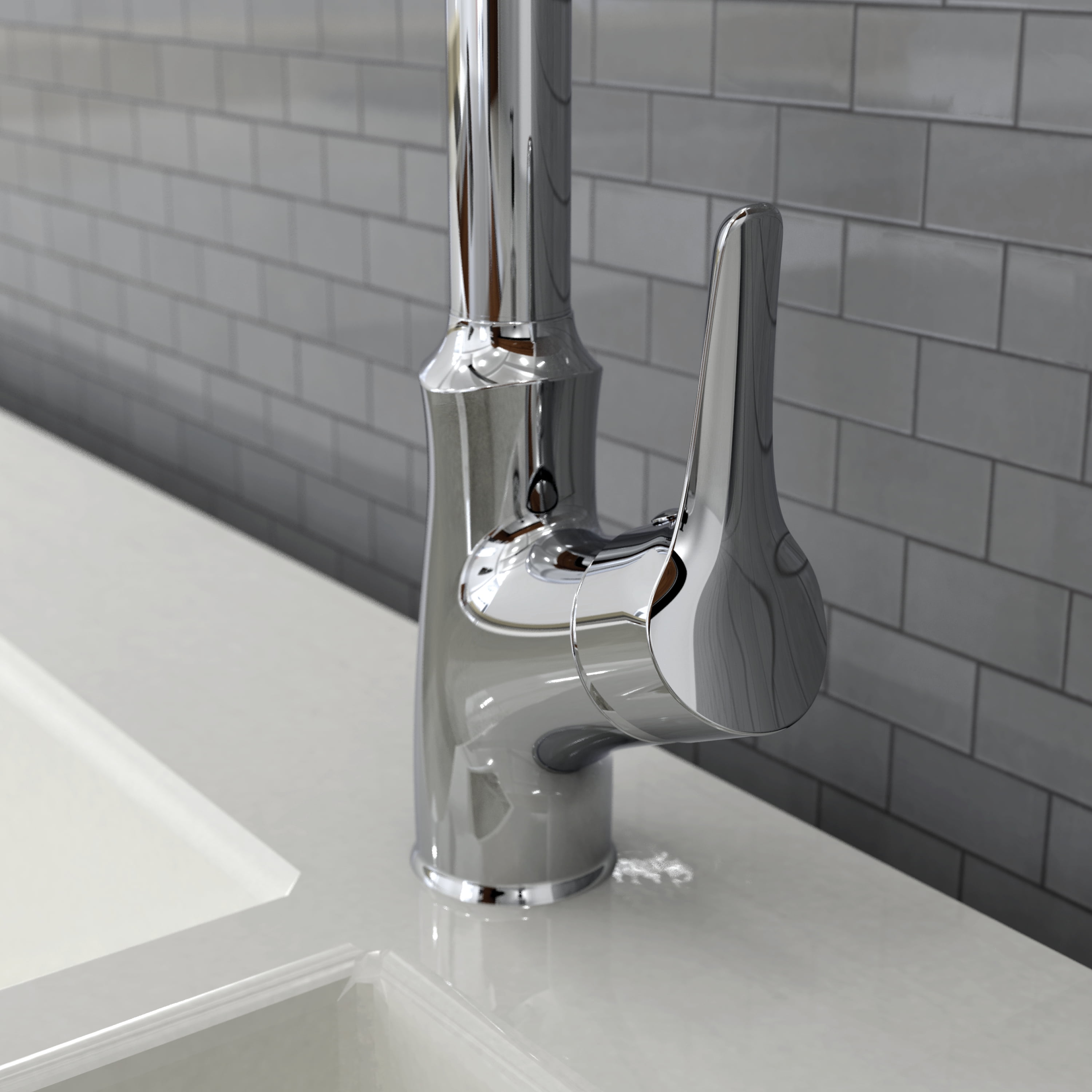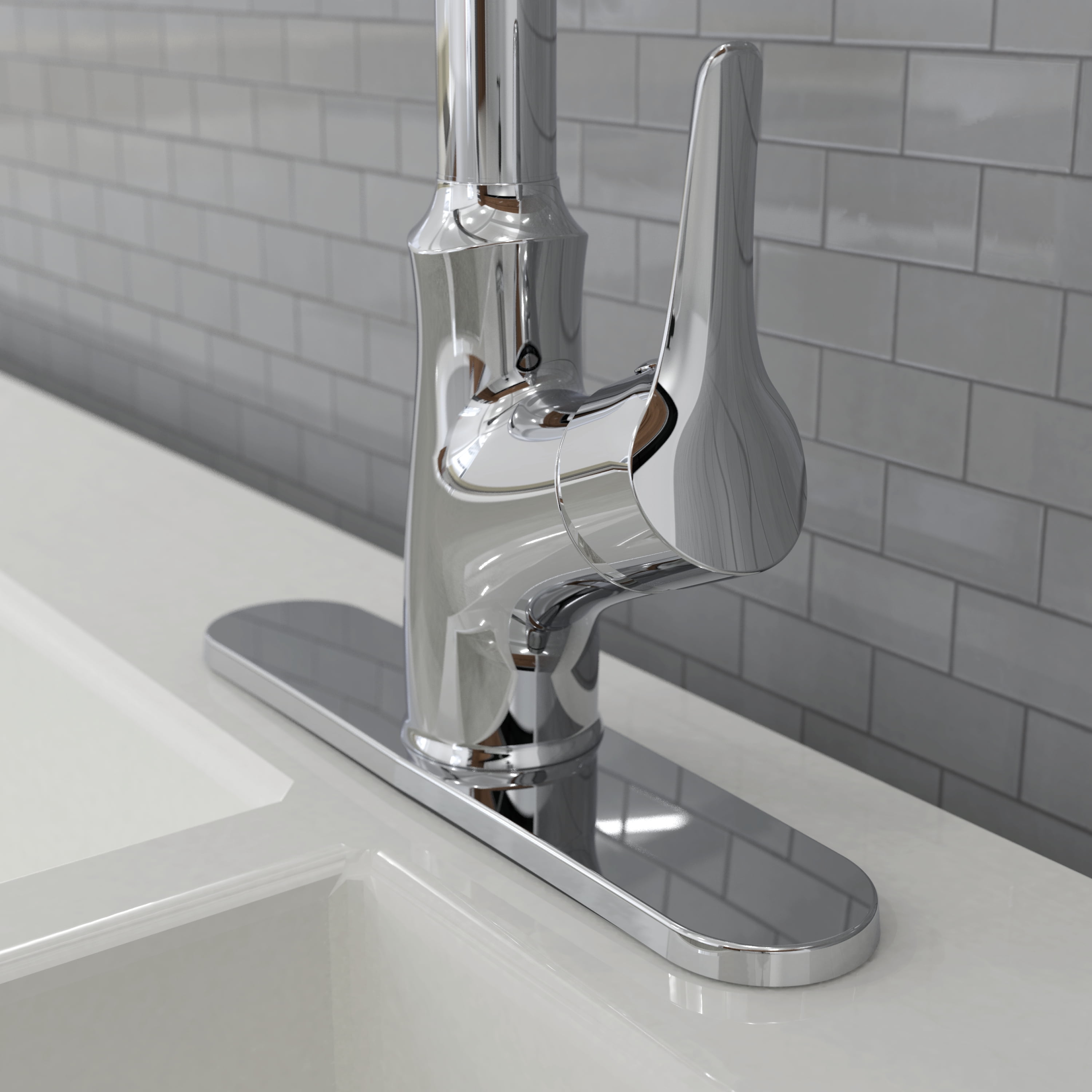 Swivel pull-down spout with push-button diverter (stream and spray jets) Flexfit with optional matching cover plate for single or 3-hole sink installation Durable metal exterior shell for long-lasting use High-quality ceramic disc cartridge ensures maintenance-free use Easy Klik Connection and QUICK LOCK setup for fast installation Forward rotating single lever handle for water and temperature control Soft, easy-to-clean silicone nozzles 59-in. braided nylon flexible hose Flow rate of 1.8 GPM meets green building standards Elevated finish to match existing kitchen fixtures cUPC Low Lead and ADA complaint Limited Lifetime Warranty
