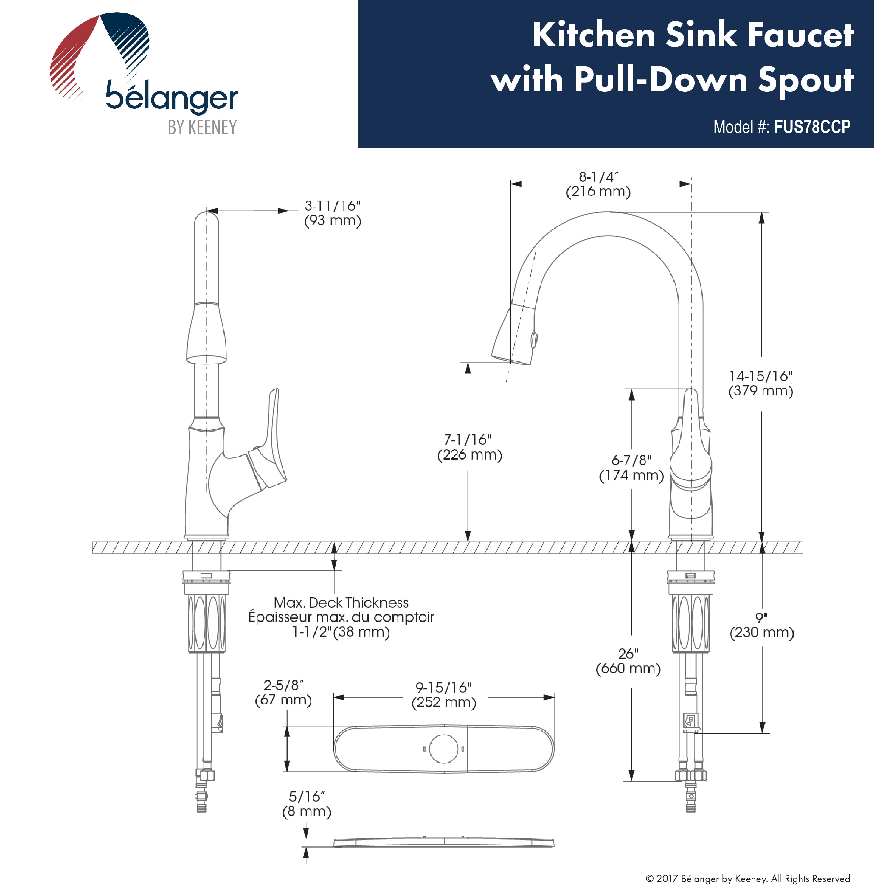 Belanger faucets are beautifully designed to improve your home as part of our designer collection. This single handle pull down kitchen faucet is an elegant addition to your home offering a modern look at an affordable price. This stylish metal exterior shell hybrid waterway faucet features a dual spray pattern swivel spout and a forward rotating handle. With a matching deck plate included the faucet can fit single or 3-hole installations. It includes QUICK LOCK installation system so no tools are needed with its easy snap on locking mechanism to make faucet installation quick and easy. You can install with confidence knowing Belanger products are backed with a Limited Lifetime Warranty.