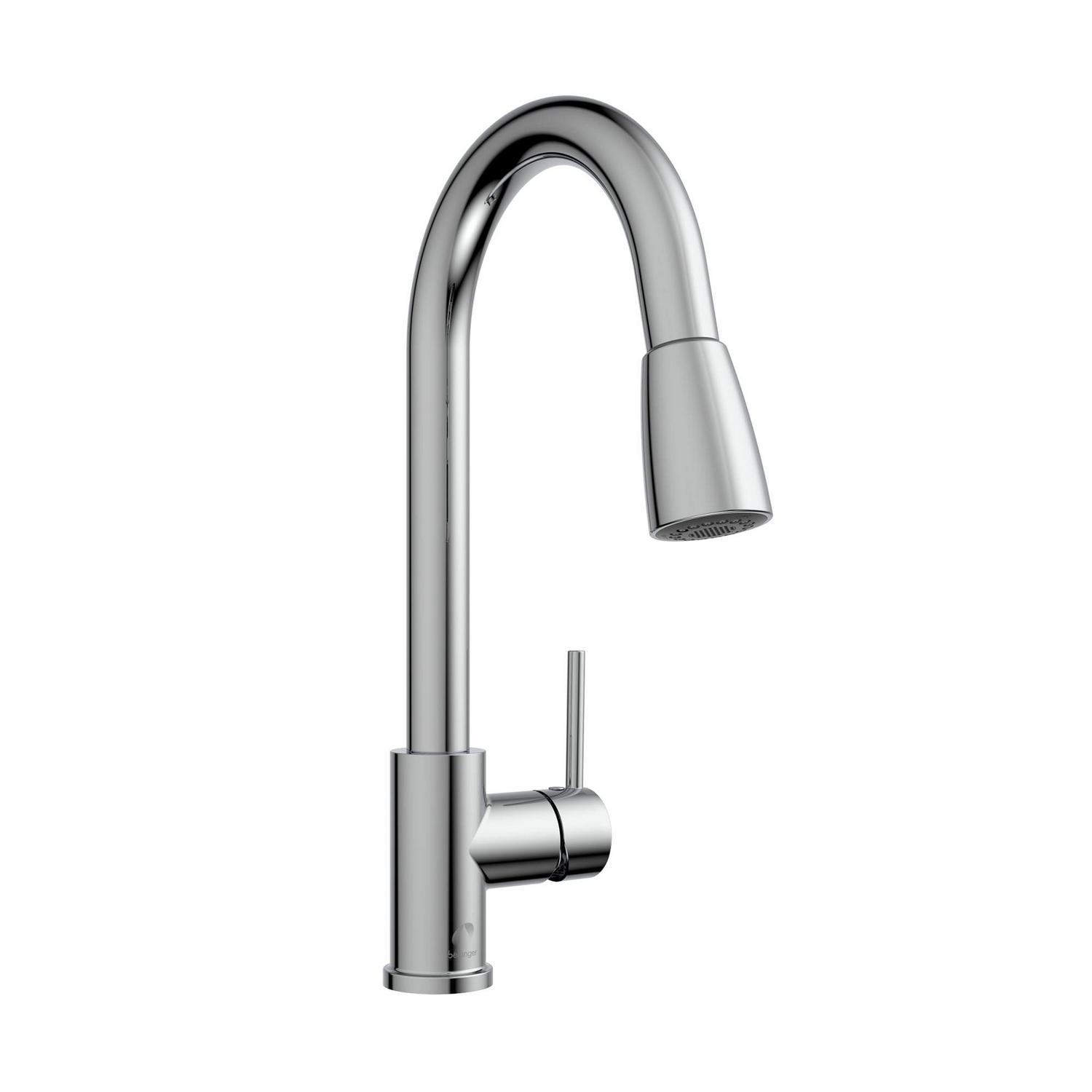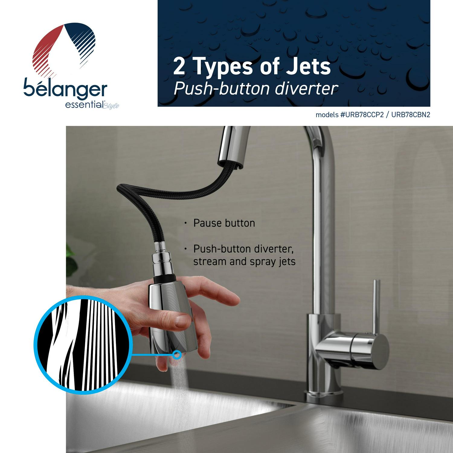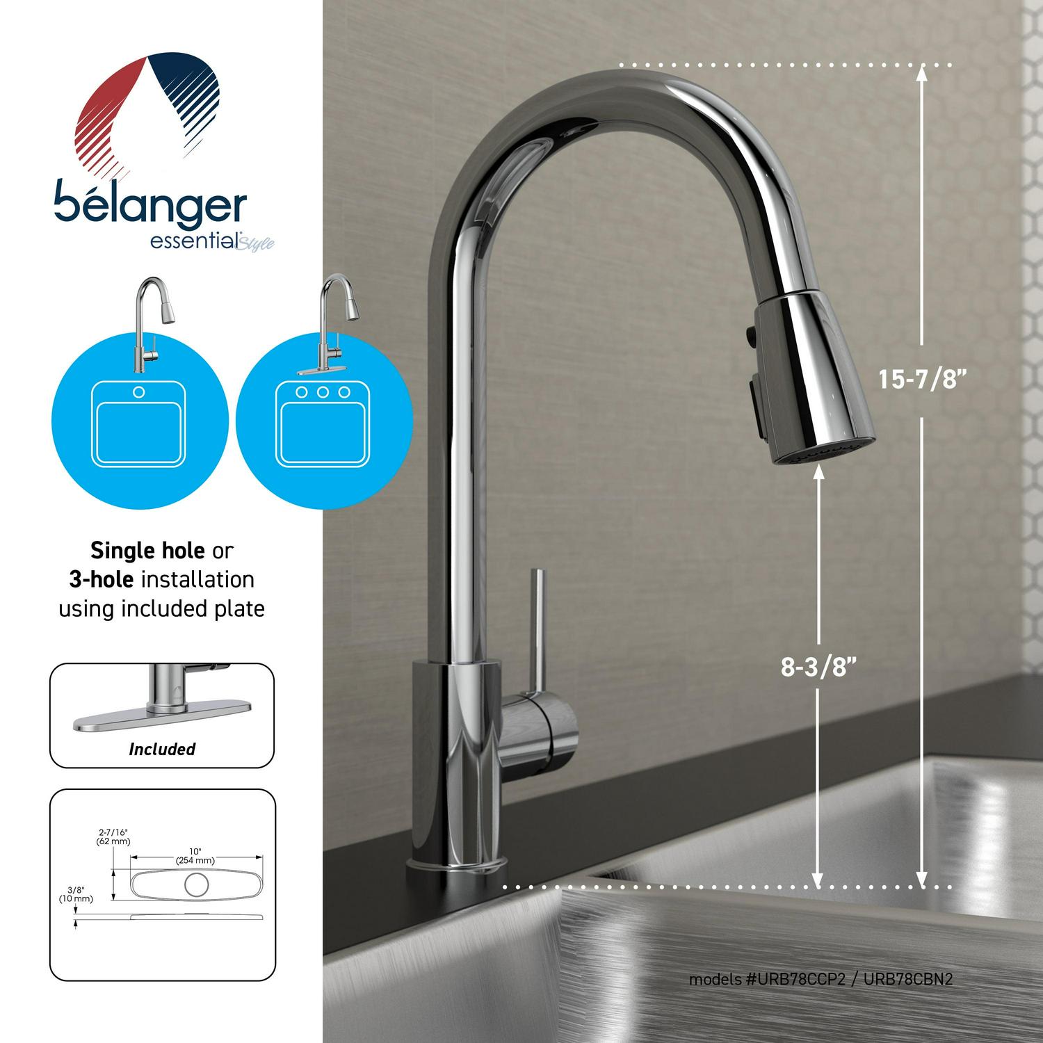 Belanger faucets are beautifully designed to improve your home as part of our designer collection. The Urbania s high arc and curved lines create a sleek look to elevate any household style. This kitchen faucet features a swivel pull-down spout and matching cover plate for single or 3-hole sink installation. It includes a push-button diverter for stream or spray jet selection with a pause button to halt water flow without affecting your preferred temperature setting. Its high-quality metal construction, brass waterways, and ceramic disc cartridge ensure maintenance-free use for years to come. The nozzle maintains a 1.8 GPM flow rate and has easy-to-clean nozzles so you can wipe away build-up from hard water or lime scale. Available in polished chrome and brushed nickel, the Urbania will add a modern touch to your home. You can install with confidence knowing that Belanger faucets are backed by a Limited Lifetime Warranty.