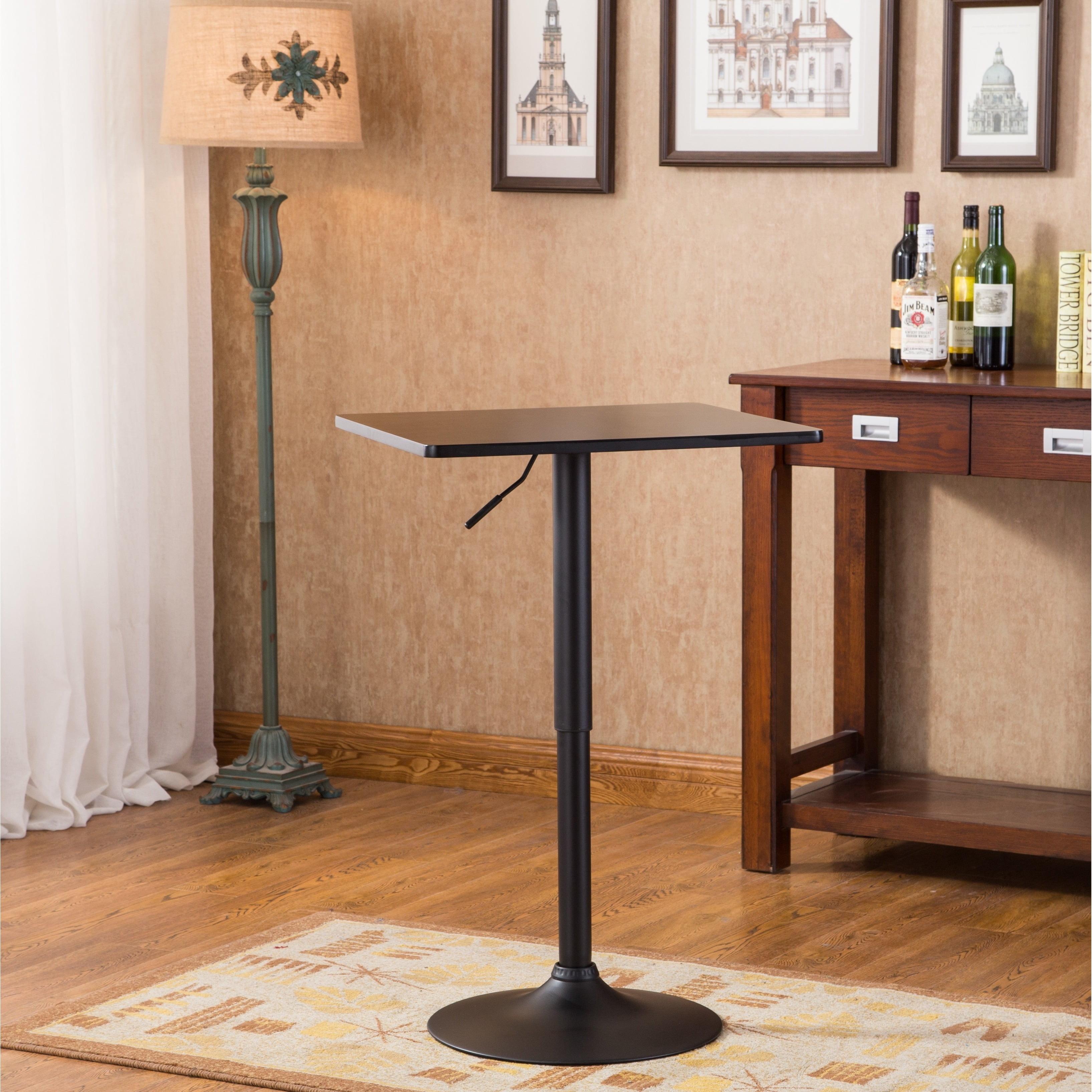 Smart and sleek, the Belham Square Adjustable Height Bar Table offers a world of stylish versatility. Hydraulics allow the table to be Usable as an intimate table for two or a bar table at a party!. Features : Hot, sleek and incredibly fashionable and fun, this Adjustable Table is a must have for the modern home Features an adjustable pneumatic, gas-lift mechanism, table height adjustable from 26″-36″ Black finished top and base. Dimensions: Table size: 24″ DIA x 26″-36″H; Base: 17.7″ Some assembly needed, Photo may be slightly different from the actual Item in terms of color due to the monitor’s display Specifications : Material : MDF, Metal Assembly Required : Yes