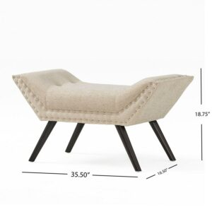 The Rosalynn fabric ottoman/bench is a contemporary piece that will easily add elegance to your home. Available in almond beige, blue/green and granite fabric, this bench features slightly angled ends that create a modern look, with a tufted top and studded accents.