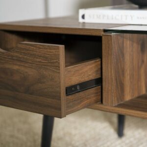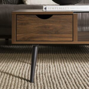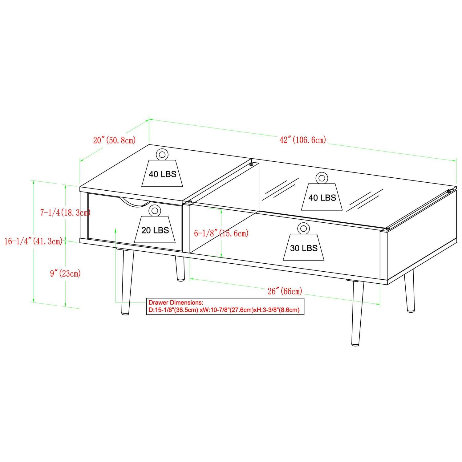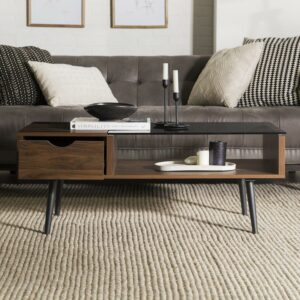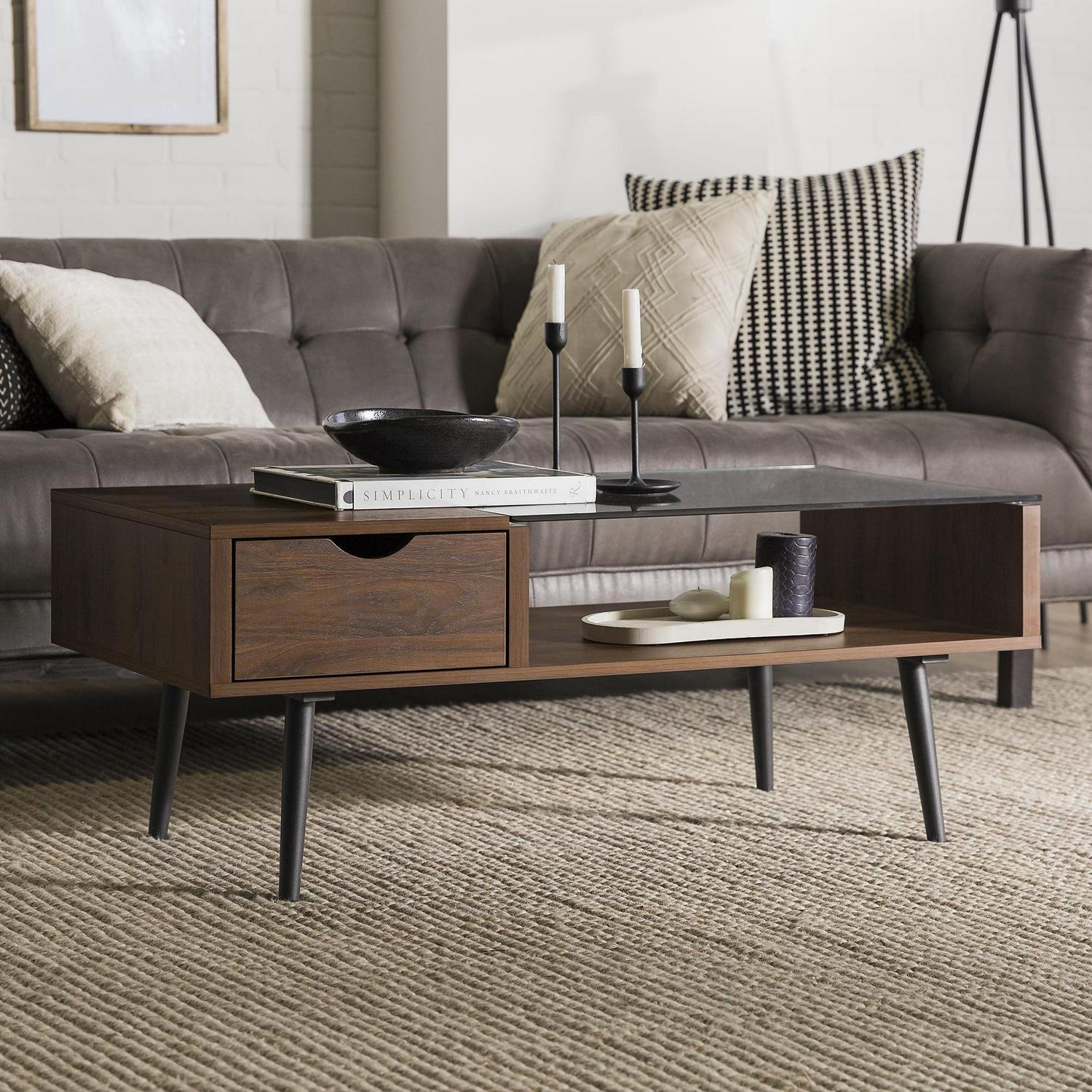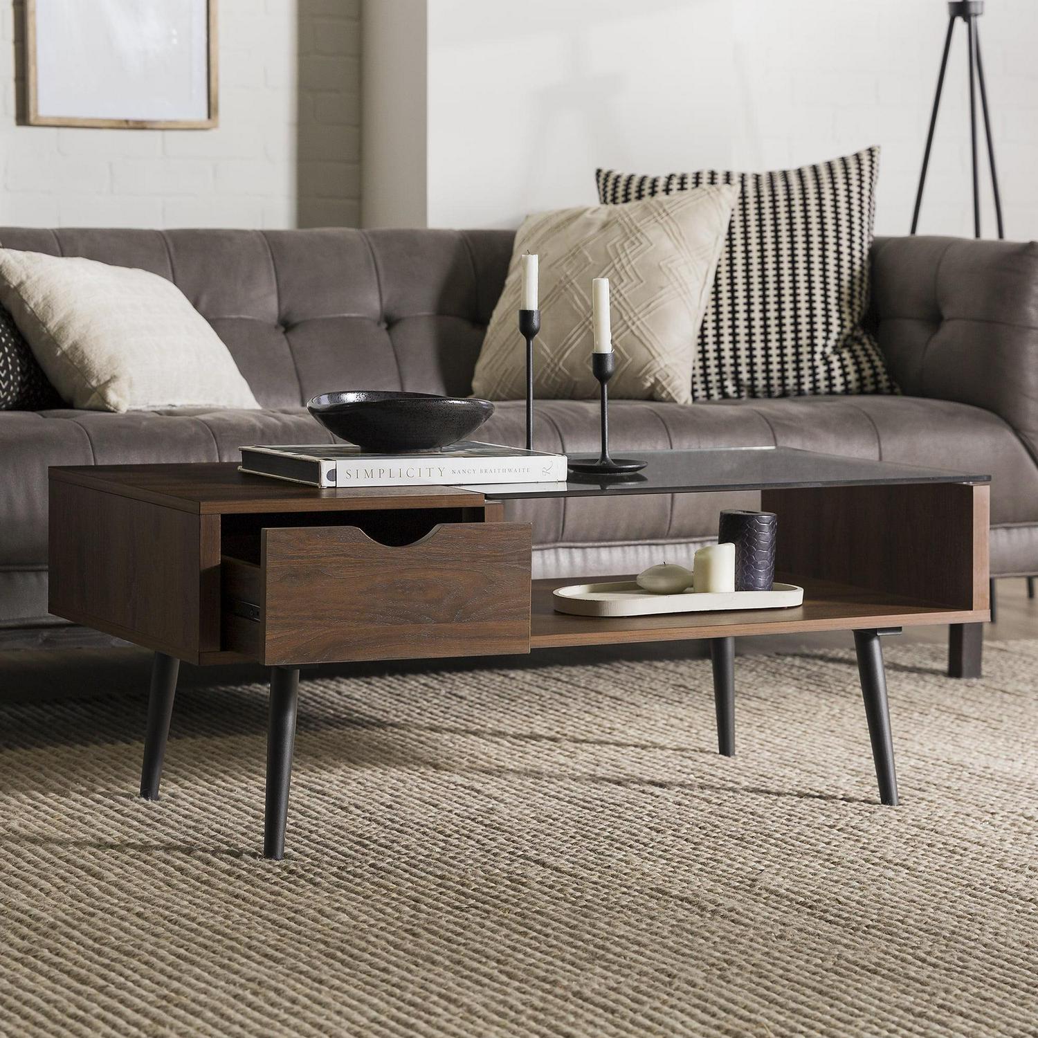 Incorporate the Booker Single Drawer Coffee Table by Bellamy Studios into your living room to hit the right notes of style and function. Sleek metal tapered legs create the base of this mid-century inspired accent table. Each leg also includes rubber feet so you don t have to worry about your floors. Choose from either a tempered glass or a faux white marble table top for this small space friendly cocktail table that s great to entertain around. This mixed material rectangular coffee table has both open and closed storage. There is one fully finished drawer that is only accessible from one side and there is also a cubby that s open to both sides where you can tuck away games, remotes, or the book you re reading.