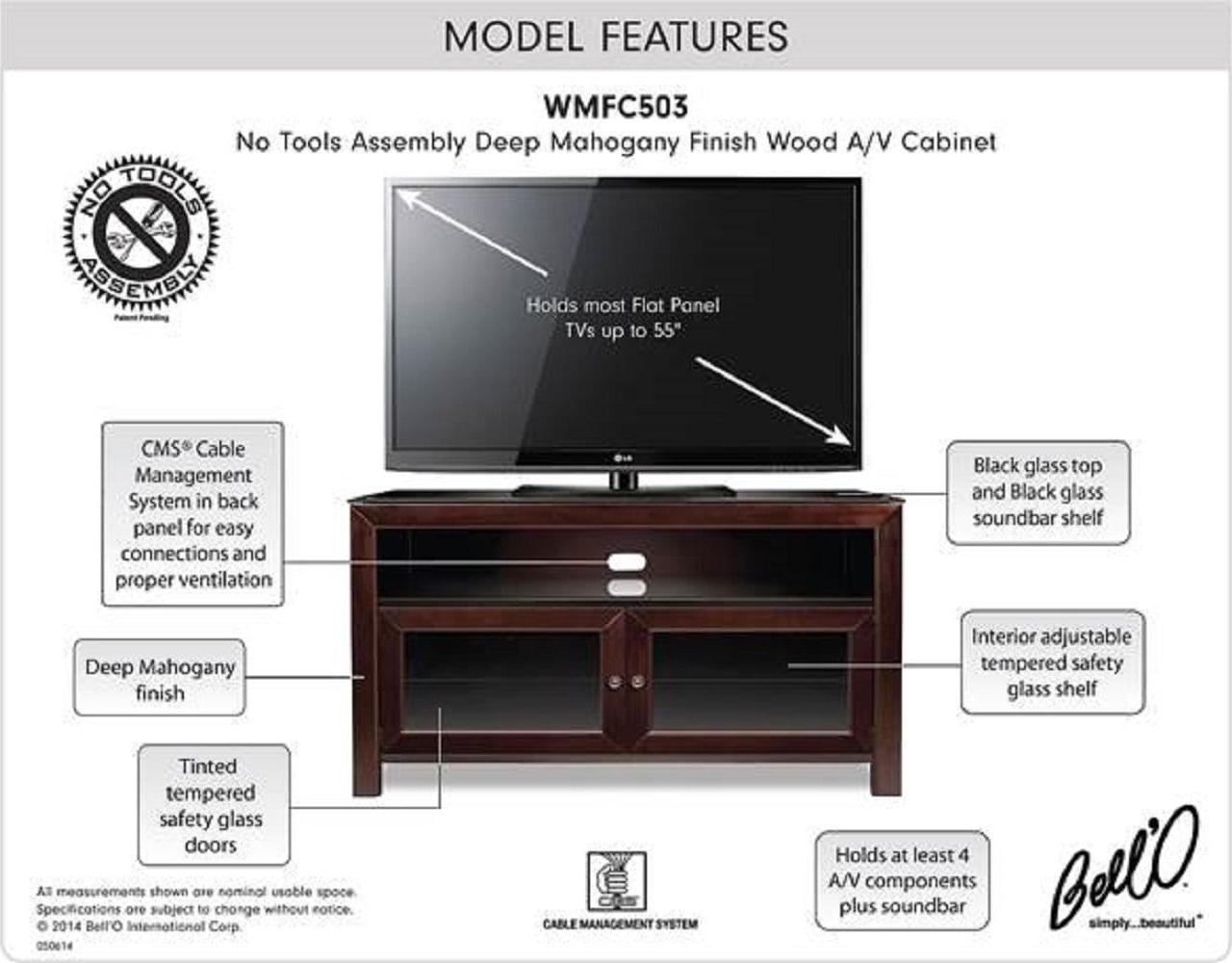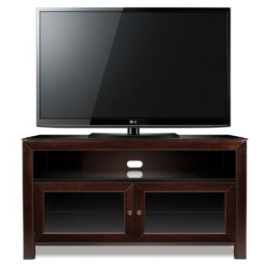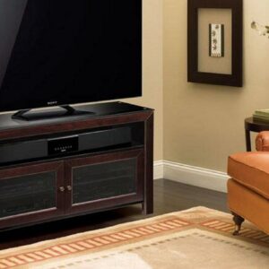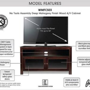 With versatility, functionality, and clean lines, this 50″ TV stand can accommodate most flat screen TVs up to 55″ or up to 100 lbs., and up to 6 audio video components. It features wood in a beautiful Deep Mahogany finish, and a strong steel frame in a black scratch resistant finish. It features dark tinted tempered safety glass door panels for semi-concealed storage that still allows for operation of components with a remote control. An integrated CMS Cable Management System hides and routes wires and cables while internal slots provide proper air circulation for convection cooling of your components. This TV stand assembles in minutes.