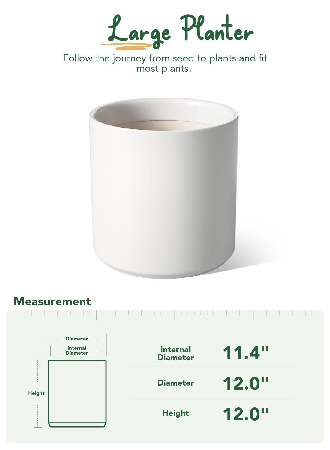 12 inch Large Ceramic Plant Pot Mid-Century Modern Planter Flower Pot with drainage hole and Plug Planter Pot for Home, Garden & Patio Easy Maintenance & Temperature Resistance Features Optimal Dimensions: This planter boasts a diameter of 12 inches, striking the perfect balance for your indoor foliage. Its ample size accommodates larger plants or multiple smaller ones, elevating your space with verdant vitality. Authentic Ceramic Craftsmanship: Crafted from genuine ceramic, our 12-inch planter pot stands out for its durability, a far cry from many synthetic alternatives like fiberstone. Resistant to fading, warping, and corrosion, this flower pot ensures enduring protection for your plants. Complete with Drainage system: Whether you prefer a well-drained environment or moisture retention, our indoor plant pots caters to your needs. Utilize the silicon plug to prevent leaks or apply the mesh pad to maintain soil integrity, promoting optimal air circulation for your plants. Versatile Functionality: From succulents to herbs, flowers to towering palm trees, this ceramic plant pots for plants accommodates a wide array of flora. Its suitability for outdoor settings also makes it an ideal addition to your garden or patio. Smooth Aesthetics, Effortless Care: The planter’s minimalist design exudes sophistication, effortlessly enhancing any space. Its neutral hue seamlessly complements any decor scheme in the living room or bedroom. Cleaning is a breeze with its smooth ceramic surface? just a gentle wipe with a damp cloth keeps it pristine. Specification: Brand: BEMAY Product: Large Plant Pot Color: White Item Number:1 Assembled Product Dimension: 12″D x 12″W x 12″H Assembled Product Weight: 14.9 lb Material: Ceramic Special Feature: Drainage Hole, Weather Resistant, Decorative Planter; Patio Decor; Gift for Planting Lovers Package List: 12″ Plant Pot*1 Mesh Circle*1 If you need more different flower pots, welcome to the BEMAY Store! Click Here: Visit the BEMAY Store There are many different types of planters to pick from, so there’s always one for you!