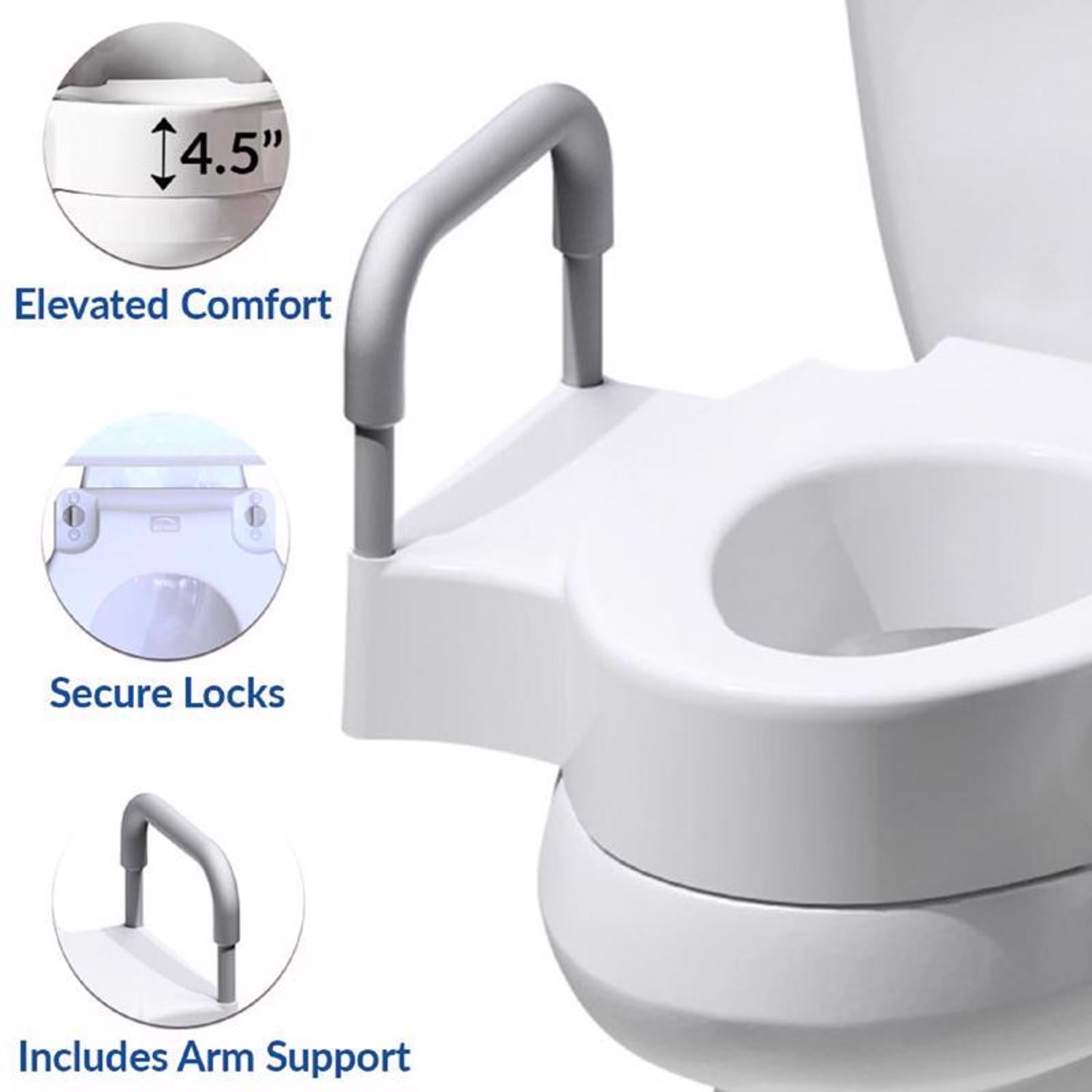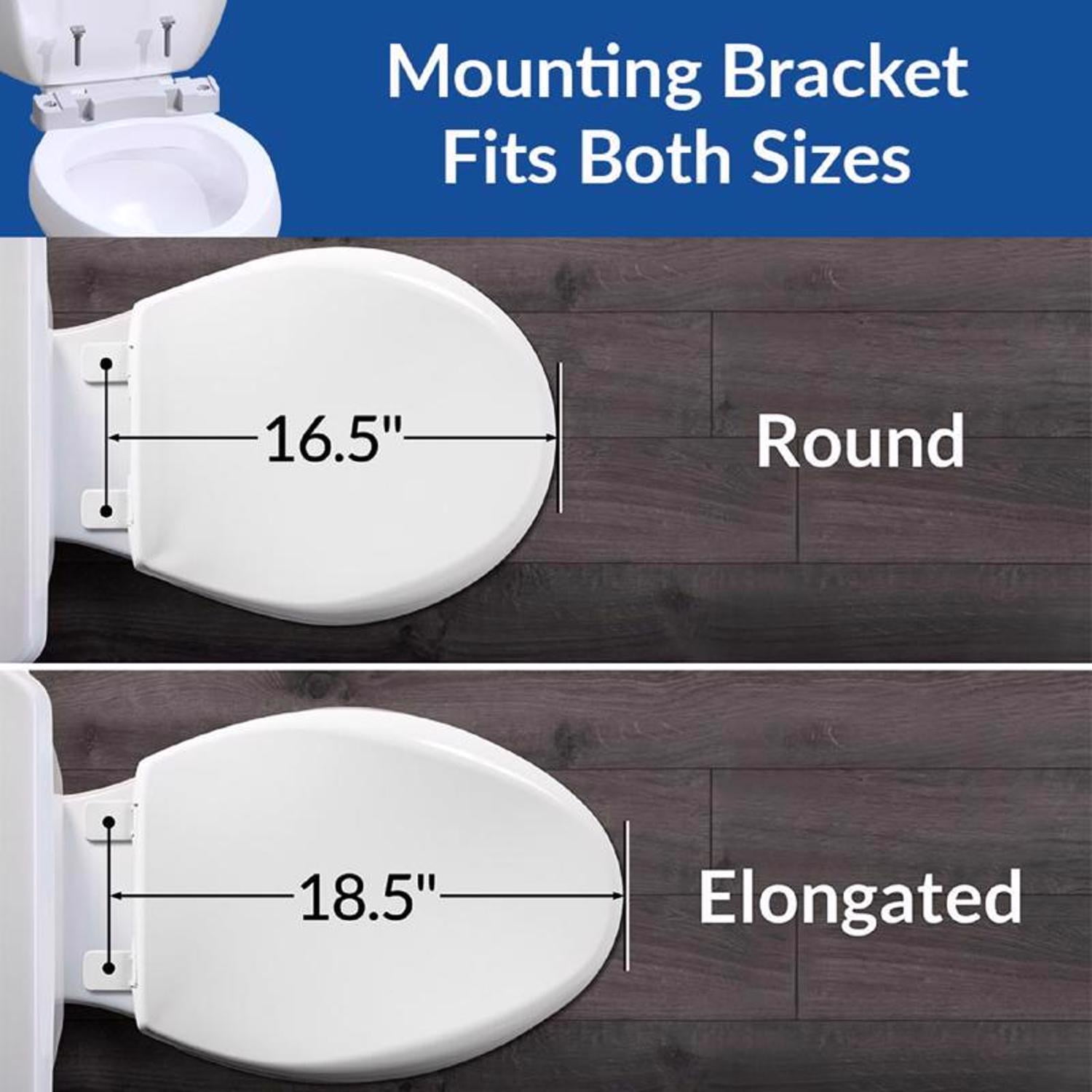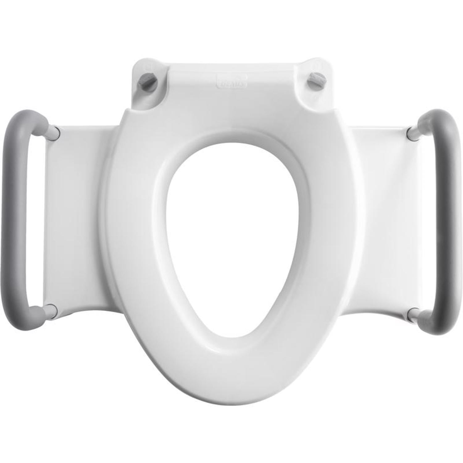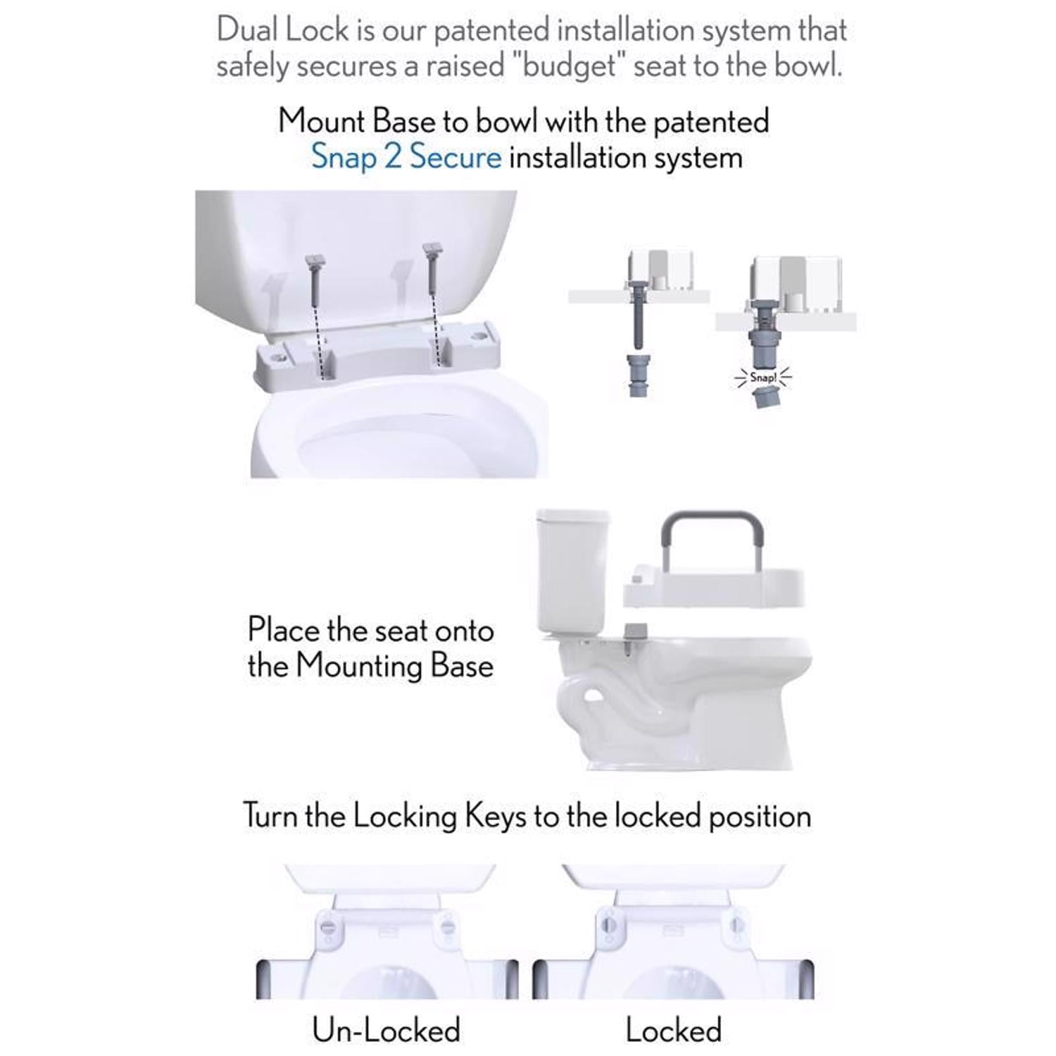 Dual Lock Security, seat will not wiggle or loosen with use Adjustable Mounting Base allows the seat to fit both round & elongated toilets Support arms included, tested to 200 lbs. each side Ring hole is elongated size for personal hygiene access and comfort Seat has a smooth, glossy surface that is easy to clean Unlock the seat from the Mounting Base for Easy Cleaning