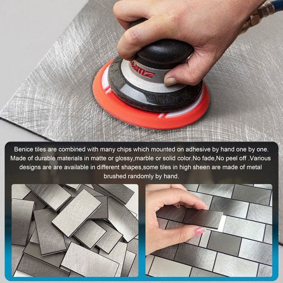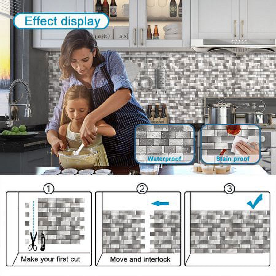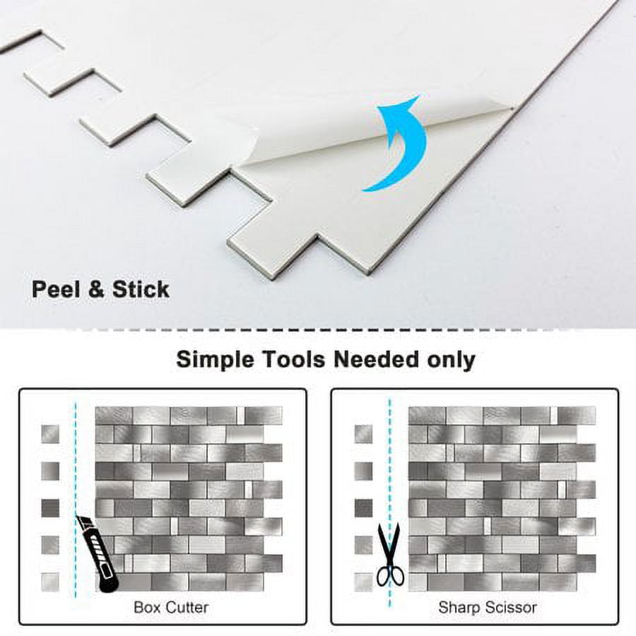 Peel and Stick Tile Metal Mosaic Get the look of wall tile with a metal peel-and-stick version you install yourself for an instant kitchen or bathroom upgrade.BeNice metal peel and stick tiles are your ideal choice of Peel and Stick Backsplash for Easy Kitchen Updates. They are made from aluminum composite,water-resistant,heat resistant, with realistic 3D effect.Just peel off the backing and stick the tile backsplash on the wall. The best gray peel-and-stick backsplash is also super-low maintenance—just wipe with a damp rag to clean. Kindly Remind Don’t use any abrasive cleaner in case scratch on surface.