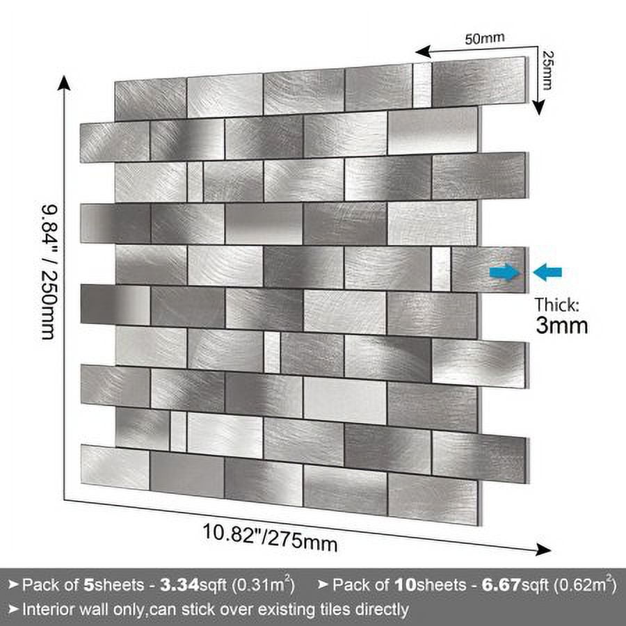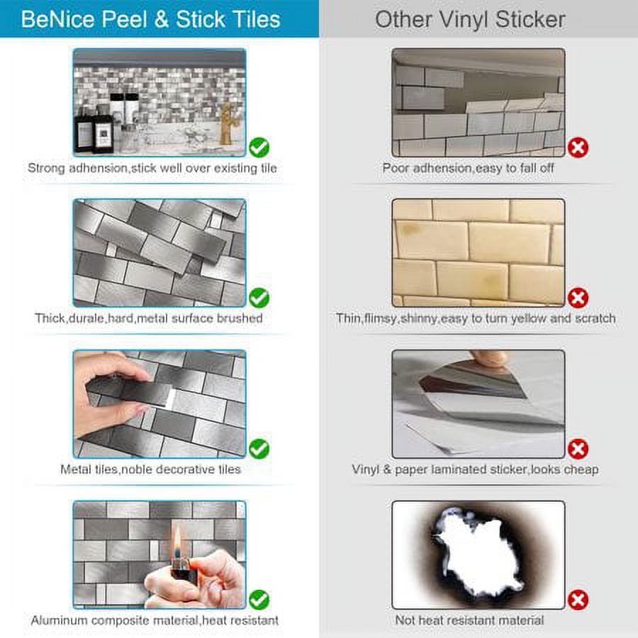 【Metal Gray Peel and Stick Backsplash】Made of aluminum composite,eco-friendly material resistant to heat and moisture.Medium subway tiles,surface are brushed and coated with protection. 【Easy Install Self Adhesive Backsplash】Simple and easy to install,interlocking tiles,just peel and stick,no grout and professional contractor required. 【Strong Adhesion Peel and Stick Mosaic Tile】Superior sticky tiles,can stick over directly existing tiles or smooth surfaces,such as painted wall,cement wall,wood,metal,etc. 【Wide Applications in Wall Decor】The BeNice peel and stick tiles are perfectly used in Kitchen island walls, bedroom walls, bathroom backsplash, laundry room, Washbasin,RV kitchen backsplash,fireplace exterior,etc. 【Easy to Clean and Maintain 】Easily wipe to remove stains,use kitchen mild cleanser.Use heavy duty scissor and utility knife or chop saw to cut it.