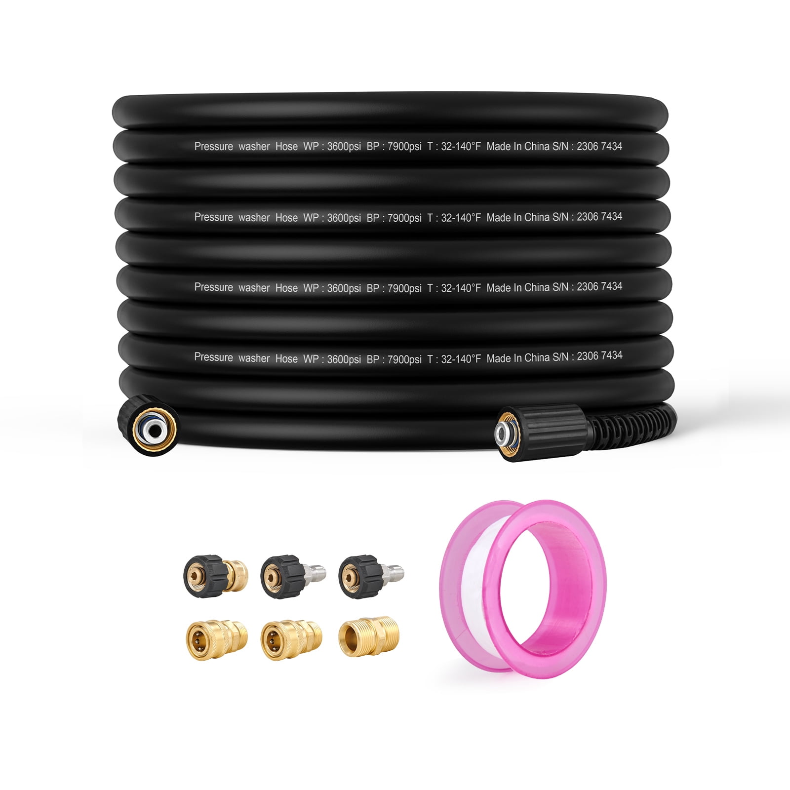 Blast Grime Away: Do you need to spray further? The pressure washer hose delivers max. 4200 PSI pressure and an intense water flow that effortlessly tackles tough dirt, grime, and stains. The temperature range is 32-140 °F / 0-60℃. The pressure washer hose allows you to extend your cleaning reach. Wide Compatibility: Our 1/4” pressure washer hose is equipped with an M22-14 mm threaded connector, made of solid brass. These connectors are thicker and heavier, ensuring a secure and leak-free connection to your pressure washer. The hose is designed to fit most brand power washers. 3-Layer Material: Our high pressure washer hose has a 3-layer structure made of PVC and polyester, which is abrasion and aging resistant. It can withstand the rigors of high-pressure water and heavy use, allowing for prolonged use in outdoor settings. Kink-resistant Water Hose: The hose has a bend radius of 4.3 inches, making it easy to stretch, roll up, and carry. Its high flexibility eliminates the need to frequently loosen the hose to restore water flow, allowing for more efficient cleaning without interruptions. Multiple Use: Ensures compliance with RoHS standards while cleaning cars, motorcycles, floors, windows, driveways, roofs, and swimming pools. Our pressure washing hoses provide a healthier, safer, and more efficient cleaning experience, ultimately saving you valuable time and energy.