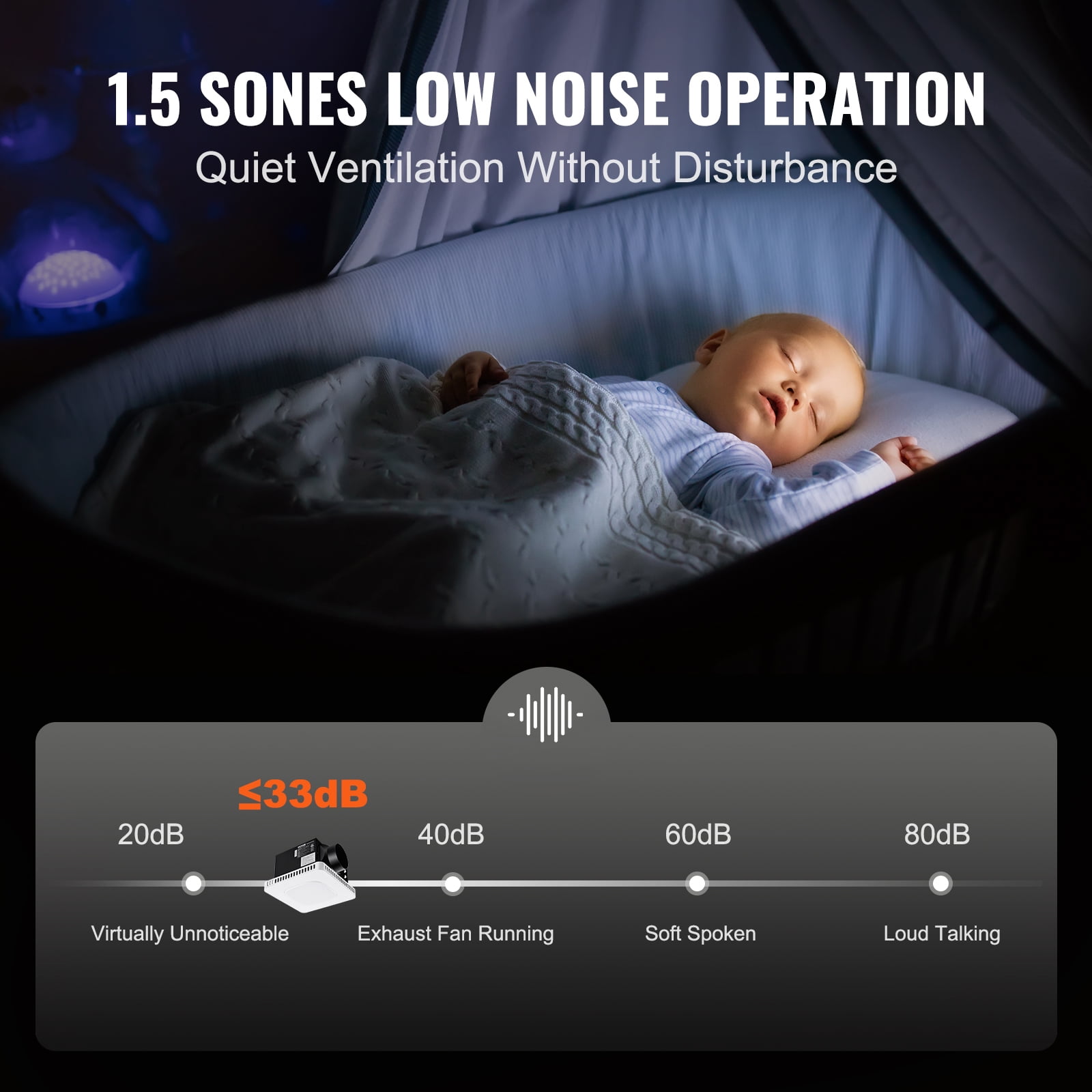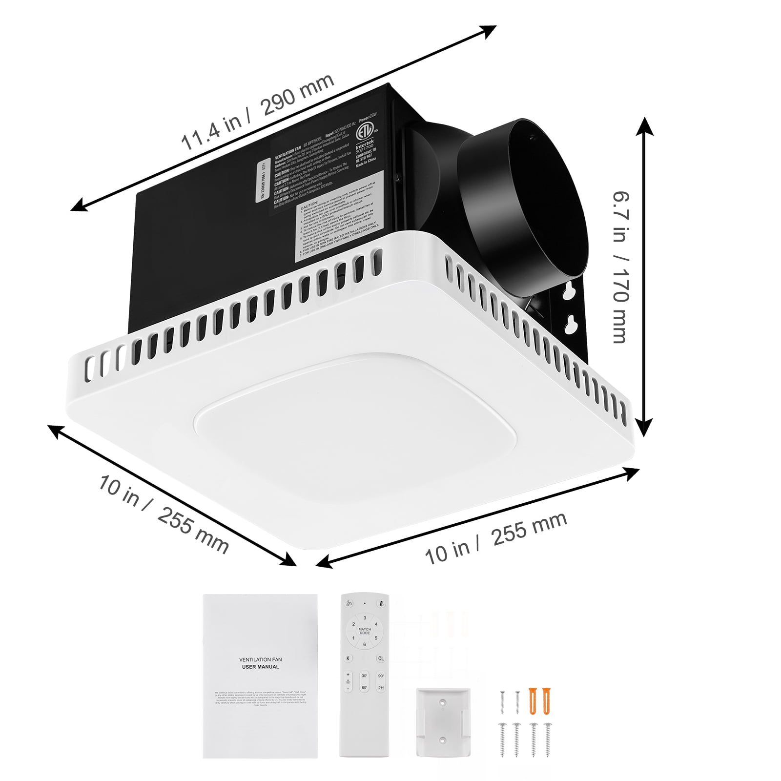 LED Lighting and Ventilation in One: Our exhaust fan combines LED lighting and ventilation for versatile use. The soft, glare-free LED light provides 900LM with adjustable color temperatures (3000K/4000K/5000K) to suit your needs, offering ideal lighting for tasks like shaving, makeup, or various scenarios. Quiet Operation: Designed with a silent airflow pathway and a lightweight PPFR plastic impeller to minimize air resistance and noise. The high-quality motor ensures stable performance with noise levels ≤33 decibels (1.5 sones), ensuring a peaceful indoor condiyion. 110 CFM Adjustable Airflow: Featuring a high-quality motor with excellent speed and a max. airflow of 110 CFM, this exhaust fan is suitable for spaces up to 110 sq. ft. It offers six adjustable fan speeds. Additionally, it supports flexible timer settings (0.5h, 1h, 1.5h, 2h) for energy savings. Easy Installation: Our exhaust fan features a cut-free design and ceiling-mounted ventilation, making installation hassle-free. No need for attic access, and the ceiling cutout dimensions are 7.68 x 7.6 in (195 x 193 mm). You can install it directly by following our provided installation instructions for a quick setup. Moisture and Corrosion Resistance: Designed to withstand prolonged exposure to high-humidity conditions, our exhaust fan features a galvanized steel housing with exceptional moisture and corrosion resistance. You can trust it to perform reliably, even in humid conditions.