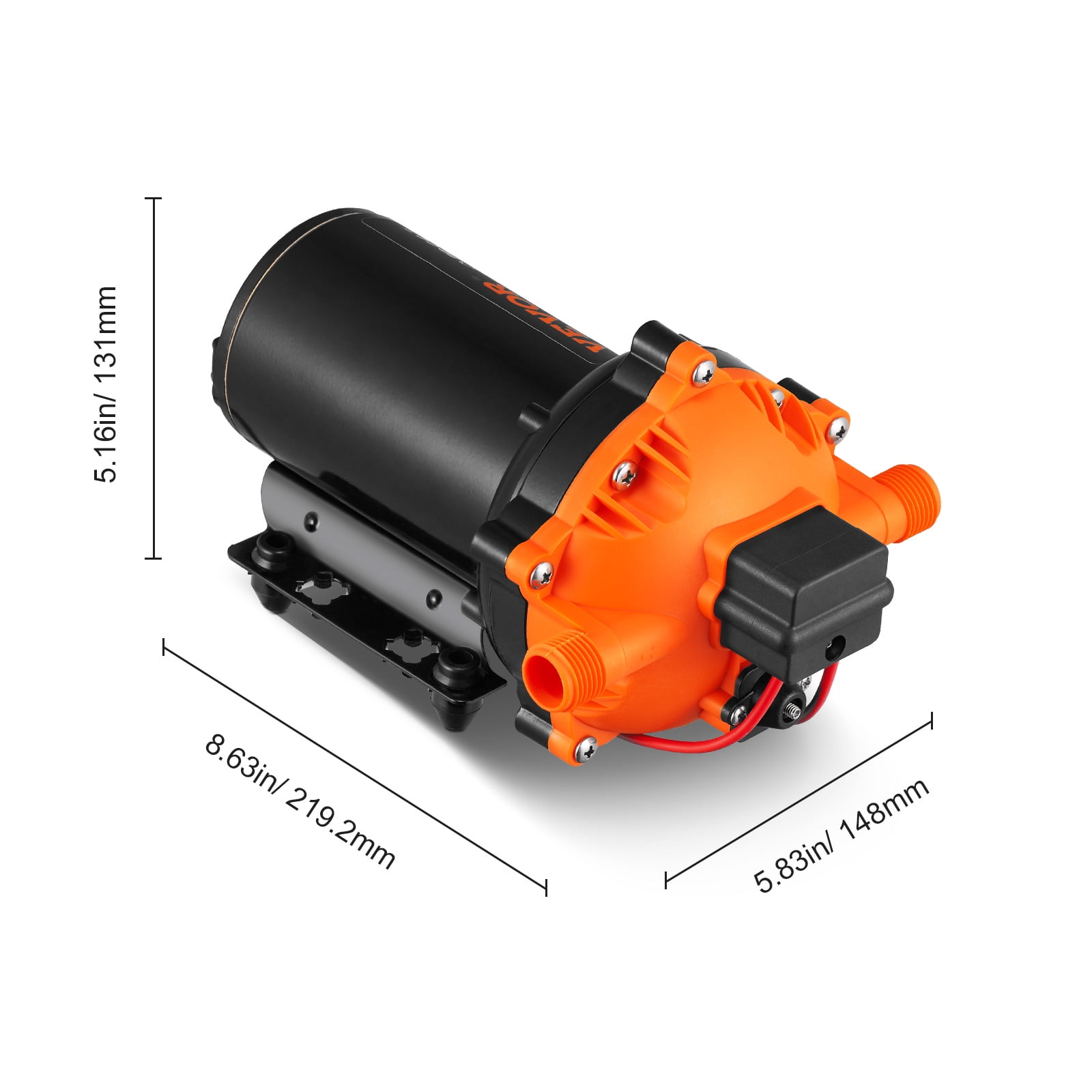 - Time to Get Pumped: With an open flow rate of 5.5 GPM and the ability to self-prime up to 6 feet, this 12V diaphragm pump is a true powerhouse that can meet all your water needs. Plus, with its stable 17A motor, you can be sure it will deliver consistent water pressure when you need it most. Don’t settle for less when it comes to your water!