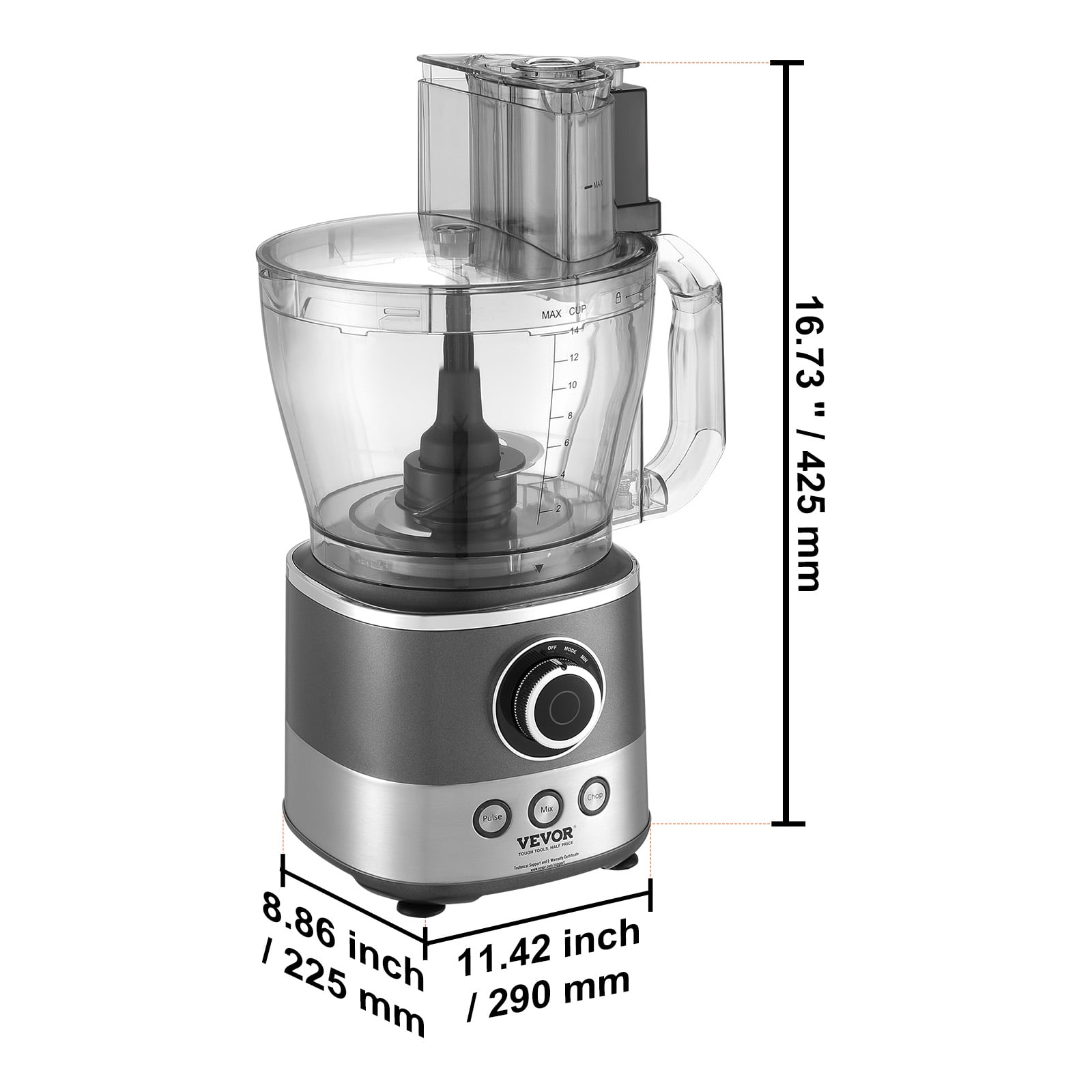 Product Description Home Food Processor for Chopping Slicing Kneading The multifunctional food processor is equipped with series of blades to meet your different needs. It allows for various operations like chopping, shredding, and slicing of different meats, vegetables, and fruits, as well as kneading dough and making milkshakes. Home Food Processor The food processor has a large capacity, easily meeting the needs of a big family. The machine features multiple-speed adjustments and an electric pulse function, enabling quick chopping, slicing, mixing, and crushing of the ingredients placed in the bowl. Multi-functional Blades The reversible slicing/shredding disc is excellent for slicing cucumbers, apples, mushrooms, carrots, potatoes, cabbage, and hard cheeses. 3 Types of Feed Chute Design The enlarged feed chute design can accommodate whole potatoes and tomatoes; the medium-sized one can hold carrots, and the smaller one can fit stick-shaped vegetables. Electronic Control Panel Smooth adjustment from the lowest to the highest speed setting, multiple-speed choices, and ambient light indicators clearly display the current working status. Safety Design The double-locking mechanism prevents the machine from operating unless both locks are secured, significantly ensuring your and your family’s safety. Safe and Durable The core components and motor are enhanced with a reset thermostat and overload protection to prevent burnout, thus safeguarding the machine to a certain extent and enhancing its durability. Specifications Item Model Number: CY-329B Voltage: AC120V Frequency: 60Hz Power: 650W Bowl Capacity: 14 CUP / 3 L Material: ABS/PP Item Size: 290 x 225 x 425 mm/ 11.42 x 8.86 x 16.73 in Weight: 3.84 kg / 8.47 lbs Package Content 1 x Food Processor 1 x Meat Grinding Blade 1 x Dough Blade 1 x Scraper Blade 3 x Stainless Steel Blade Discs 1 x Milkshake Blade