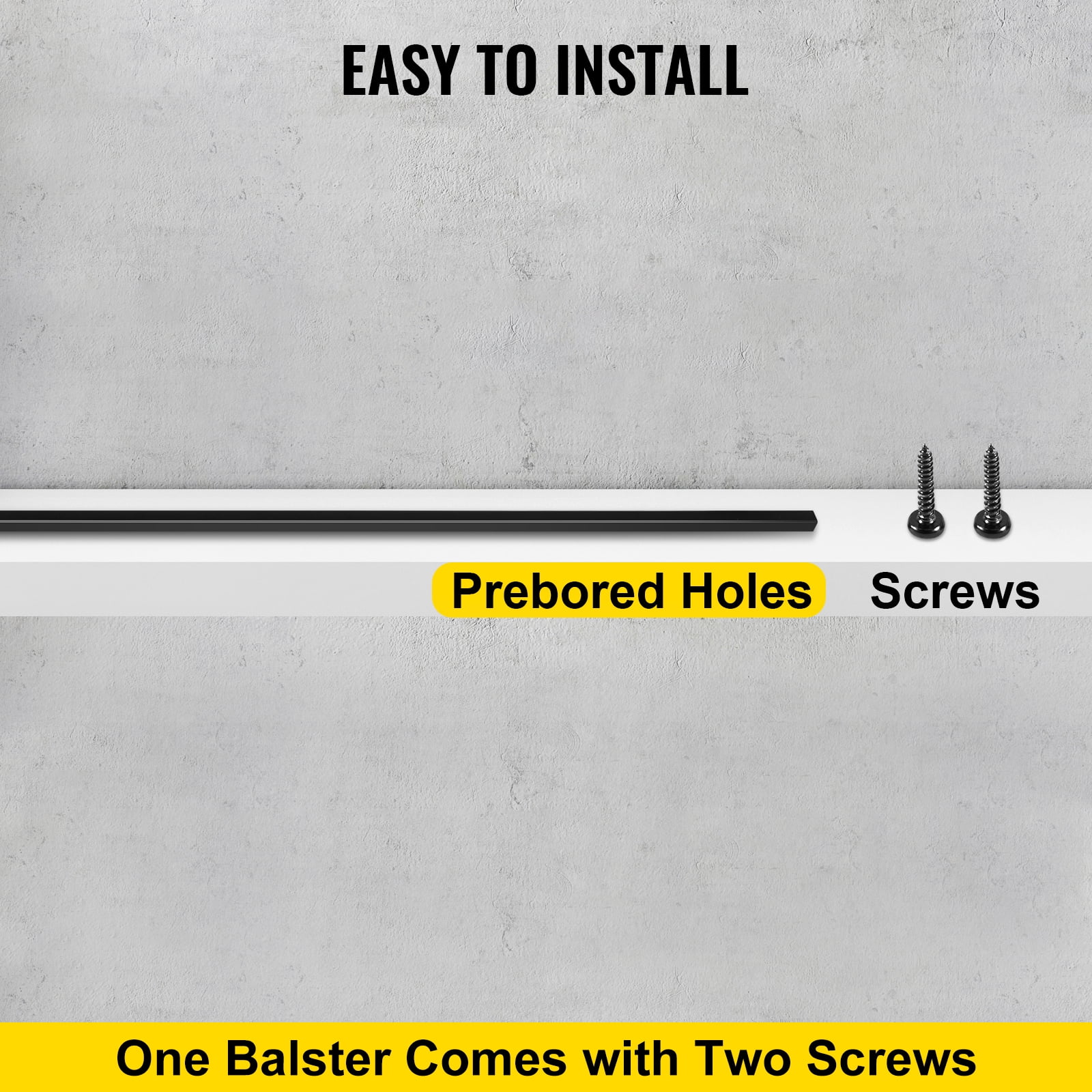 Product Description 16 PCS Deck Baluster These metal deck balusters are a great choice to update your deck or stair. Black powder-coated iron will last through the years, even exposure outdoor environment. Thanks to the pre-drilled holes and screws, they are easy to install. You can enjoy your secure and beautiful deck with our railing balusters. Specifications Material: Iron Product Size: 44″ x 0.5″/111.8 x 1.3 cm Baluster Quantity: 16 Screws Quantity: 32 Color: Black Package Content 16 x Deck Baluster 32 x Screws