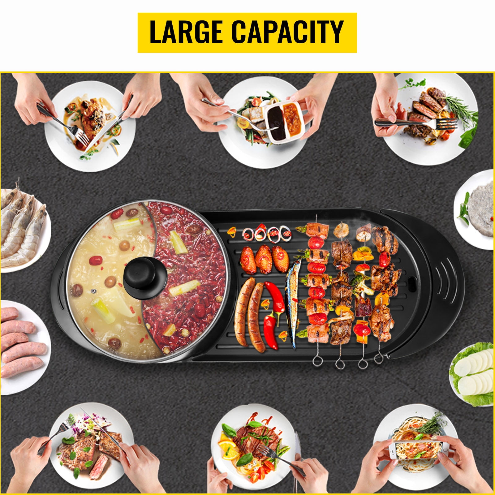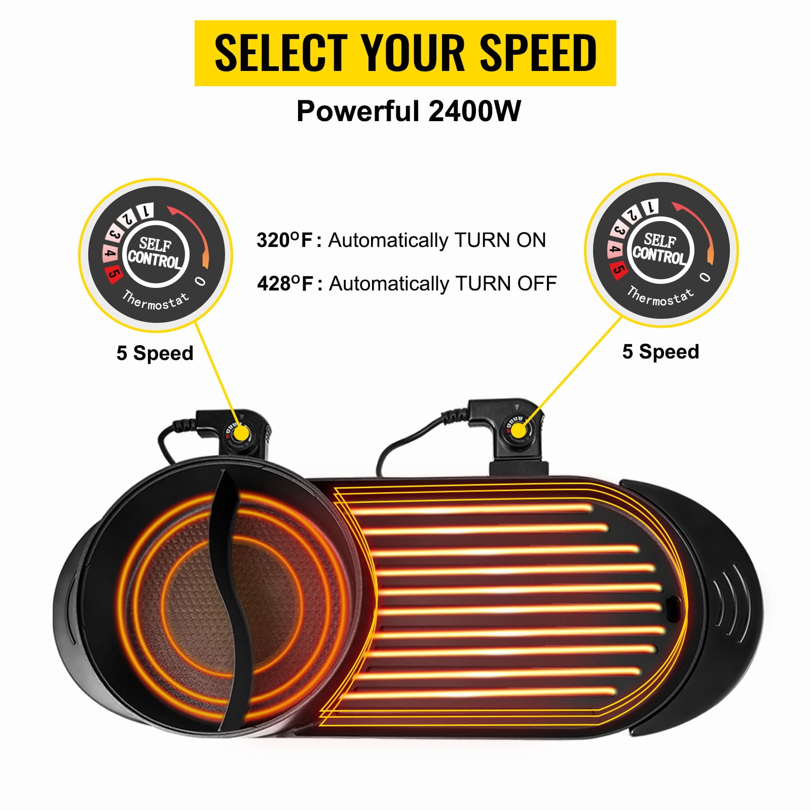 Brand Introduction VEVOR is a leading brand that specializes in equipment and tools. Along with thousands of motivated employees,VEVOR is dedicated to providing our customers with tough equipment & tools at incredibly low prices. Today, VEVOR has occupied markets of more than 200 countries with 10 million plus global members. Why Choose VEVOR? 1.Tough Quality Assurance 2.Incredibly Low Prices 3.Fast & Secure Delivery 4.30-Day Free Returns 5.24/7 Professional Customer Service Product Description BBQ Pan Grill Hot Pot The 2-in-1 Indoor Grill is the hero of home cooking. Grill sizzling steaks, delicious hot pot, or sear vegetable can be finished in one compact countertop appliance. Bring outdoor flavors inside with its ridged grill surface that achieves excellent grilled flavor and beautiful grill marks with ease. The deep cooking pot with a tempered glass lid allows for simmering delicious pot roasts, chili, fondues, soups, and more. Then, with just a turn of the knob, feast on the versatile and durable grill hot pot. Multifunctional Kitchen Utensil This innovative design allows you and your friends to enjoy Korean barbecue while having a hotpot, bringing diversity to your table at a party. At the same time, with this 2 in 1 grill and hot pot, you and your family can enjoy delicious meals of various kinds of food, like steaks, shrimps, burgers, veggies. Quality Construction Non-stick coating, thickened aluminum, durable tempered glass, stainless steel bottom, and insulated handle design offers a smokeless superior product use experience. The high-quality material can extend the service life. So you can enjoy the hotpot and BBQ with comfort. Select Your Speed Hot pot and bbq grill have independent temperature control so that you can use the barbecue and hot pot areas separately. With a 5-speed temperature adjustment, it is easy to reduce or increase the heat according to your different needs. For example, when the temperature is up to 428℉, it will auto shut off, and when the temperature is lower than 320℉, it will auto turn on. 2200W High Efficiency Equipped with 2200W power, this electric stove indoor hot pot is powerful and practical. Fast and even heating technology enables you to enjoy food in a short time. The biggest power for a hot pot is 1200W, and the grill is 1000W. Large Capacity Product dimension: 26.4 x 11 x 6.7 inches; this pot hot and grill provide an enormous capacity to put various foods and enable 2~8 people to enjoy together. Oil Leakage Port Automatic oil leakage design, the frying pan oil is automatically dropped to the bottom, which will reduce the smoke and making it effortless to clean. Specifications Model: PC-8002 Material: Aluminum + Stainless Steel + Tempered Glass Speed: 5 Speeds Power: 2200W Temperature Range: 320℉-428℉/ 160℃-220℃ Item Dimension: 26.4 x 11 x 6.7 inch/ 67 x 28 x 17 cm Weight: 8.8 lbs/ 4 kg Voltage: 110V