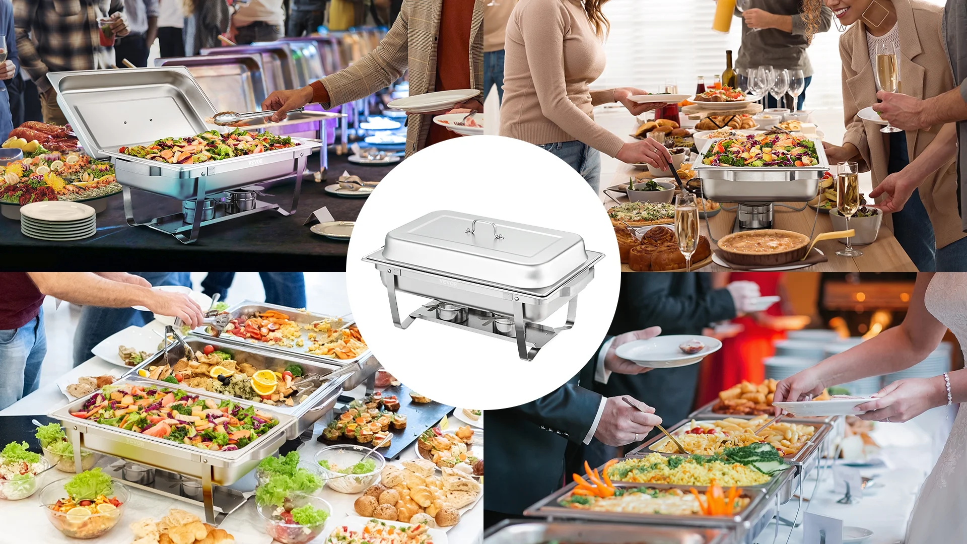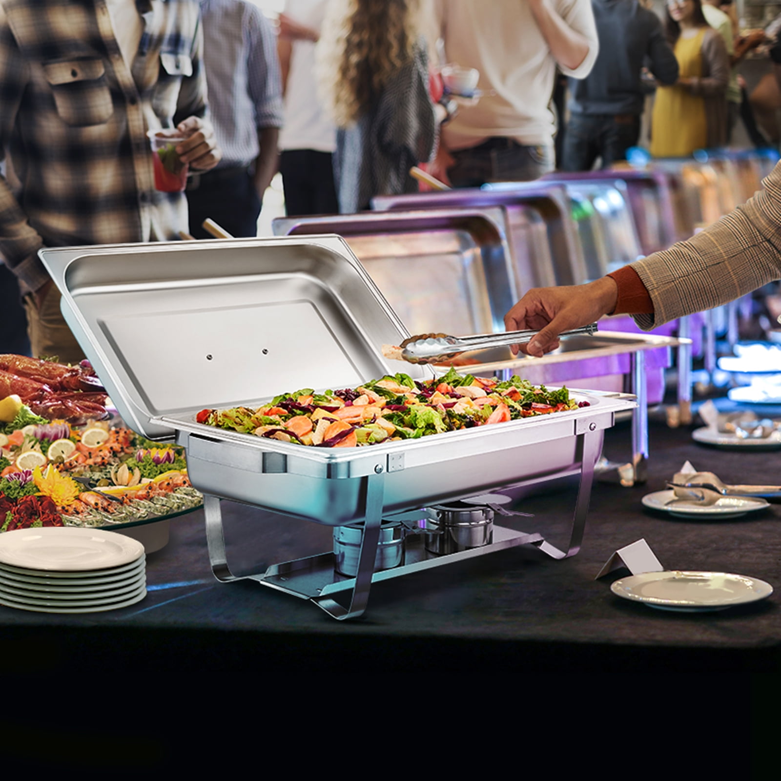 Product Description 8 Qt Commercial Chafing Dish Set Get ready to keep all your delicious foods fresh and ready to serve. 8 Qt catering food warmer set is not only suitable for commercial use, but also for family use. The warming trays for buffet parties can hold many kinds of dishes. The buffet servers and warmers are great for a buffet, hotel breakfast area, brunch, catering event, family gathering, banquet, wedding, self-service, etc. With enough room to serve all your guests, you will be the talk of the room! Lid Handle For Easily picking up the lid without scald. Keep Food Warm and Ready Fuel holders with pans can heat water under pans, maintaining a temperature that ensures guests can taste delicious warm food. Foldable Frame The stainless steel frame provides pans with great and practical support. The stackable design saves up to 50% space, so it won’t take much place for storage, and you can take it anywhere. Large Space to Serve Included 4 x 4Qt half food pans and 2 x 8Qt full food pans. Two kinds of food pans meet your different needs. Can serve at least 8 people (single). Food Grade Material Features 201 stainless steel, with a mirror finish for a unique look, this chafing dishes for buffet is rust-resistant and easy to clean. Use it to create a beautiful buffet setting. Specifications Model: DT-C1012 Quantity: 2 Material: Food-Grade 201 Stainless Steel Full-Size Pan Quantity: 2 Full-Size Pan Capacity: 8 Qt / 7.5 L Each Half-Size Pan Quantity: 4 Half-Size Pan Capacity: 4 Qt / 3.5 L Each Water Pan Volume: Max. 4 L; Min. 2 L Can Serve: at Least 8 People (Single) Heating Method: Fuel Food Pan Size: 21×12.8×2.6 in / 53×32.5×6.5 cm Product Size: 23.6×13.8×12.6 in / 60x35x32 cm Product Weight: 19.5 lbs / 8.84 kg Package Content 2 x Rectangle Chafing Dishes 4 x Fuel Holders 2 x Full-Size Pans 4 x Half-Size Pans 2 x Water Pans 2 x Fuel Trays 2 x Frames 1 x Meal Clip 1 x User Manual