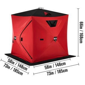 – Spacious Space: Unfold size: 73 x 73 x 66 inch/ 185 x 185 x 168 cm. Interior size: 58 x 58 x 66 inch/ 148 x 148 x 168 cm. Ice fishing tent, with ample room & 23.7 square feet of fishable area, is large enough to accommodate 2 people and approve convenience movement. Have a nice fishing or camping trip with your family and friends.