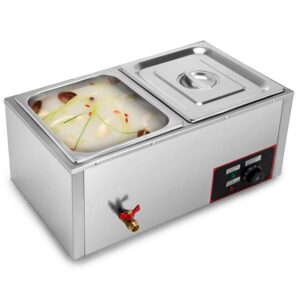 Restaurant food warmer, including 2 pans and lids, is made of thickened food-grade stainless steel, durable, anti-squeezing and easy-cleaning. Constant temperature control (30-85 ) keeps dishes warm as you wish. The catering food warmers are widely used to keep dishes warm, heat up milk and steamed buns, and melt chocolate.